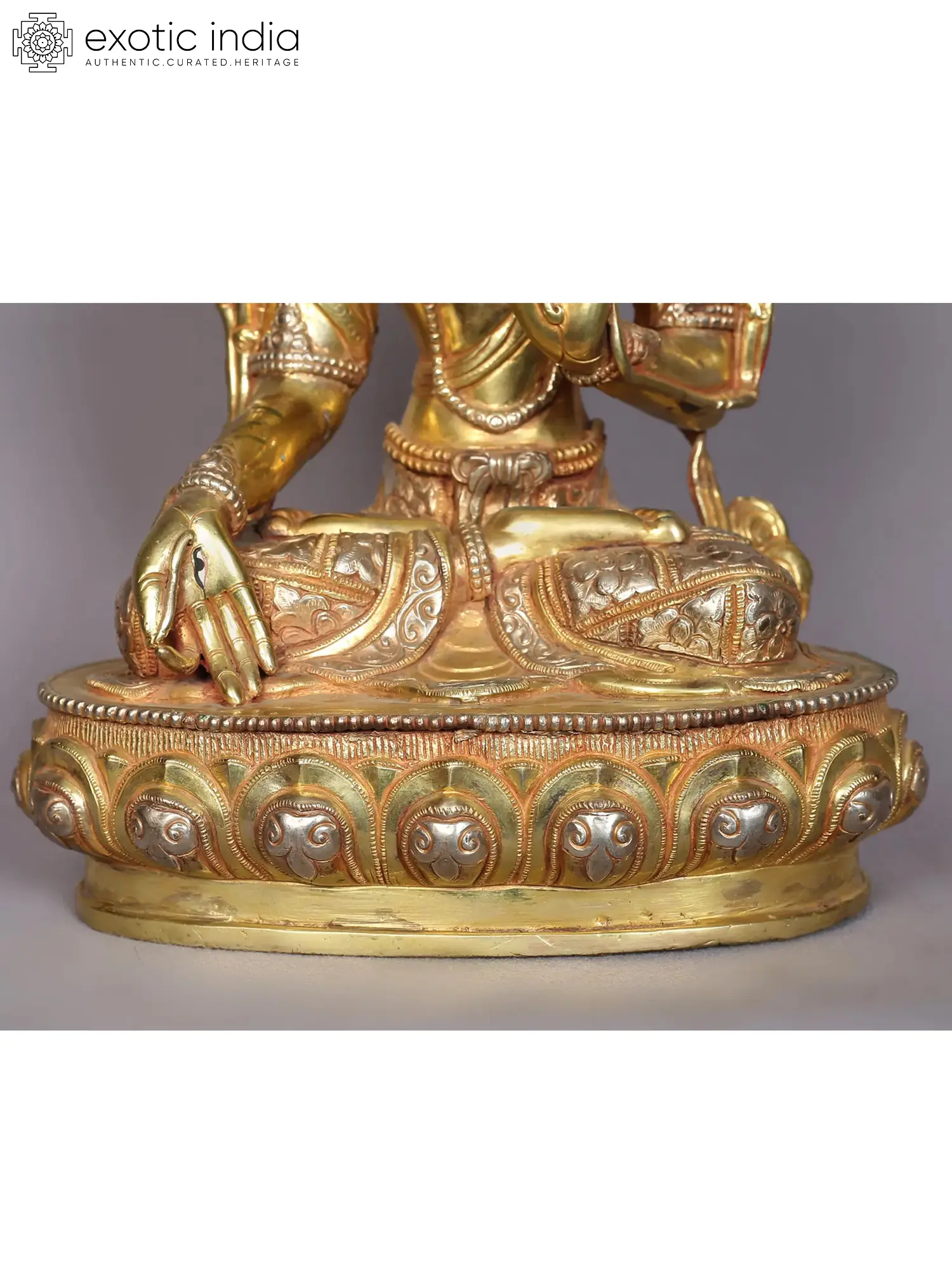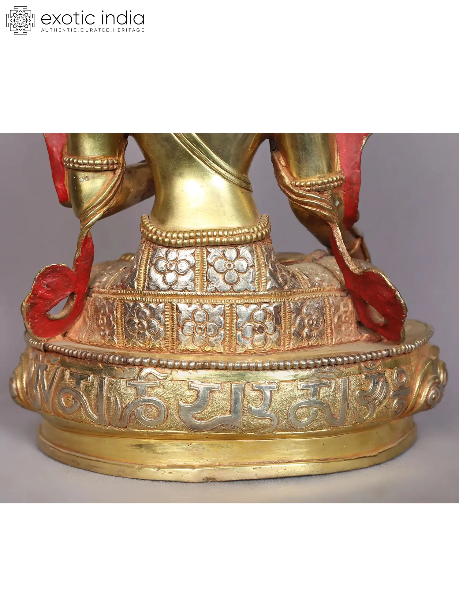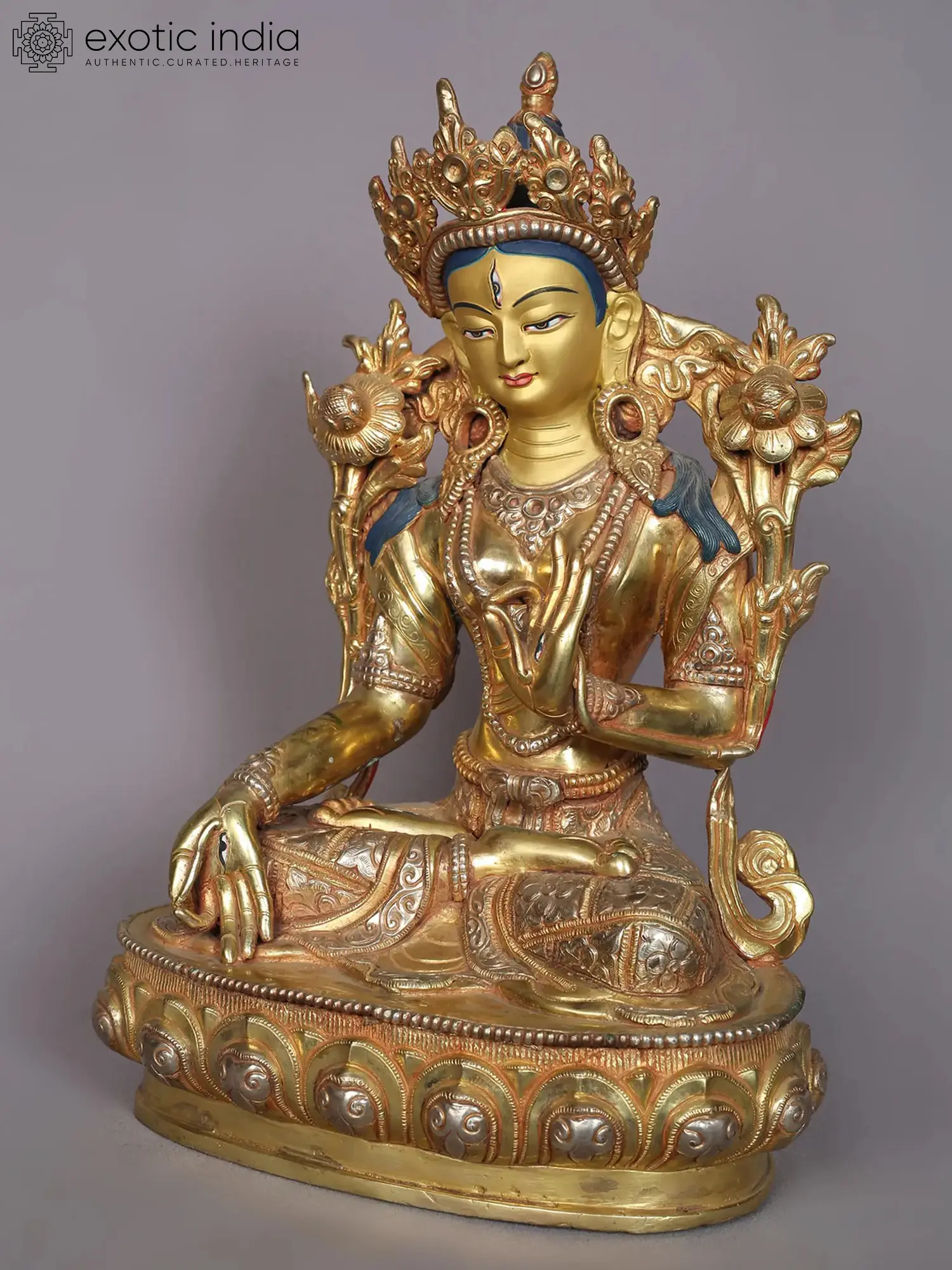 White Tara, a beloved figure in Tibetan Buddhism, is beautifully depicted in this 12" statue. The mantra stated above is associated with White Tara, a beloved figure in Tibetan Buddhism that helps invoke her blessings for long life, wisdom, and abundance. White Tara represents compassion, healing, and spiritual nourishment. The statue's delicate craftsmanship showcases her serene countenance, adorned with seven eyes, two on the face, one on the forehead, and one each on the hands that symbolizes her ability to perceive suffering in all realms. The lotus blossom in her hand signifies purity and spiritual enlightenment. This sacred representation of White Tara inspires devotees on their path to liberation.