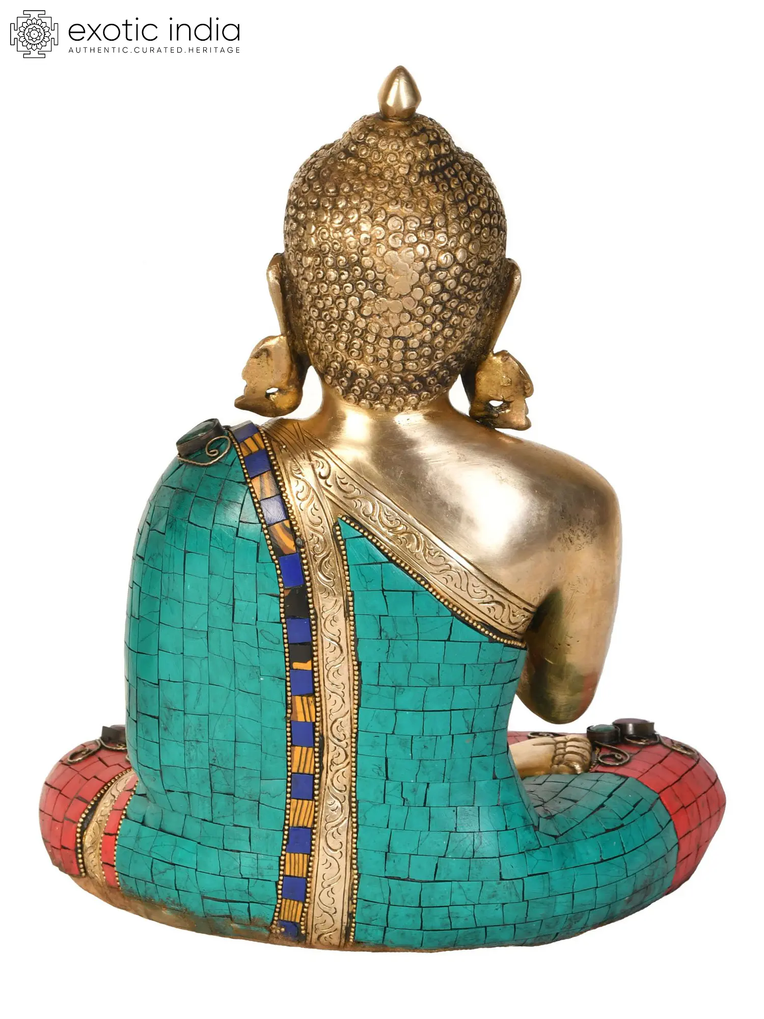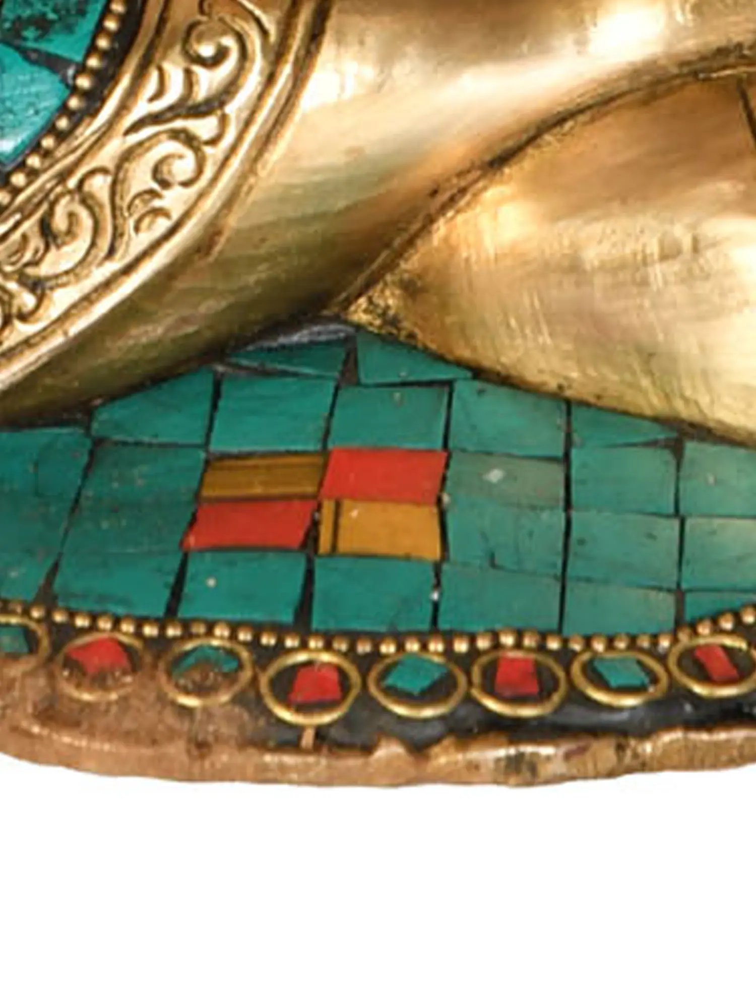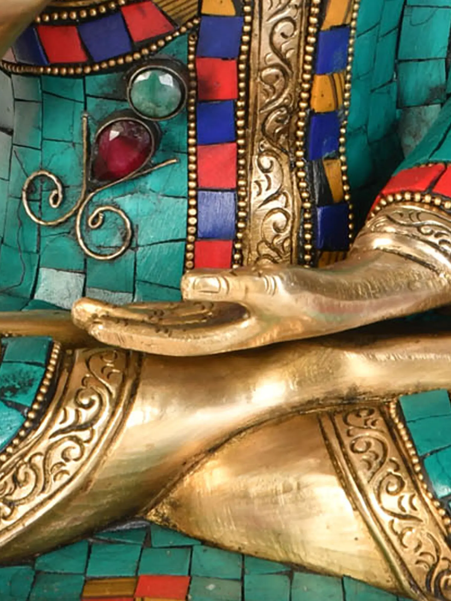 Crafted from brass with exquisite inlay work, this statue is a testament to the rich artistic heritage of India. The vibrant turquoise and deep red tesserae adorning his robe are not merely decorative but symbolically significant. Turquoise, often associated with wisdom, healing, and protection in various cultures, evokes the clarity of the Buddha's teachings. The red, a color of passion and vitality, speaks to the Buddha's immense love for humanity. These stones, meticulously set, create a stunning visual narrative that enhances the spiritual aura of the sculpture. The intricate golden patterns bordering the robe are rendered with precision, reflecting the divine radiance of the Buddha. This piece is a true representation of the "handmade" ethos, where each detail is infused with devotion and skill passed down through generations.