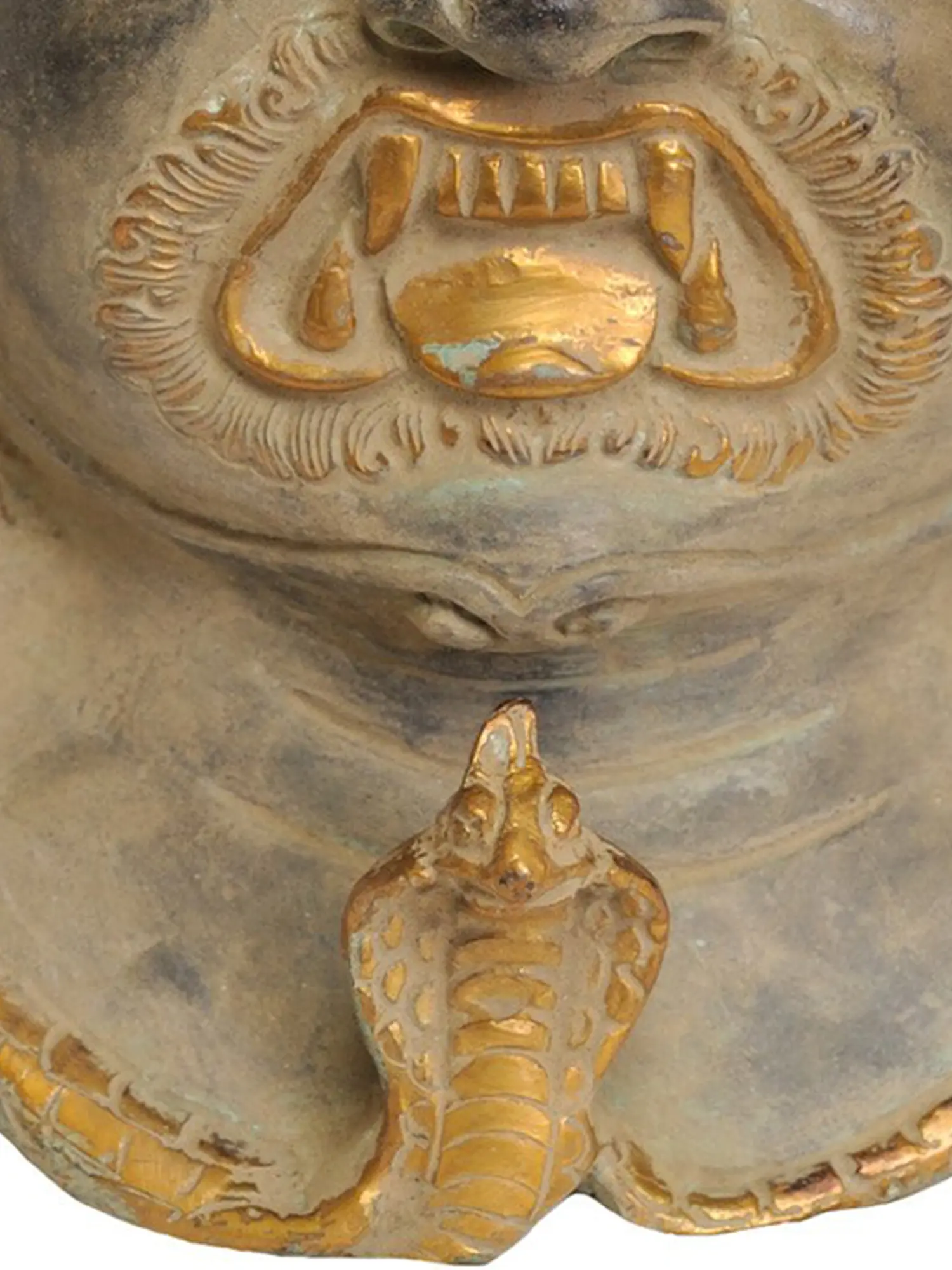 The mask itself is a masterpiece of craftsmanship. The central face, with its wide, staring eyes, bared fangs, and furrowed brow, conveys an intense and unwavering gaze. Flames, symbolizing wisdom that burns away ignorance, erupt around the head, rendered with a dynamic and flowing artistry. Intricate ornamentation adorns the mask, including smaller deity faces, serpents, and auspicious patterns, each element carrying symbolic weight within Buddhist cosmology. The presence of serpents, often associated with primal energy and transformation, further deepens the mask's mystical resonance. The deliberate contrast between the aged brass and the vibrant gold inlay creates a captivating visual dialogue, drawing the viewer into the powerful presence of the deity. This mask is not merely a decorative item; it serves as a potent reminder of the protective forces that guide spiritual journeys. In Tibetan monasteries and homes, such masks are often used in rituals and meditation practices to invoke Mahakala's blessings and ward off negativity. Owning this piece is to welcome a guardian into your space, a tangible connection to ancient spiritual traditions and the enduring quest for inner peace and enlightenment. Its substantial size and intricate details make it a commanding focal point for any sanctuary or meditation room, imbuing the space with an aura of power and protection.