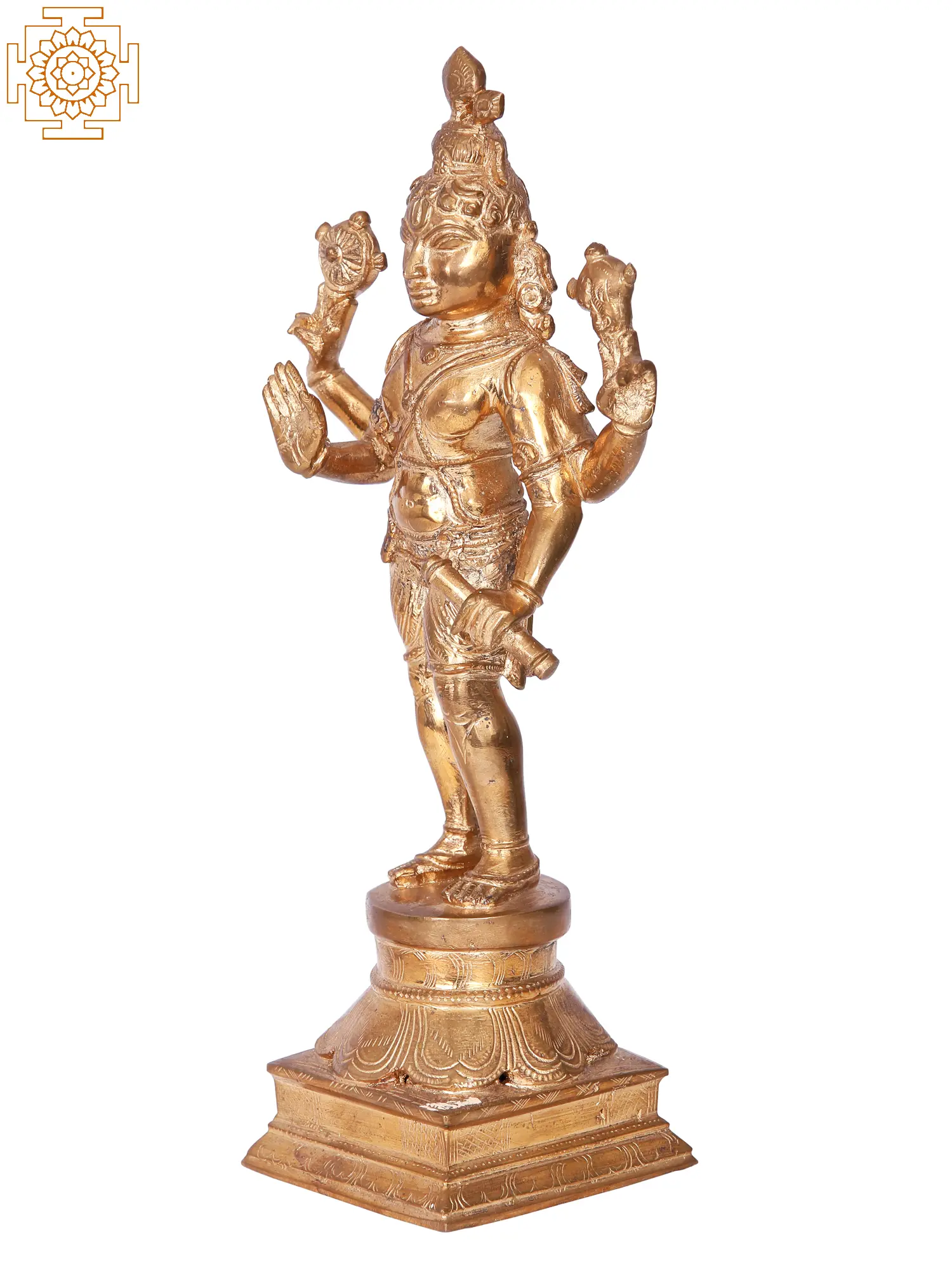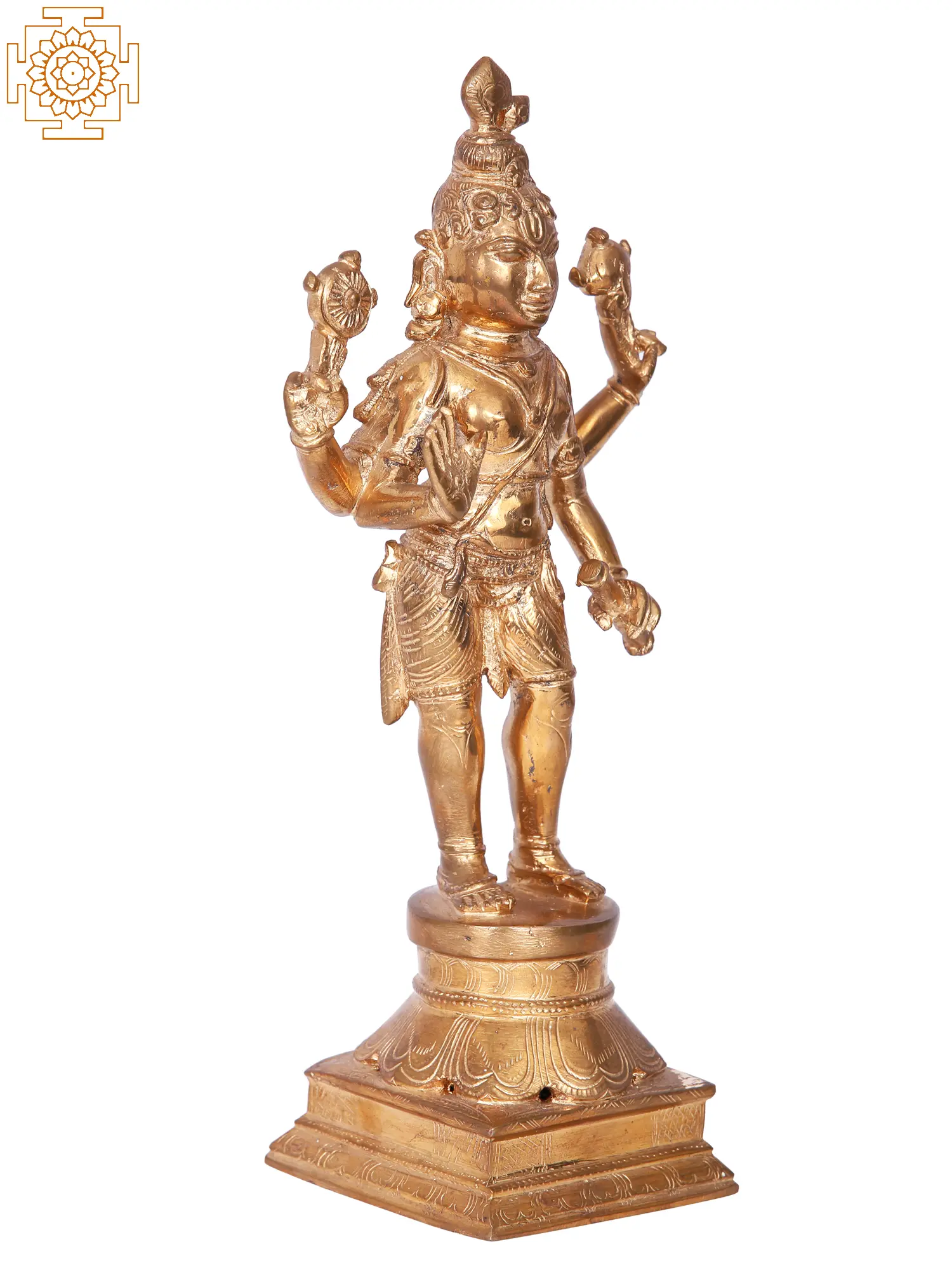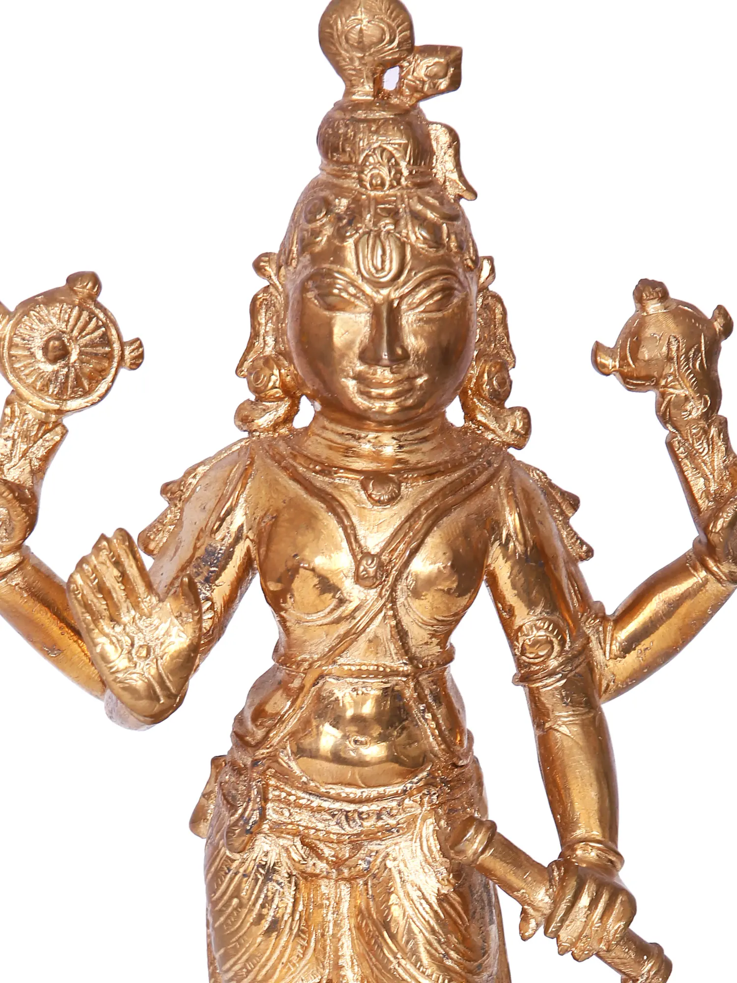 Invite the benevolent presence of Lord Vishnu into your home with this exquisite Panchaloha bronze sculpture, meticulously crafted in the renowned artisan village of Swamimalai. Vishnu, the preserver and protector of the universe in Hindu mythology, is depicted here in a dynamic, standing posture, radiating divine grace and immense power. His serene countenance, adorned with a majestic crown, reflects his role as the supreme deity who maintains cosmic order. The four arms symbolize his omnipresence and his ability to act in all directions, upholding dharma and ensuring the welfare of creation. ––––––––––––––––––––