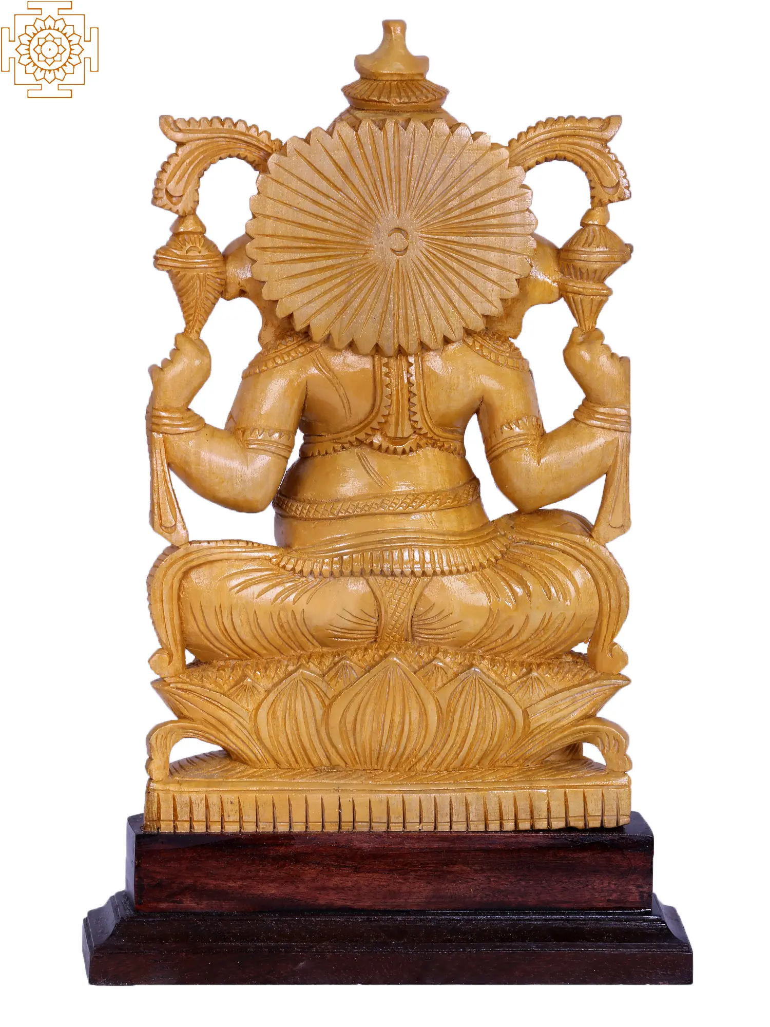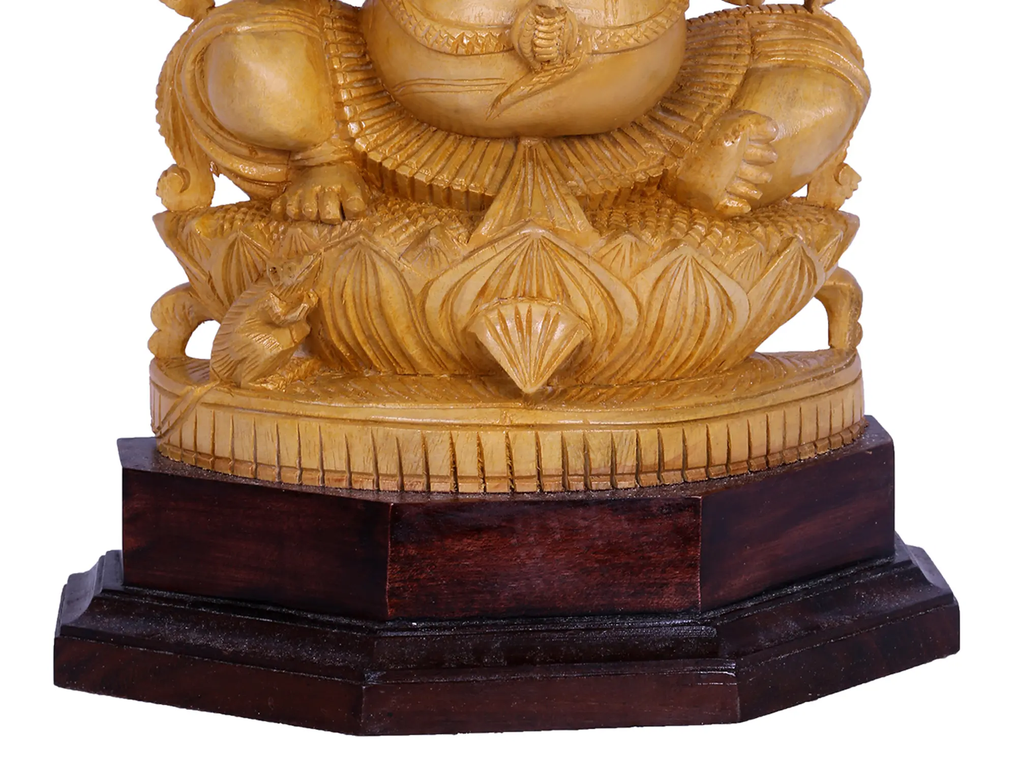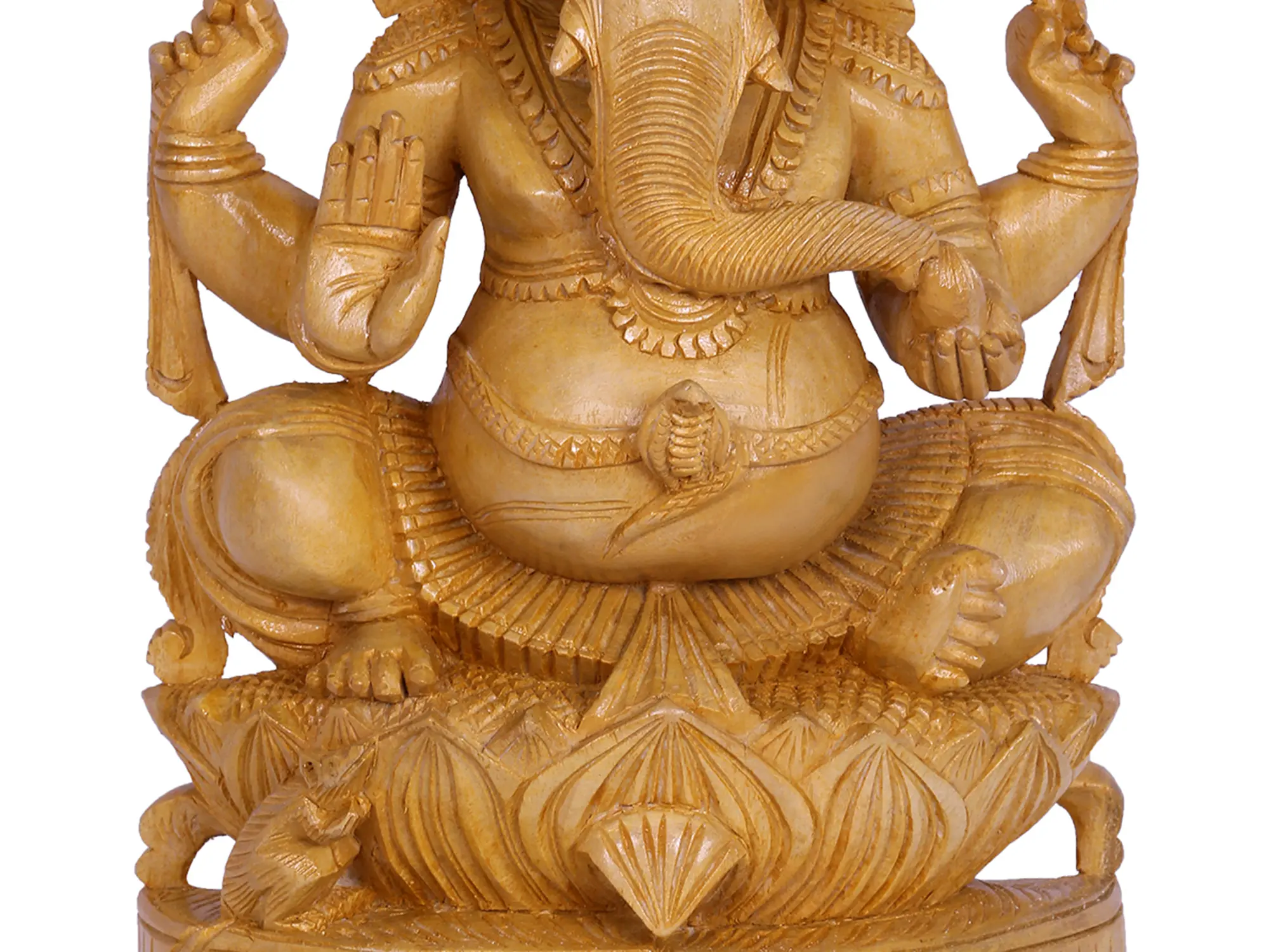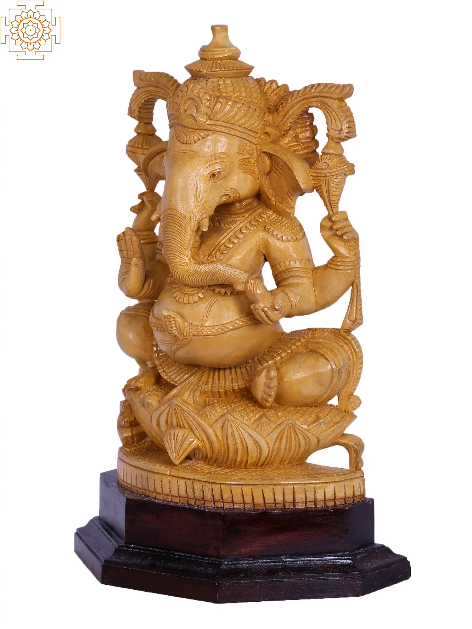 In this divine wooden statue of existence, Ganesha, also known as ‘Bhudividhata’, seated gracefully in Utkatasana, emanates divine splendour. Clad in regal attire, his four hands weave tales of cosmic power. The goad and noose in his upper hands symbolise control over desires and obstacles, while his right hand, poised in ‘Abhaya Mudra’, offers solace. A serpent gracefully coils around his belly, a metaphor for energy’s transformative force. The sweet aroma of Modak dances in the air, a celestial treat embraced by the elephant-headed deity.
