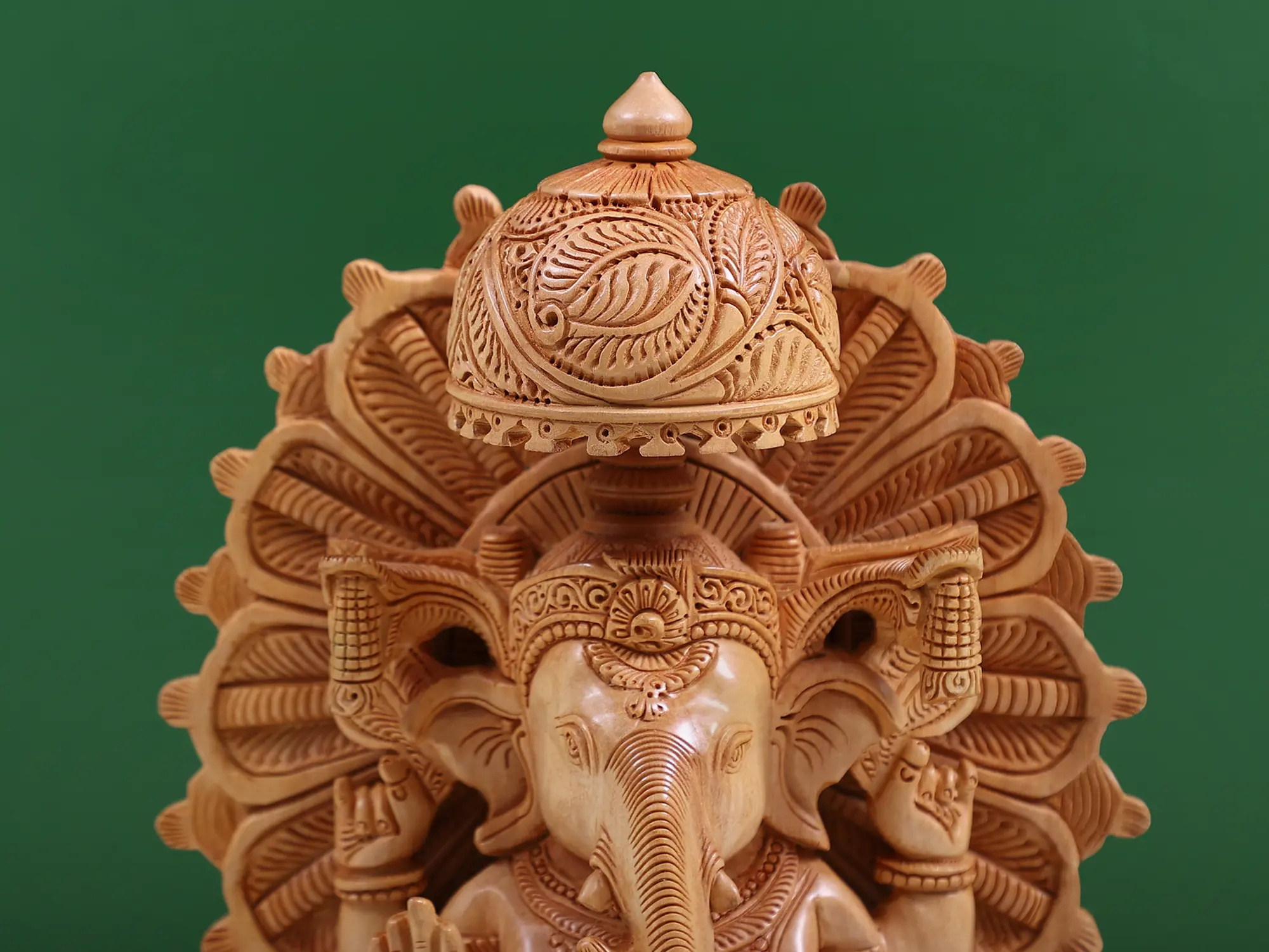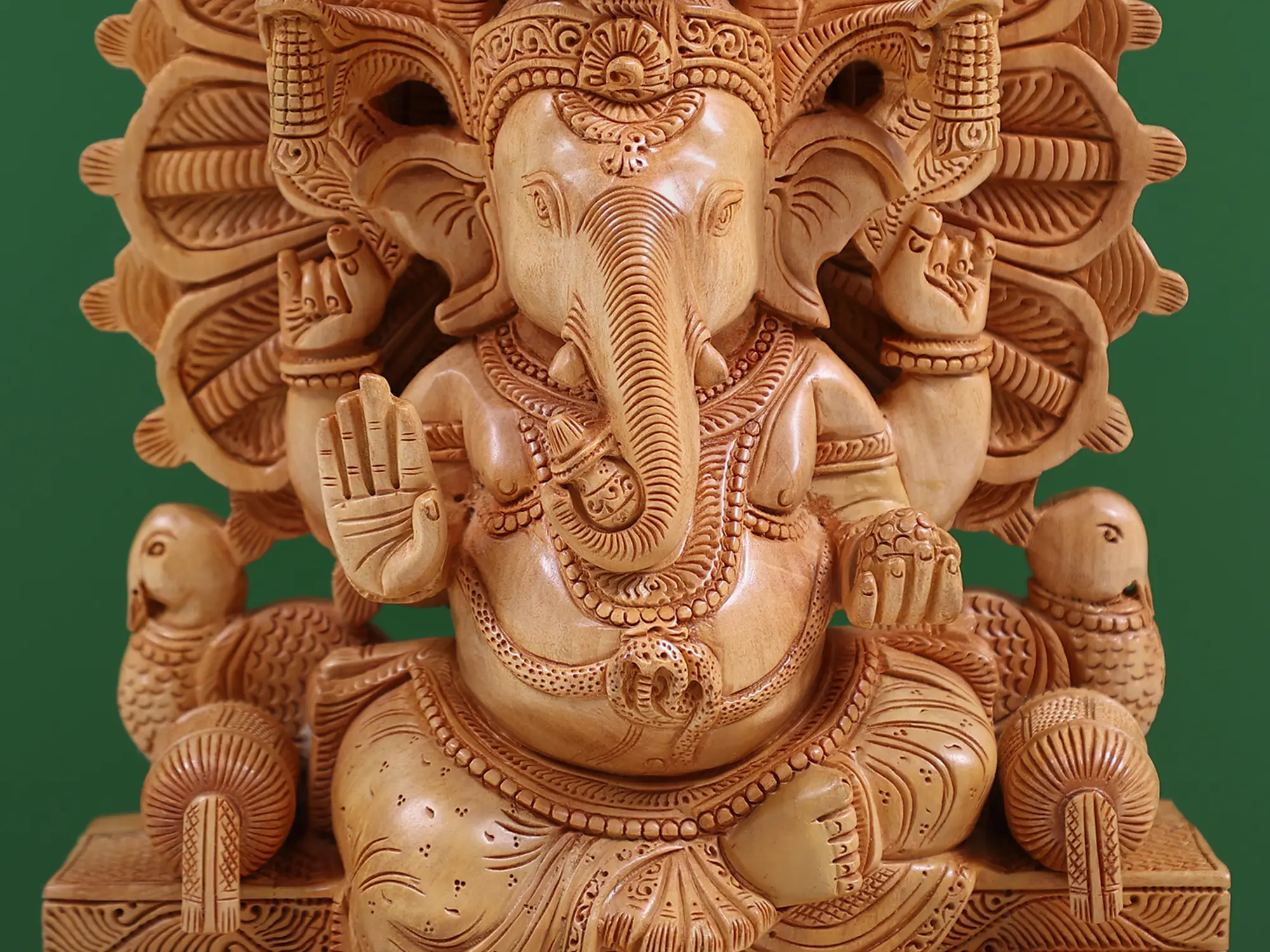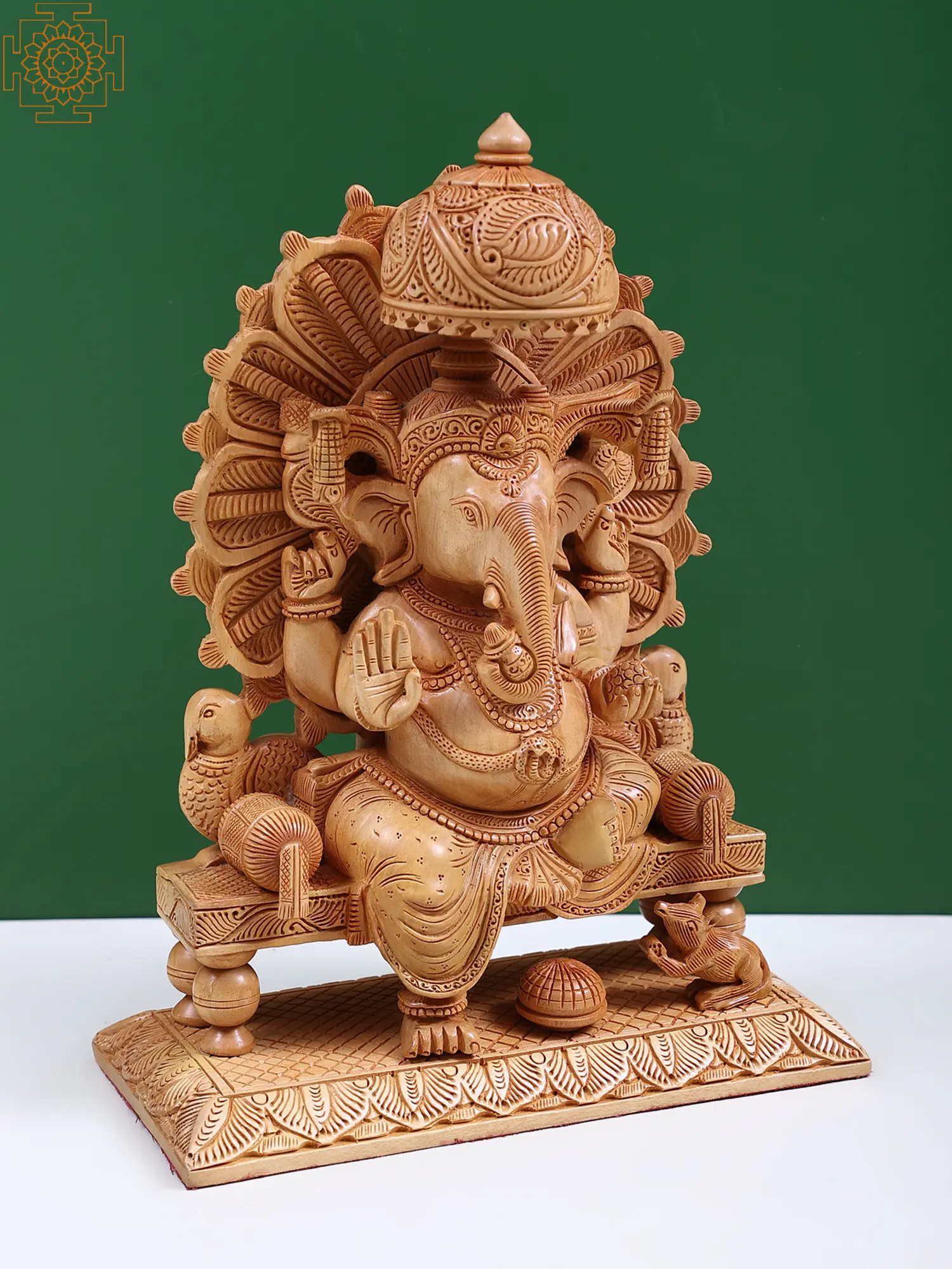 This captivating statue is more than just a decorative item; it is a testament to the rich artistic heritage of wood carving. The detailed ornamentation of the throne, complete with decorative pillars and carved panels, reflects traditional Indian craftsmanship. The presence of small birds flanking the throne adds a touch of nature and tranquility, while the adoring Mushika (mouse), Ganesha's vahana (vehicle), is depicted at his feet, symbolizing his control over desires and the ability to overcome challenges. The elaborate arch behind Ganesha, reminiscent of a peacock's fanned tail, further enhances the divine grandeur. Each element is carefully crafted, creating a harmonious and visually stunning piece that resonates with centuries of spiritual practice and artistic expression. This carving is ideal for placement in your puja room, study, or any space where you seek to invite positive energy and divine guidance.
