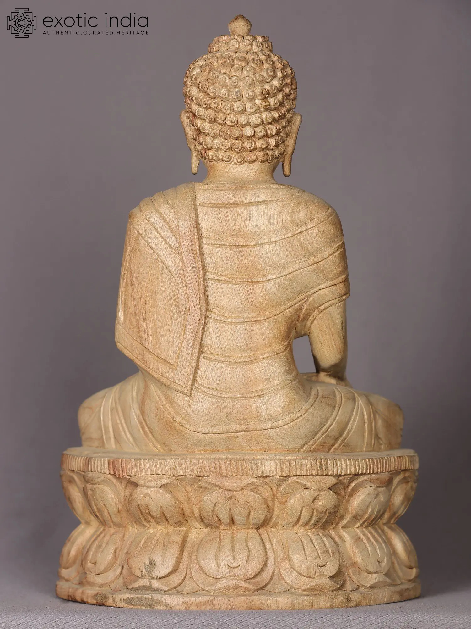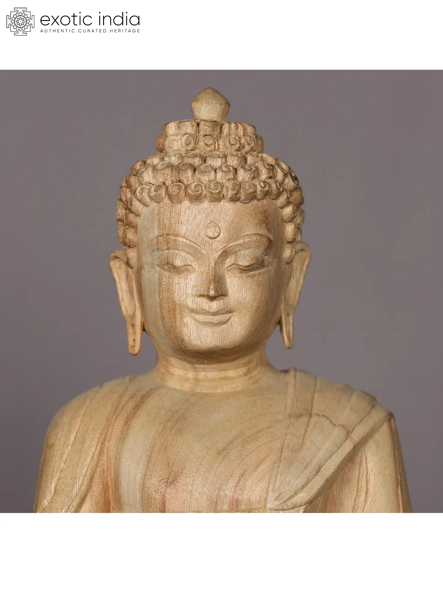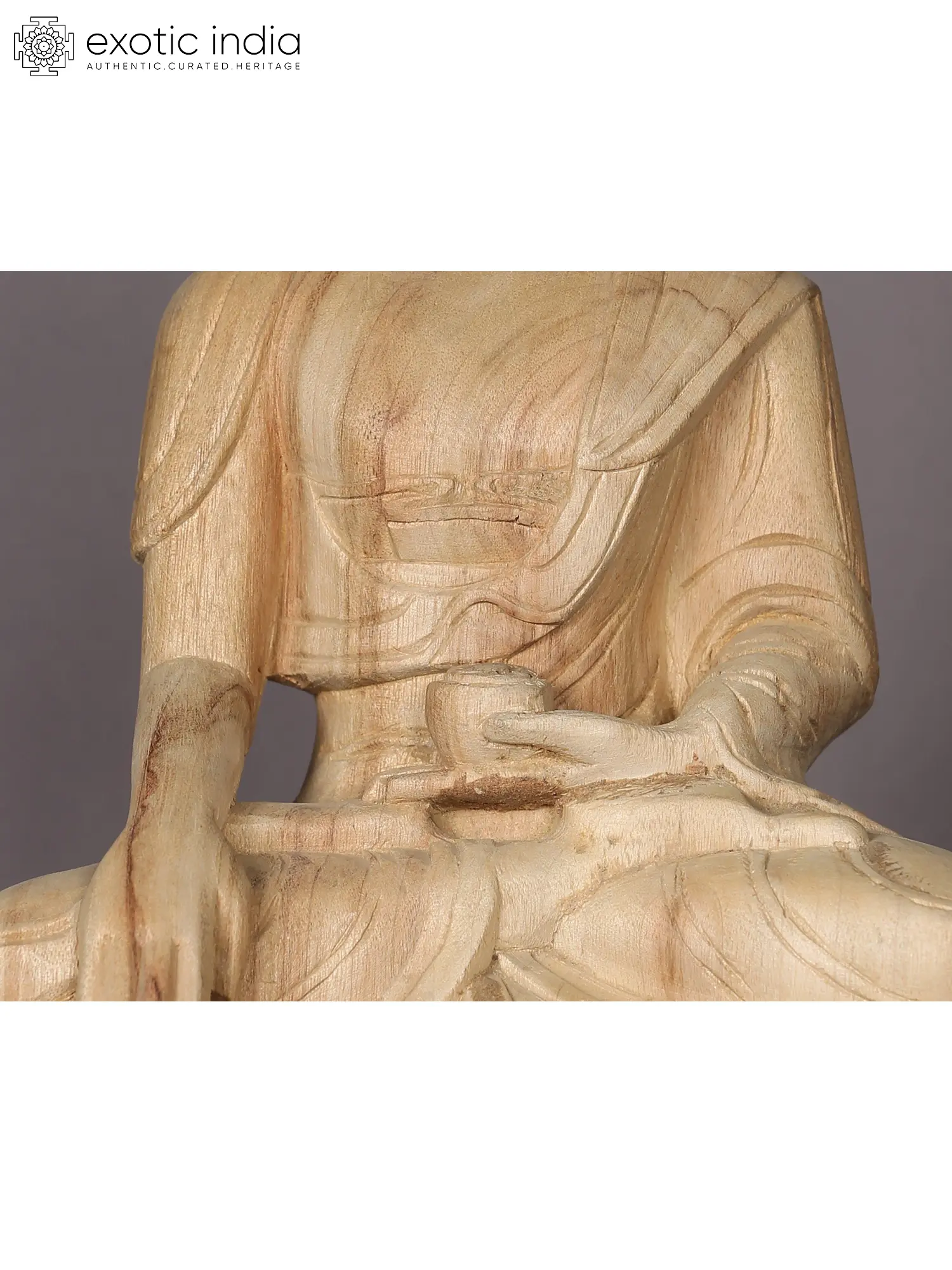 The Wooden Lord Shakyamuni Buddha sculpture intricately captures the essence of enlightenment and compassion. Carved from a single piece of wood, it portrays Buddha in the Dhyana mudra, seated in meditation posture with crossed legs, symbolizing his profound focus and introspection. His right hand touches the Earth, a gesture called the Bhumisparsha mudra, signifying his summoning of the Earth as a witness to his enlightenment. The left-hand rests gently on his lap, holding an alms bowl, symbolizing detachment from material desires. The elongated earlobes represent his princely past, while the ushnisha atop his head signifies wisdom. This wooden embodiment of Shakyamuni encapsulates his transformative journey towards awakening.