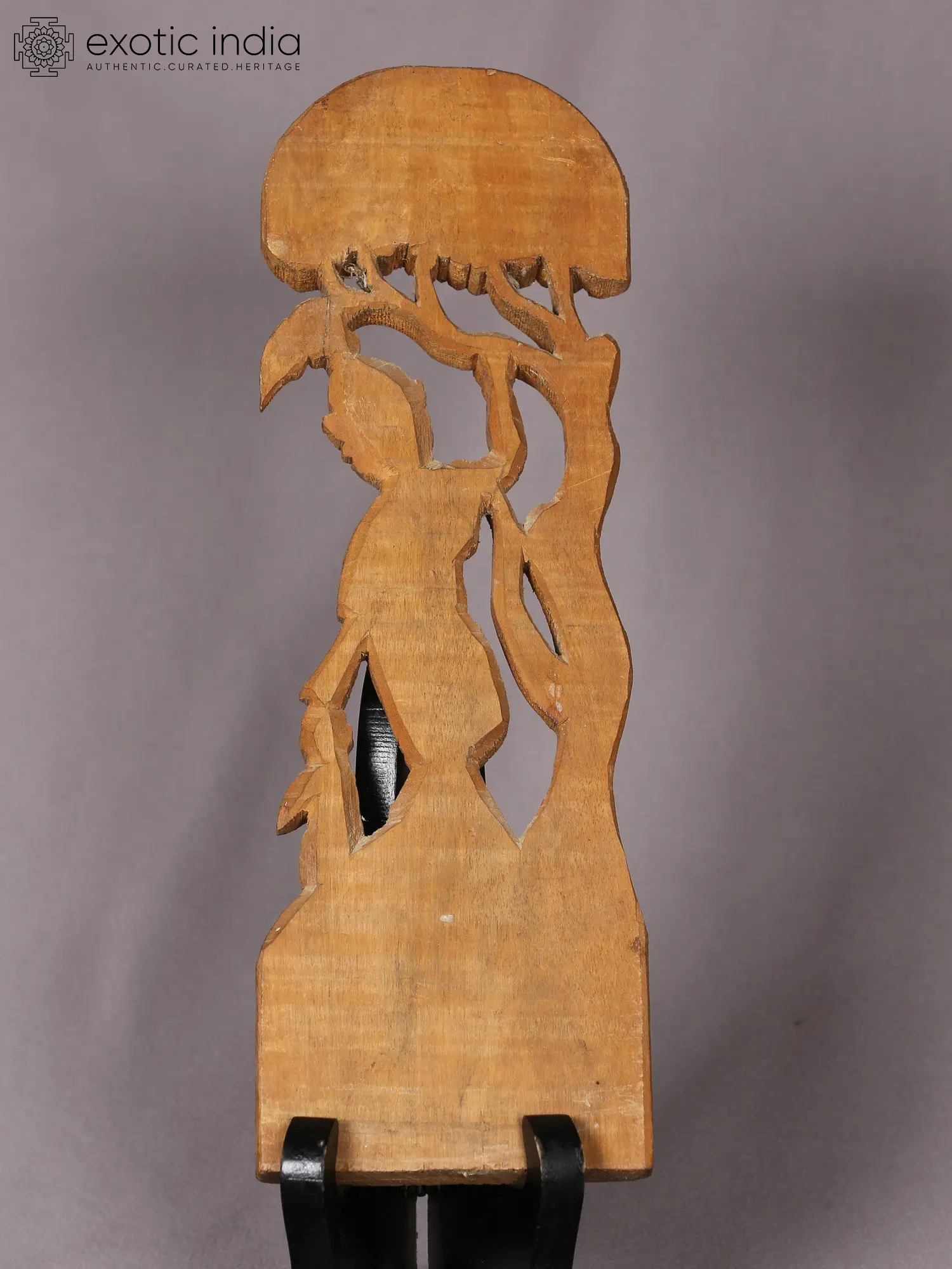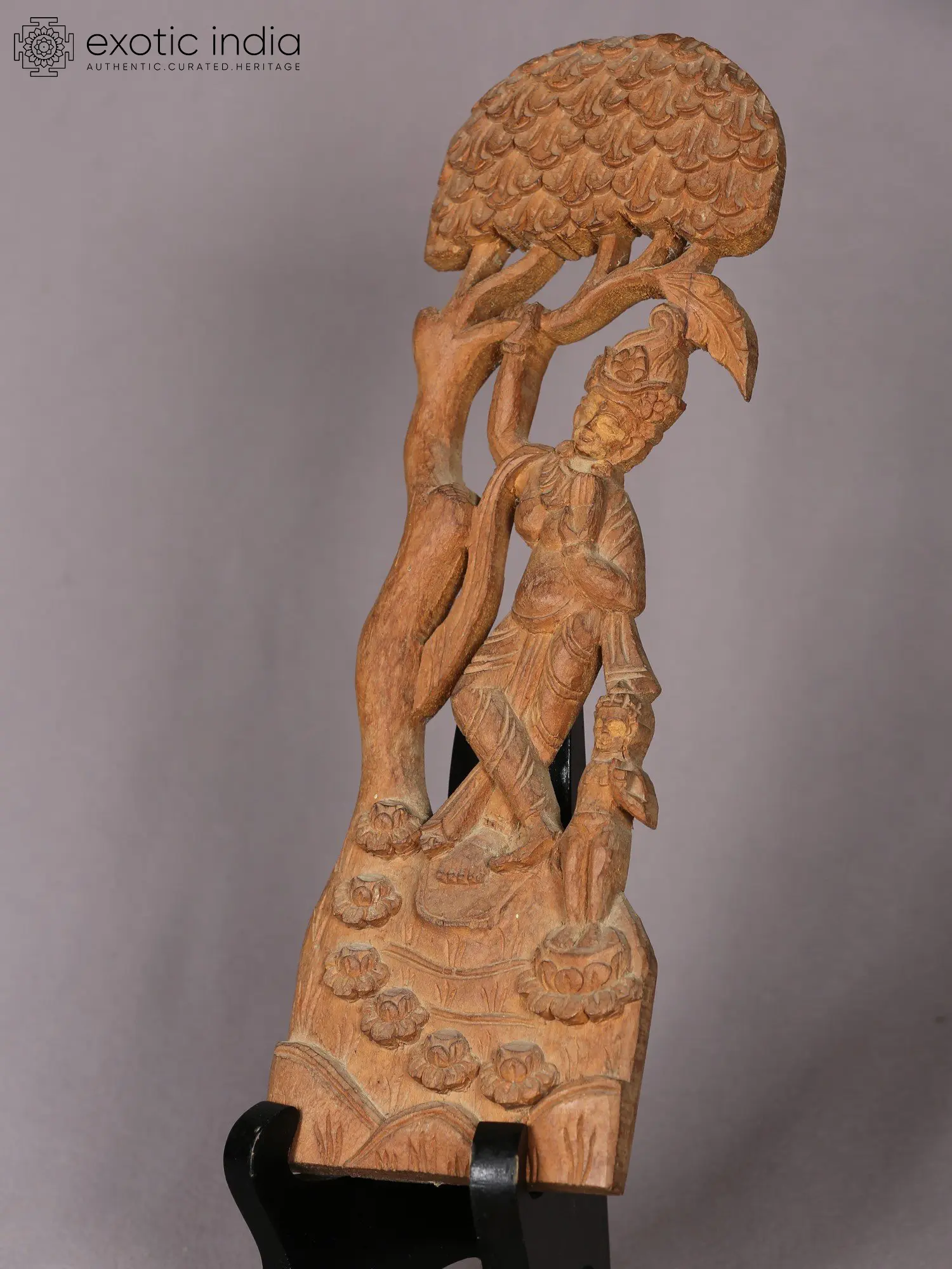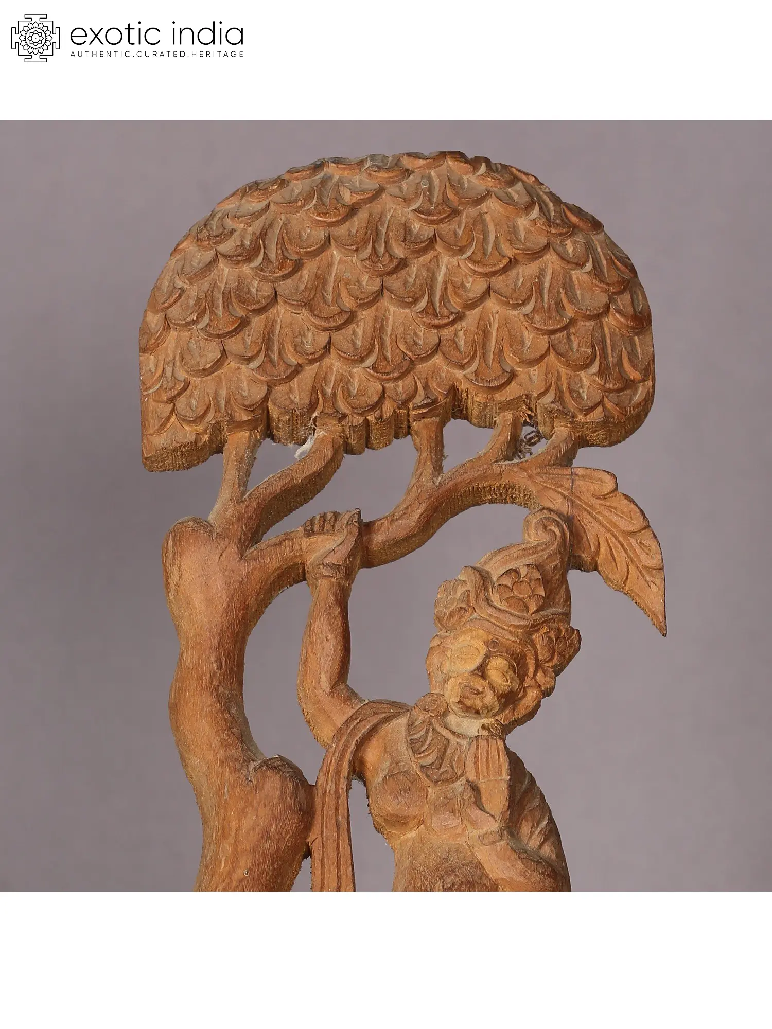 The Wooden Maya Devi sculpture intricately weaves iconography into its depiction. Maya Devi stands gracefully, embodying the maternal aspect of the divine. Her serene countenance reflects inner tranquility. One hand securely grasps a tree branch, symbolizing her connection to nature and the earth's nurturing essence. The other arm cradles her infant, Siddhartha Gautama, who would become the Buddha. This symbolizes the pivotal role of motherhood in fostering spiritual growth. The tree itself represents the Bodhi tree, a site of enlightenment. The wooden medium, with its earthly texture, adds a tactile dimension, enhancing the sensory experience. This sculpture encapsulates the cyclical nature of life, birth, and the potential for enlightenment.