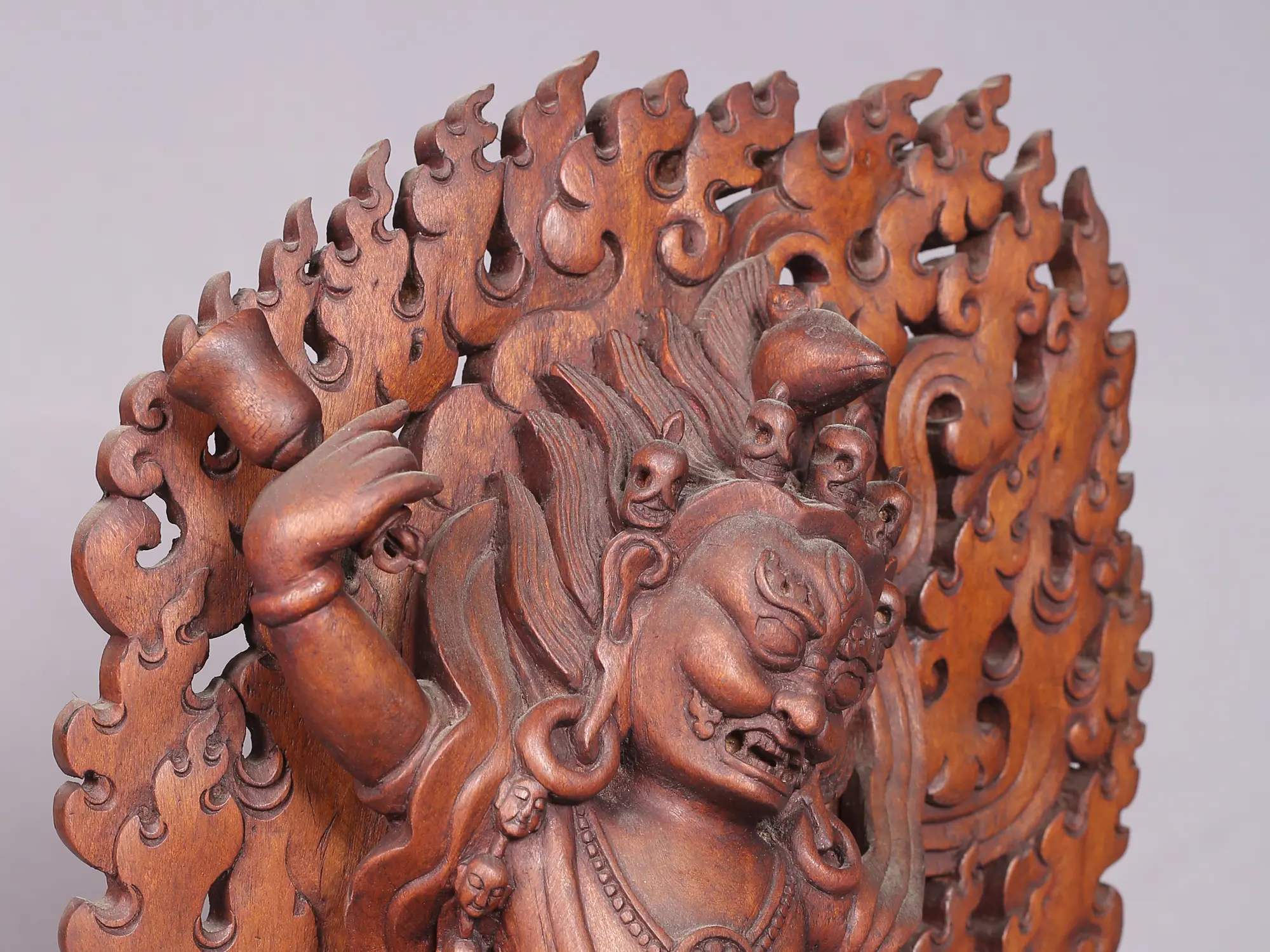 Crafted with deep reverence and meticulous artistry, this exquisite wooden statue depicts Akash Bhairav, a fearsome yet protective deity revered in Tibetan Buddhism and Nepalese traditions. The rich, warm tones of the wood are brought to life through intricate carving, capturing the dynamic and formidable nature of this powerful protector. Akash Bhairav, often associated with the sky and the vastness of the cosmos, is a manifestation of Shiva, embodying wrathful energy aimed at vanquishing negative forces and safeguarding devotees from harm.