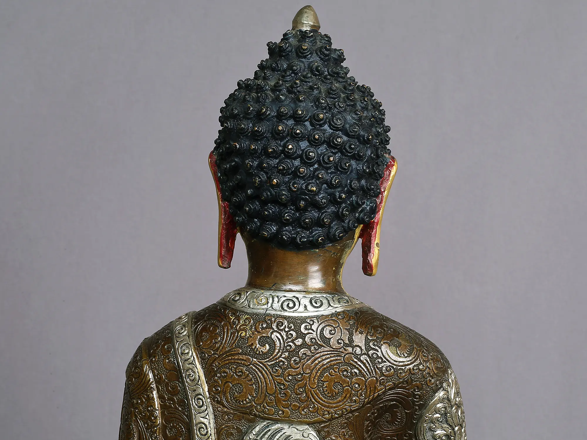 On the reverse of the statue, one can truly appreciate the finesse of the artist, who has added ornate patterns with meticulousness. The lotus seat of Amitabha is marked by the symbol of Dhammachakra (Wheel of Dharma) flanked by two deers, a motif used in art to represent the enlightenment of the Buddha and his sermon at the deer park of Sarnath.