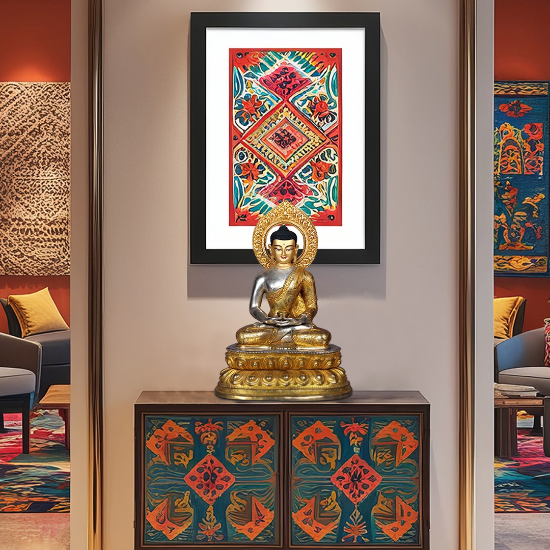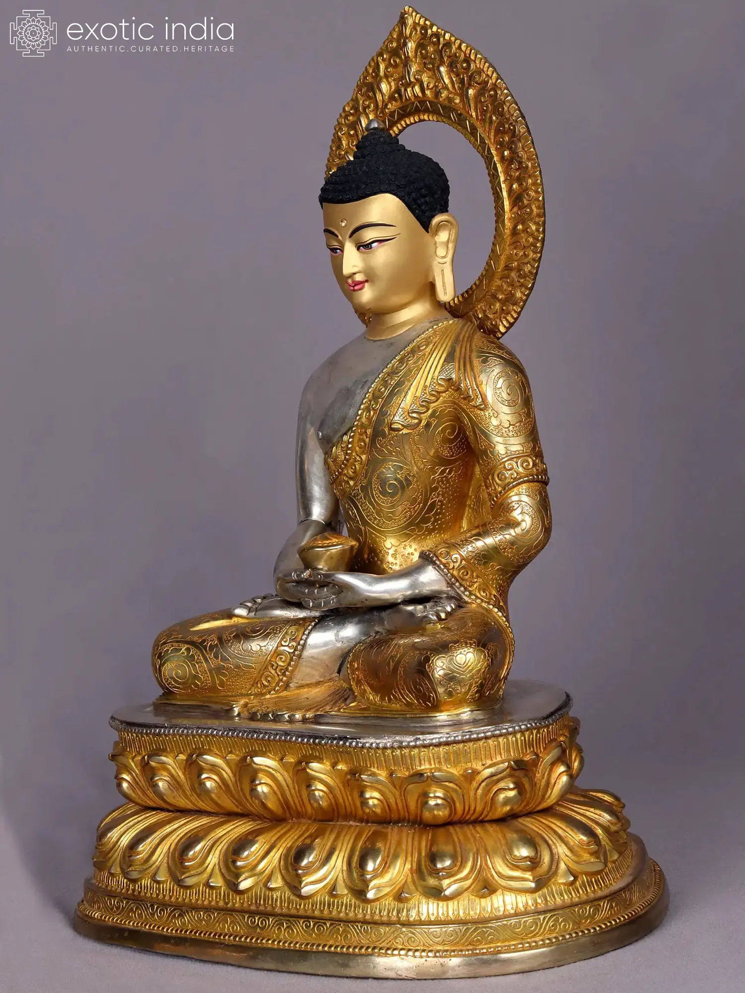 In the ethereal realm where celestial light and boundless compassion intertwine, the majestic Amitabha Buddha emerges as a mesmerising beacon of enlightenment. Enchanting and sublime, the Amitabha Buddha sitting on a lotus podium, cradling a sacred bowl of profound solace and rejuvenation. With eyes brimming with infinite wisdom and boundless love, Amitabha draws seekers of truth towards his ethereal embrace. Fashioned meticulously in copper, adorned with a gleaming gold finish, this exquisite masterpiece emanates an aura of transcendence and healing. Elevate your spiritual practice or enrich your space with the presence of Amitabha Buddha, an eternal symbol of wisdom and grace.