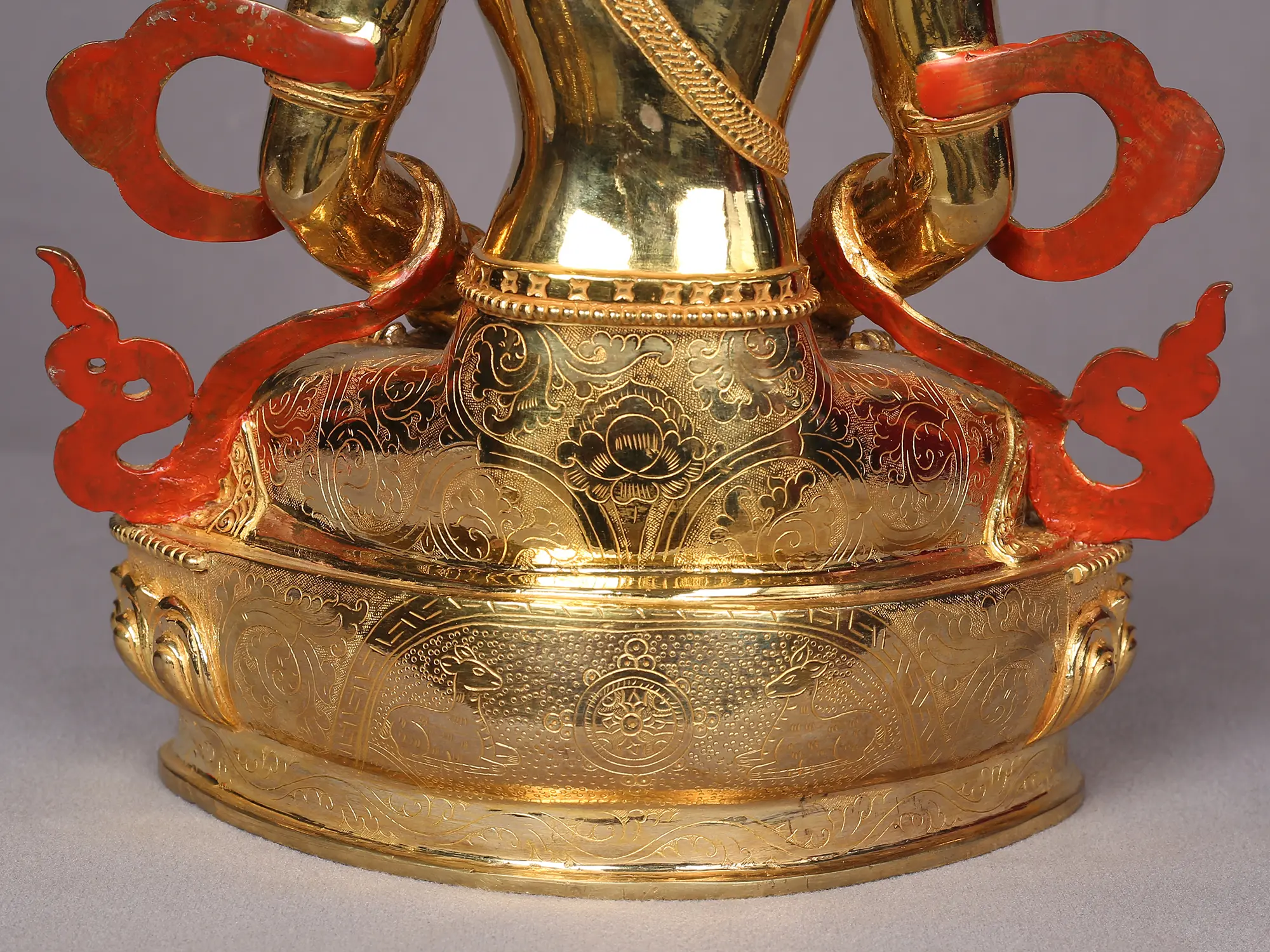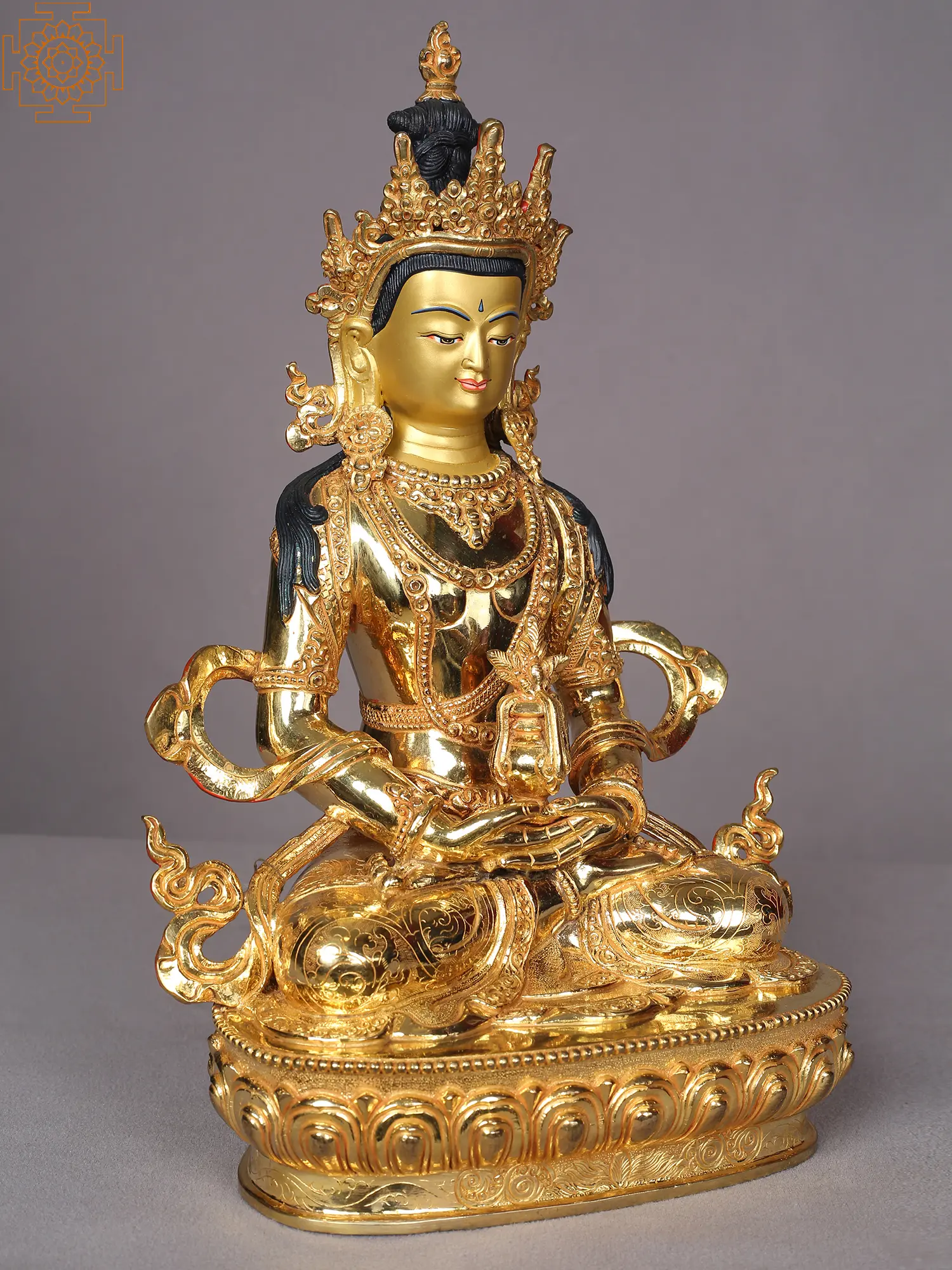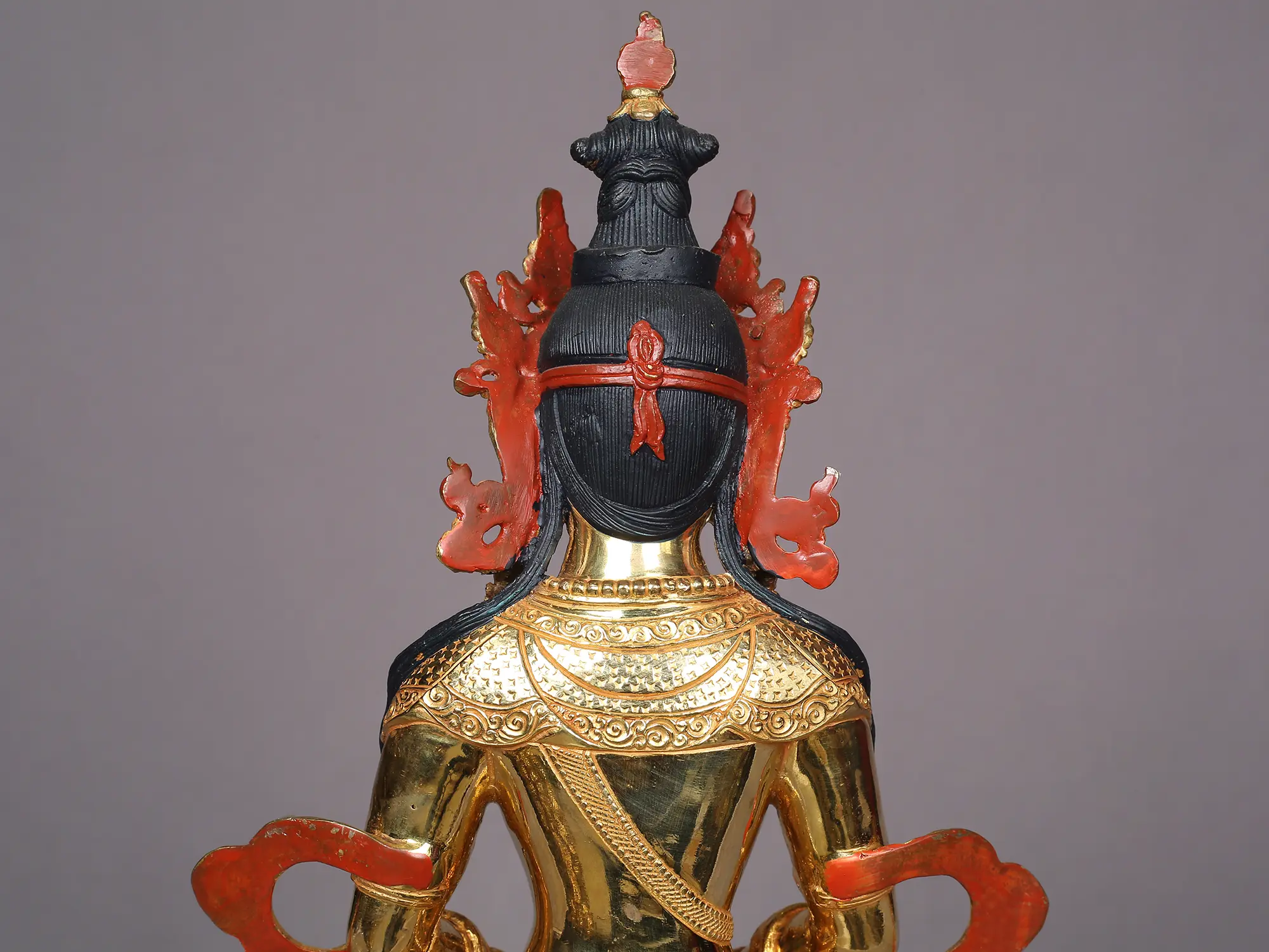 Invite the radiant presence of Amitayus, the Buddha of Infinite Life, into your sacred space with this exquisite statue. Meticulously crafted from copper and then lavishly gilded with pure gold, this piece is a testament to the enduring artistry and profound spiritual heritage of Nepal. The luminous sheen of the gold captures and reflects light, symbolizing the boundless wisdom and compassion of Amitayus, a vital deity in Vajrayana Buddhism, who presides over the Western Pure Land of Sukhavati.