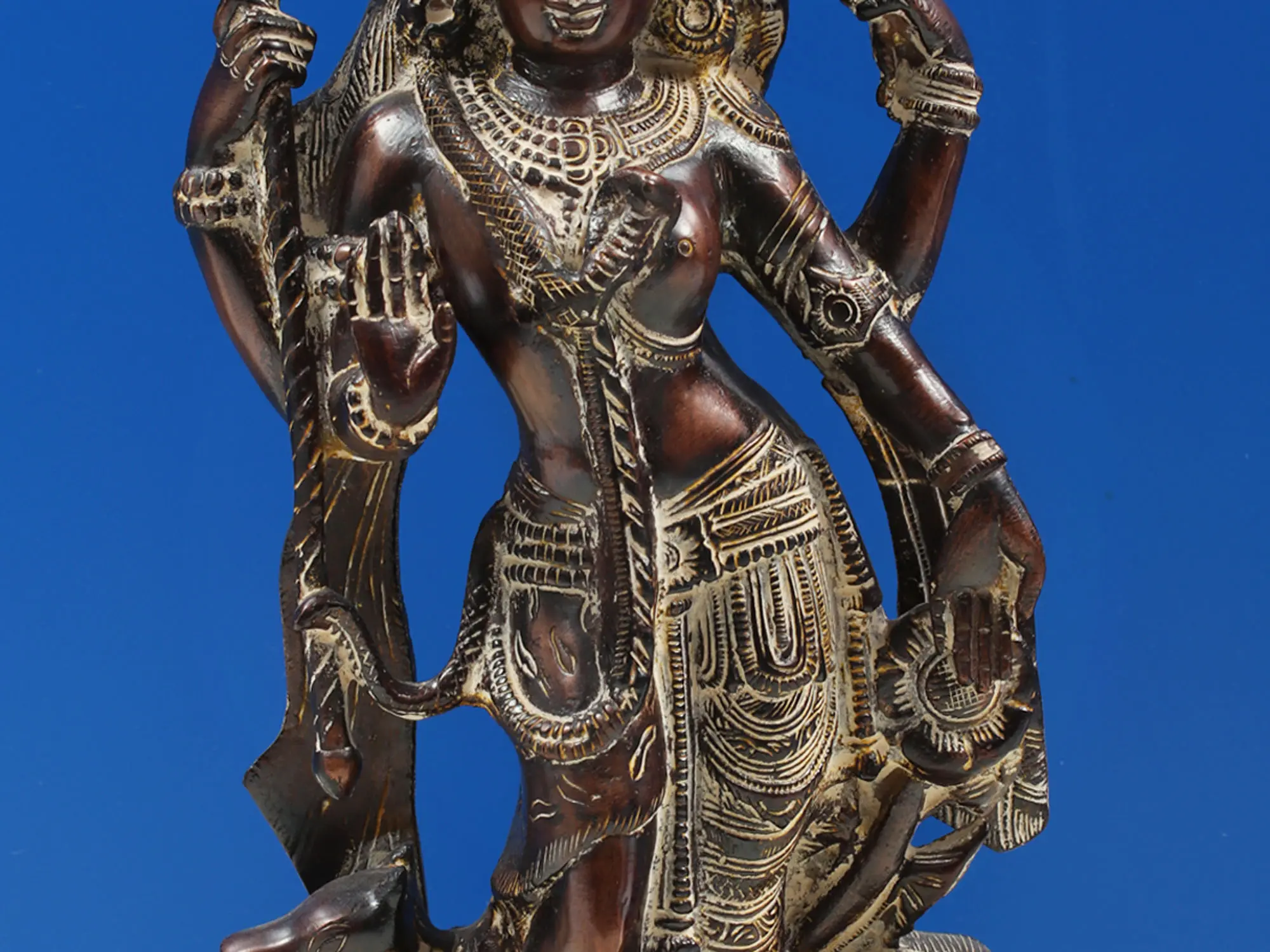 This exquisite brass sculpture captures the profound representation of Ardhanarishvara, a revered deity embodying the synthesis of the masculine and feminine energies of the universe. Ardhanarishvara is a powerful iconographical form of the Hindu deities Shiva and his consort, Parvati (also known as Shakti), in a single, unified form. This sculpture, rendered in lustrous brass, stands as a testament to the artistic skill and deep spiritual symbolism inherent in Indian craftsmanship. The form of Ardhanarishvara symbolizes the inseparable nature of creation and destruction, masculine and feminine, consciousness and energy. It conveys the idea that the universe is a balance of opposing forces, and that true harmony is achieved when these forces are united. According to ancient Hindu scriptures, Lord Brahma created the universe through the union of Shiva and Shakti. Lord Shiva, the ascetic ascetic, and Parvati, the divine feminine power, are seen as two halves of a whole, essential for the existence and continuation of all life. This divine union represents the ultimate balance and the source of all creation. The sculpture masterfully portrays this duality with meticulous attention to detail, showcasing the divine features of both Shiva and Parvati in a single, captivating figure.