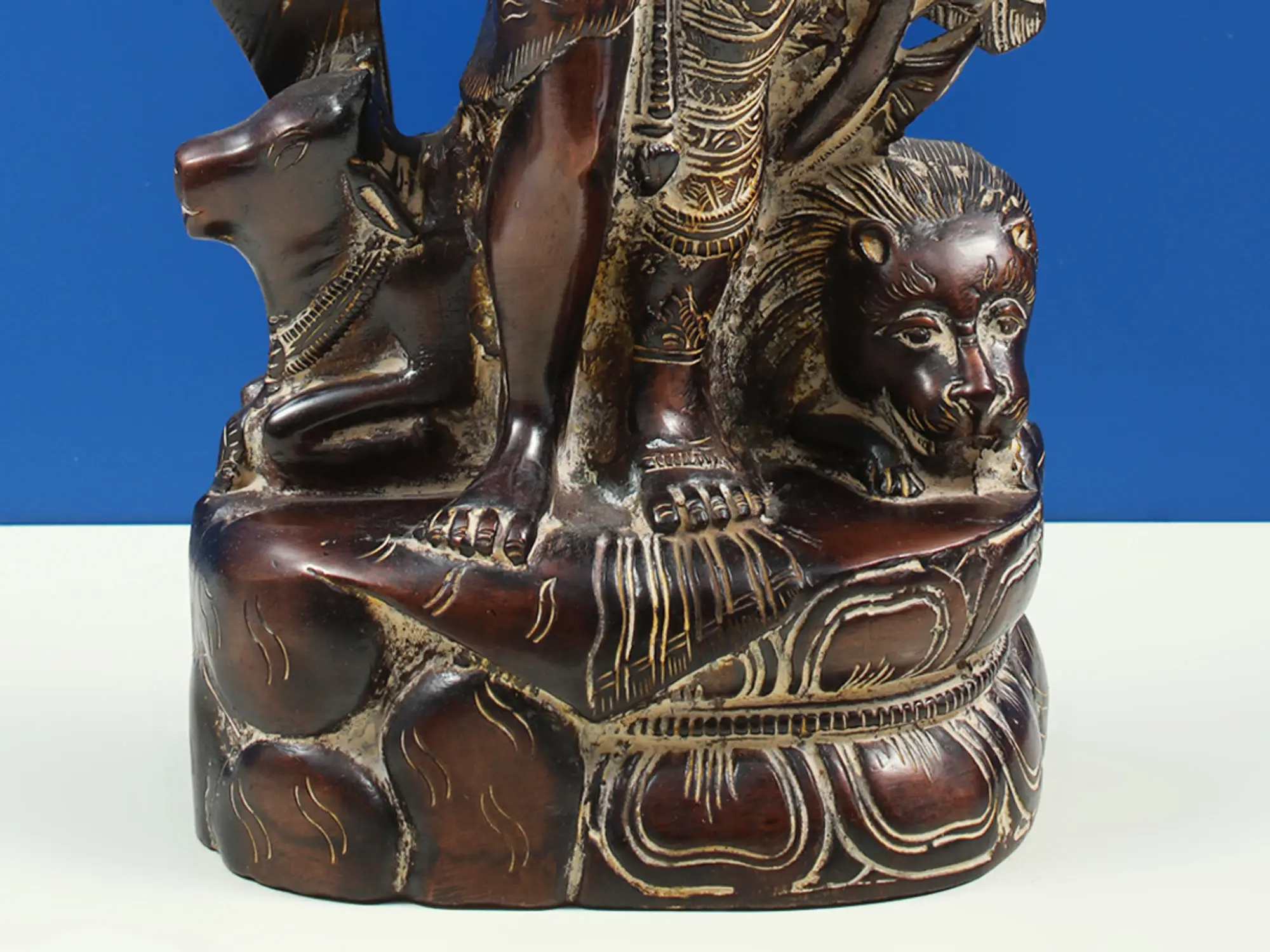 The artistry displayed in this brass sculpture is truly remarkable. The sculpture depicts the divine being with four arms, a common representation of Ardhanarishvara. One side, typically the right, embodies Shiva, often depicted with attributes like the Trishula (trident), symbolizing destruction and regeneration, and the Damaru (drum), representing the rhythm of creation. The other side, typically the left, represents Parvati, adorned with a lotus or other symbols of beauty and fertility, and often holding a mirror, symbolizing divine illusion or Maya. The flowing drapery and intricate ornamentation further accentuate the divine presence, reflecting the richness of traditional Indian aesthetics. The subtle yet powerful carving brings the metallic form to life, conveying a sense of movement and grace. The durable and radiant brass material ensures that this sacred representation will endure through time, radiating its spiritual significance for generations. The base of the sculpture often incorporates symbolic elements. The presence of Nandi, Shiva's bull mount, on the Shiva side and a lion (often associated with Durga, a fierce aspect of Parvati) on the Shakti side further reinforces the union of these divine energies. The intricately carved pedestal adds to the overall grandeur and visual appeal, making it a focal point of any space it adorns. This sculpture serves not just as a decorative piece but as a constant reminder of the fundamental principles of balance, harmony, and the interconnectedness of all existence. It invites contemplation on the profound philosophical underpinnings of Hindu cosmology and the eternal dance of creation and dissolution.