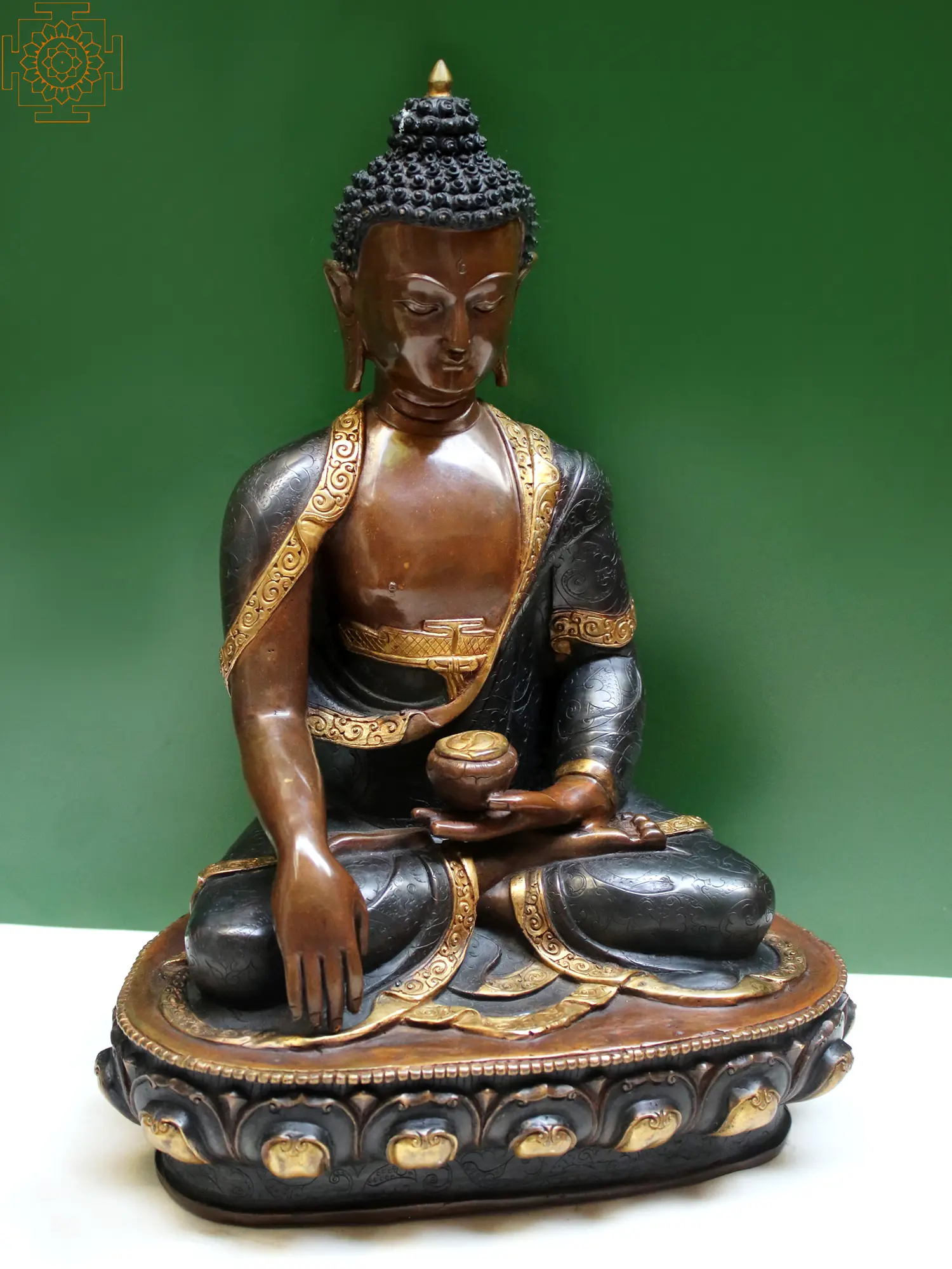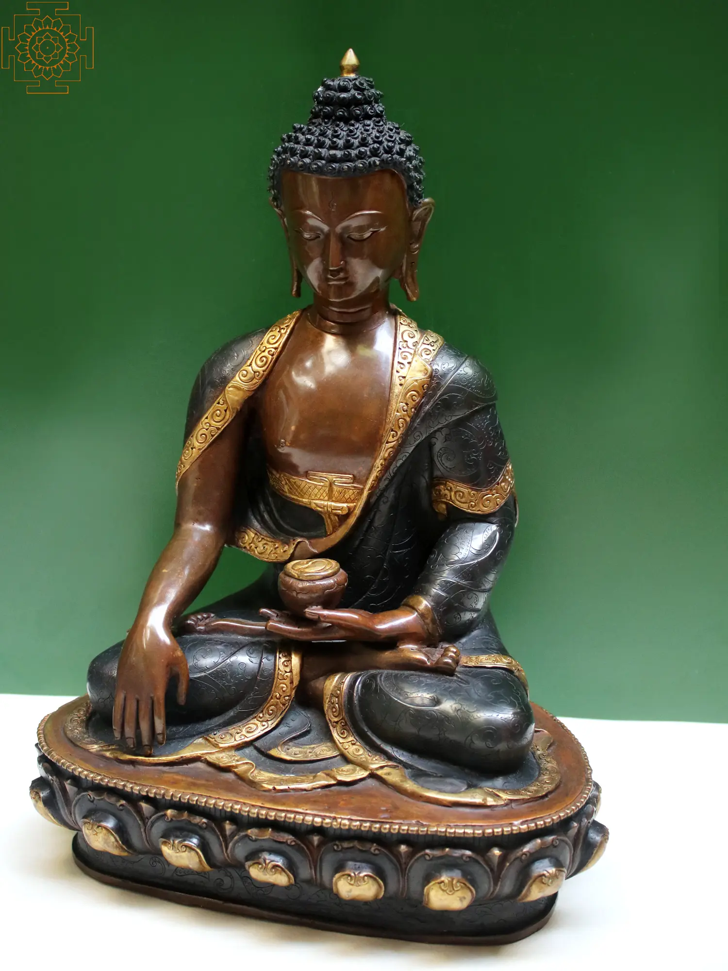 Hailing from Nepal, a land steeped in spirituality and renowned for its masterful metalwork, this statue is a testament to generations of artistic heritage. The copper medium, chosen for its durability and ability to hold intricate detail, has been skillfully worked to bring forth the serene countenance of the Buddha. The robe, depicted with a dark, textured finish and accented with intricate golden patterns, evokes a sense of regal dignity. The delicate folds of the fabric and the precise rendering of his fingers touching the earth highlight the artisan's dedication to capturing the essence of this sacred posture. The ornate lotus base upon which the Buddha sits is also a significant symbol, representing purity and spiritual blossoming, further enhancing the spiritual aura of the piece.