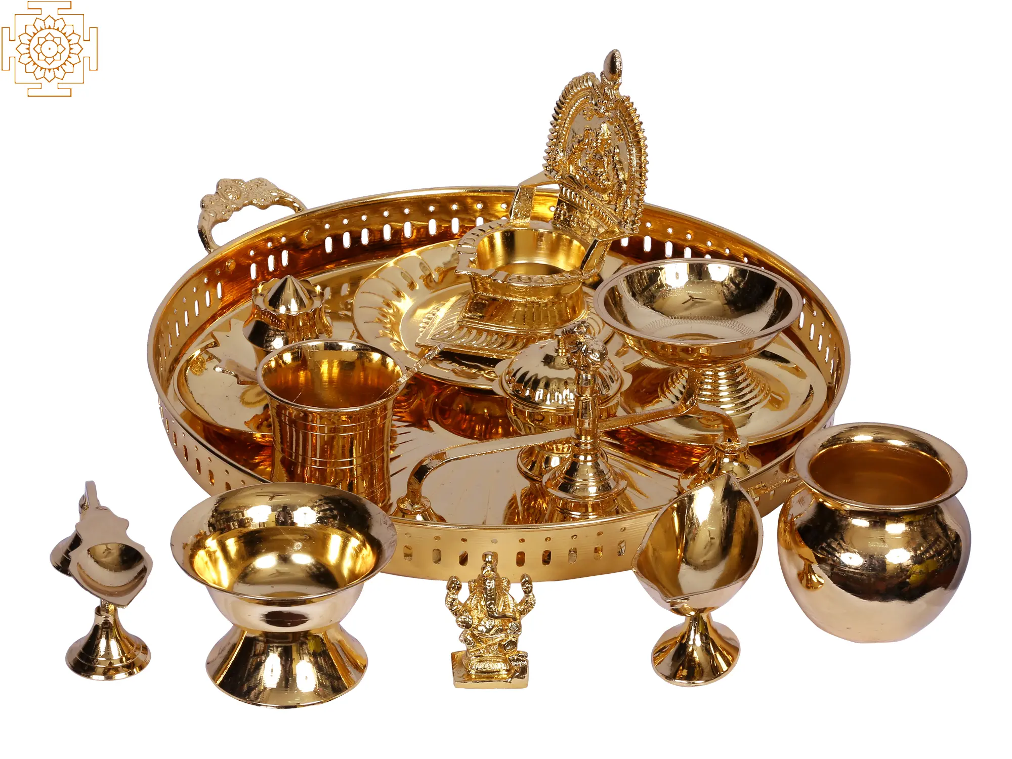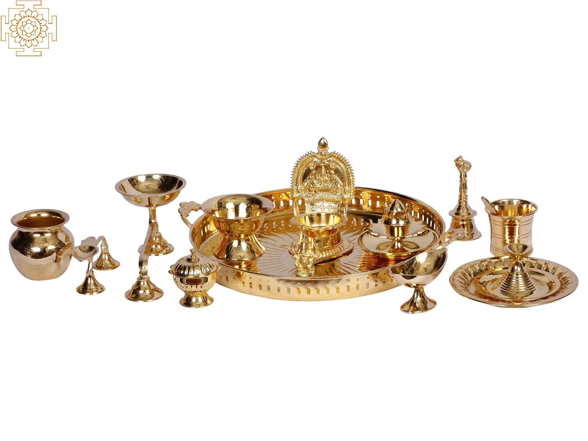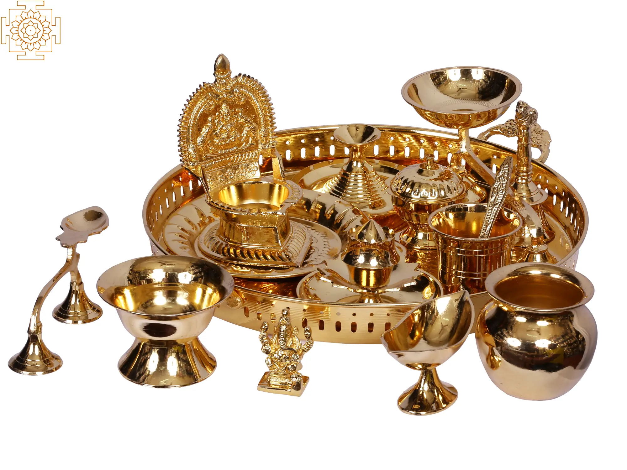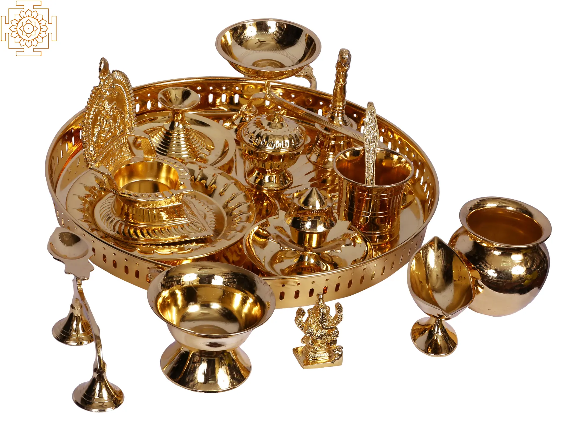 A Puja Thali is a ritual object rather than a plate that is prepared by placing very important objects on it and offering them to deities. Puja Thalis are made up of ceremonial artifacts and come in a variety of styles. This plate is made of brass and is also gold-plated. Puja Thali is a collection of beautiful brass items, such as a Panchapatra (Panchamrita container) for offering Panchamrita, a Pali (spoon), and a Lota (a pitcher) for presenting Gangajal. A Dhoop Dhaan is a device that produces smoke by burning coconut husk. The light of burning camphor is provided by a single Camphor aarti lamp. The little Thali can be used to store cut fruits or to hold the smaller Ganesha figure when doing Abhishek.