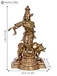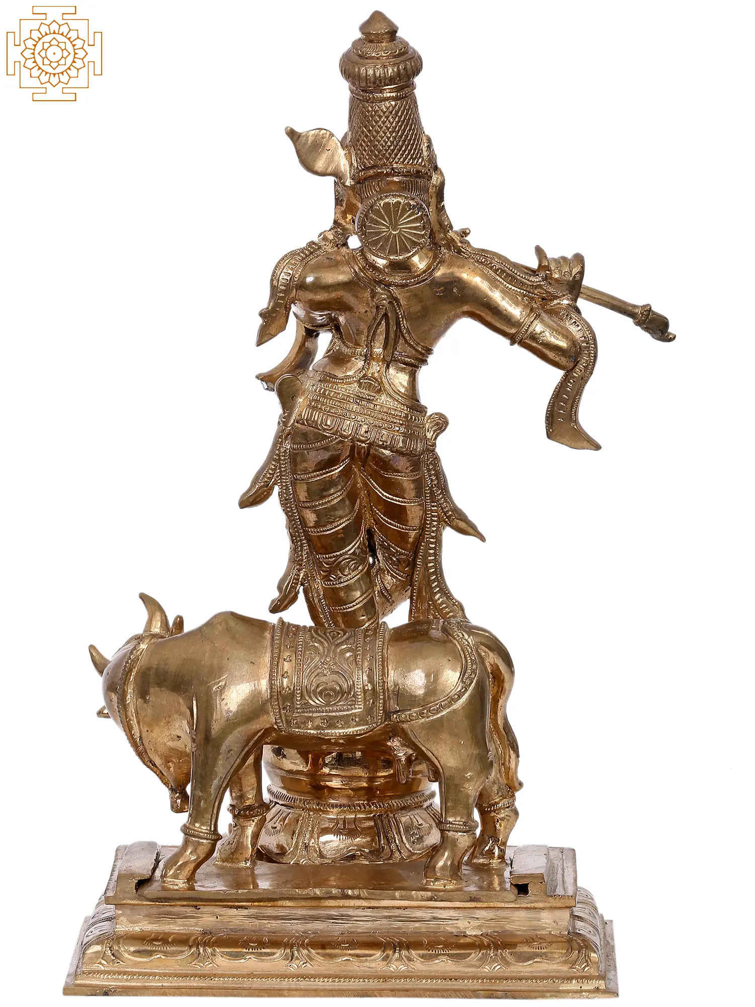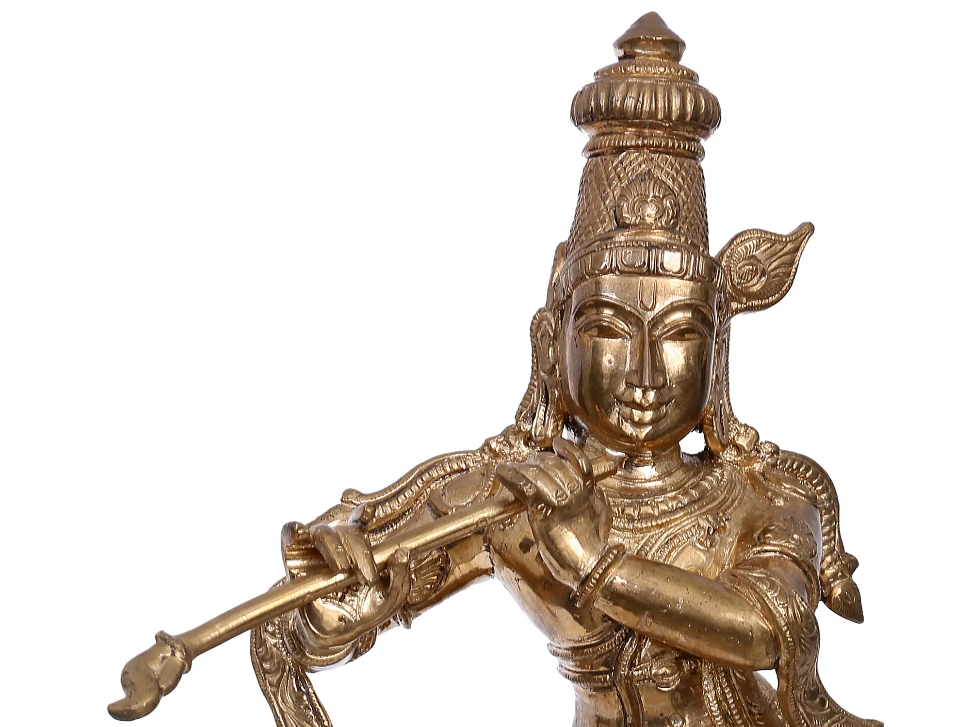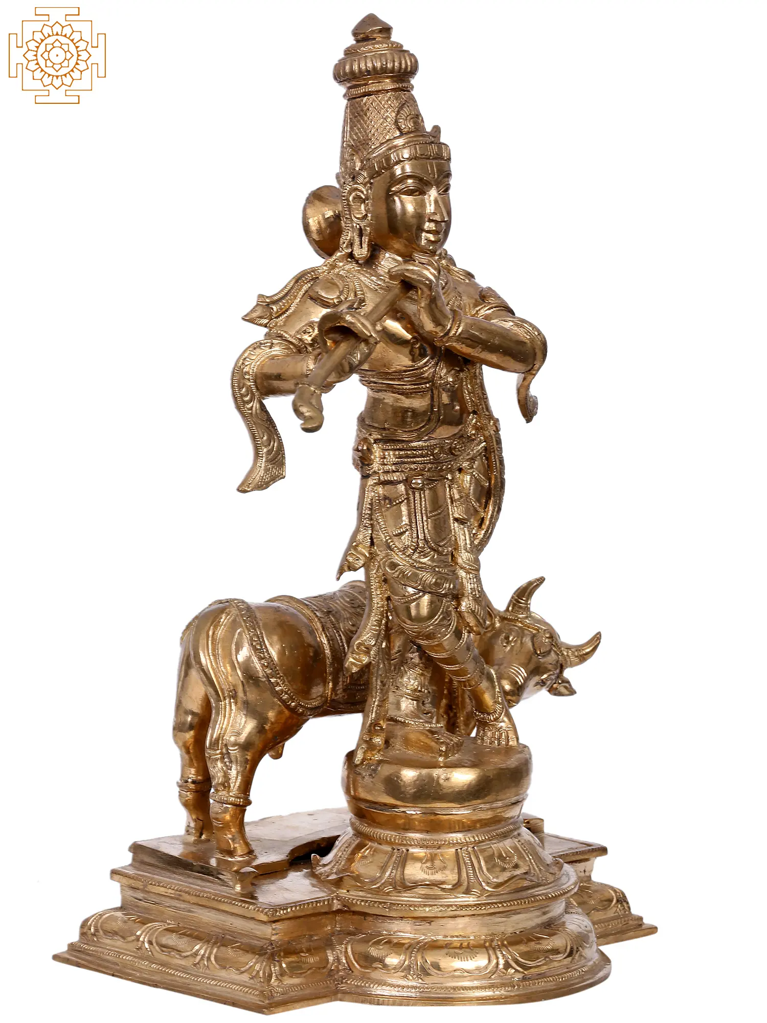 In this enchanting depiction, Lord Krishna, “also known as Murlidhar”, “the divine flutist”, graces the cosmic canvas with mesmerising allure. Poised in the “Natvar Asana”, He stands upon a lotus pedestal, a beacon of celestial elegance. Clad in regal attire, a peacock feather crown crowns his godly countenance. Sacred threads and celestial jewellery adorn his divine form, echoing the cosmic dance of creation. Behind him, a reverent cow delicately licks his feet, symbolising the nurturing essence of his divine presence. Crafted in Panchaloha bronze from “Swamimalai” using the ancient “Madhuchista Vidhana (Lost-Wax) technique”, this artwork beckons souls towards transcendence, and the divine communion between the earthly and the ethereal.