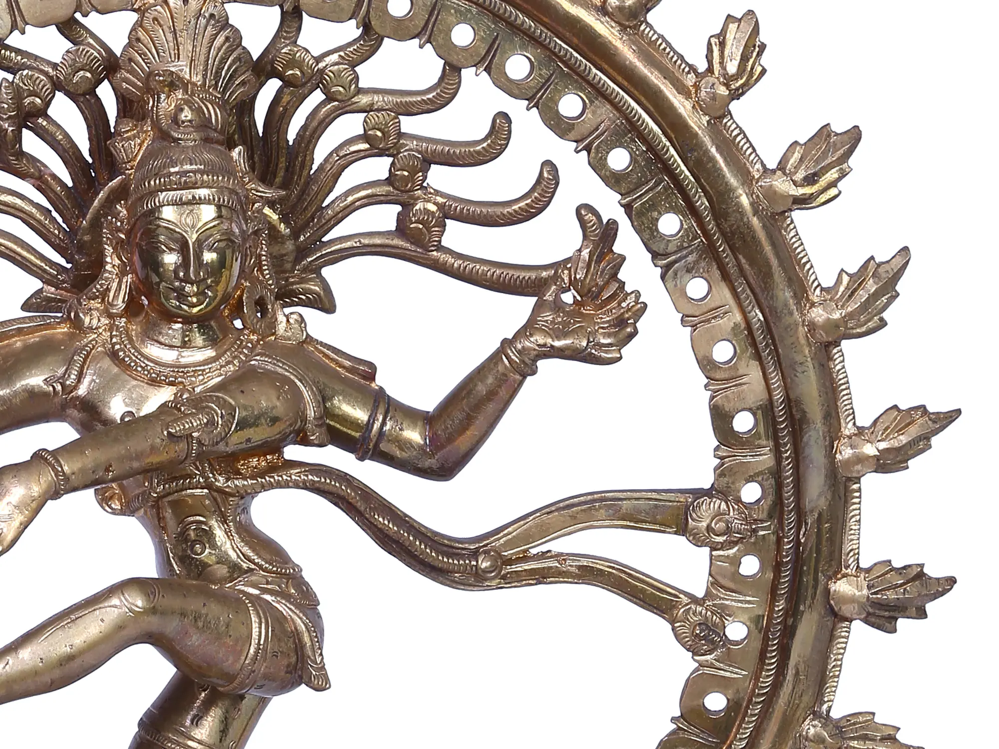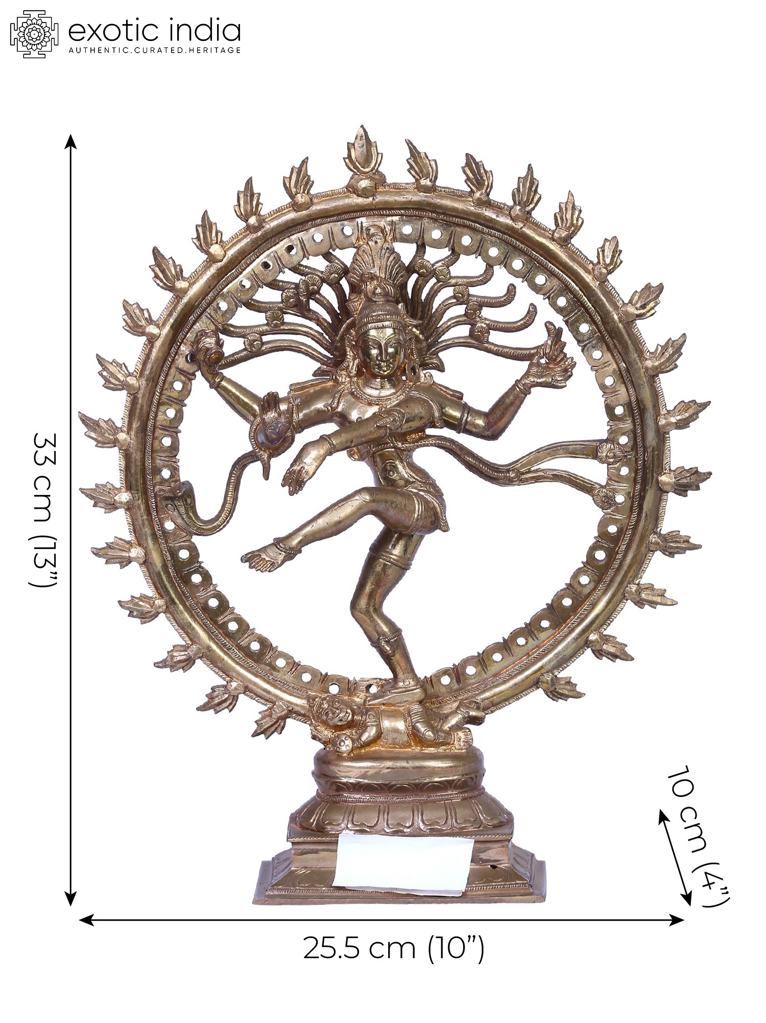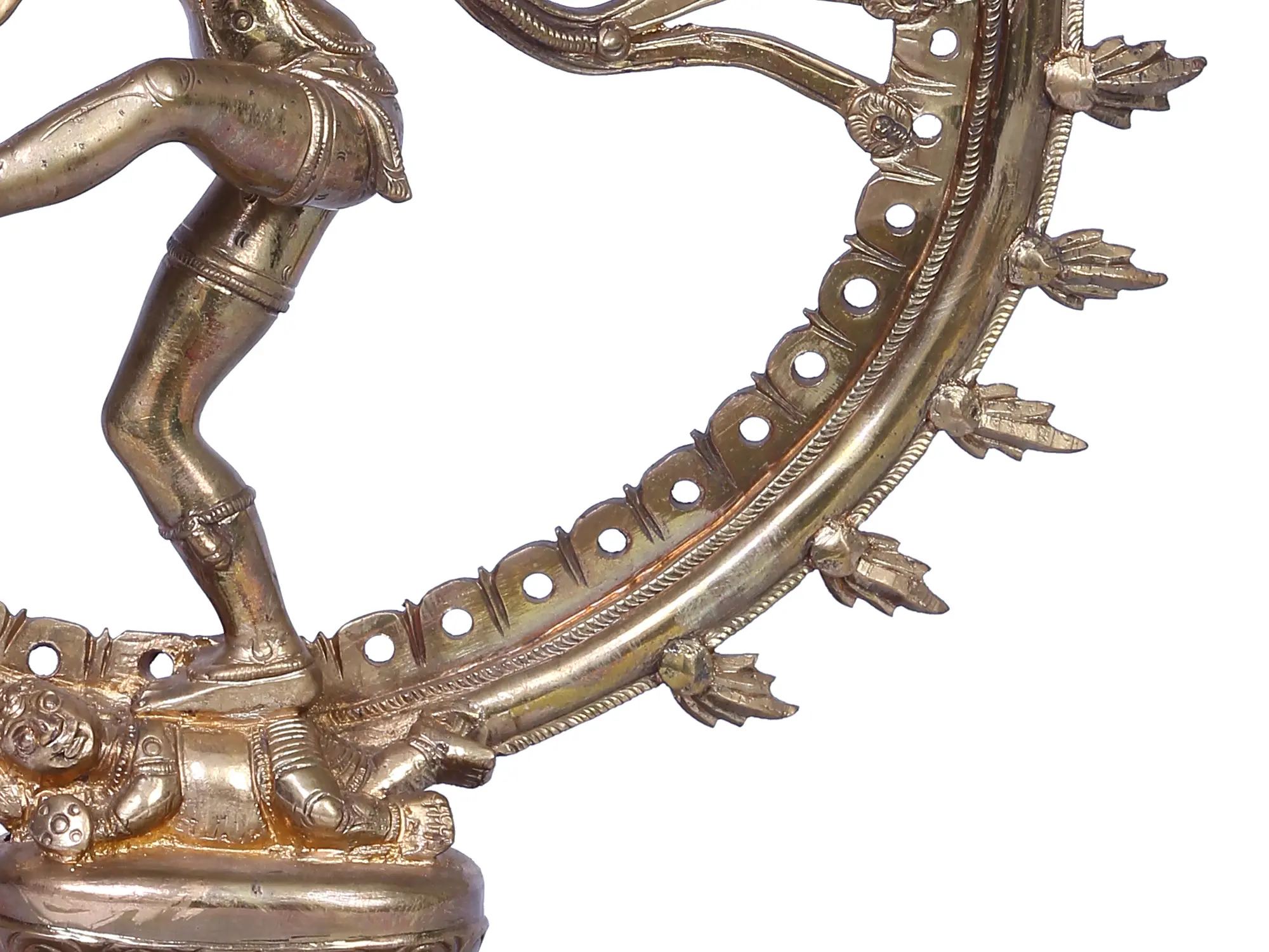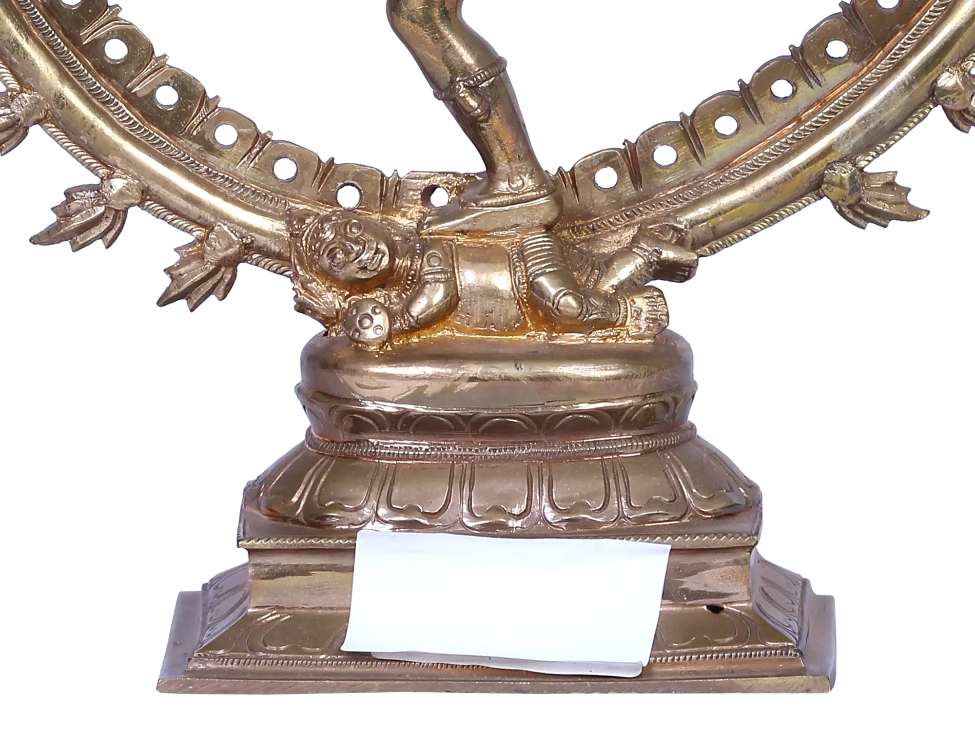 Encircled by fierce flames, Lord Nataraja, “the celestial dancer”, stands upon a lotus, the epitome of purity amidst chaos. The resounding beats of his “Damaru” (Udukai) echo through creation, orchestrating the eternal dance of life. “Agni” in his hand, a cosmic flame, embodies the dual forces of creation and destruction. A coiled serpent, a symbol of energy, graces his lower arm, while the “Abhaya Mudra (Fear not gesture)” imparts fearlessness. His lower hand, crossing his chest, points to his raised foot, a gesture of peace and salvation. Beneath, Nataraja’s right foot crushes “Apasmara, the dwarf of ignorance”, proclaiming the triumph of divine knowledge over illusion. Crafted from Panchaloha Bronze using the ancient “Madhuchista Vidhana (Lost-Wax) technique”, this celestial ballet embodies the cosmic order, the rhythmic dance of creation and dissolution, where Shiva reigns as the cosmic dancer, Nataraja.