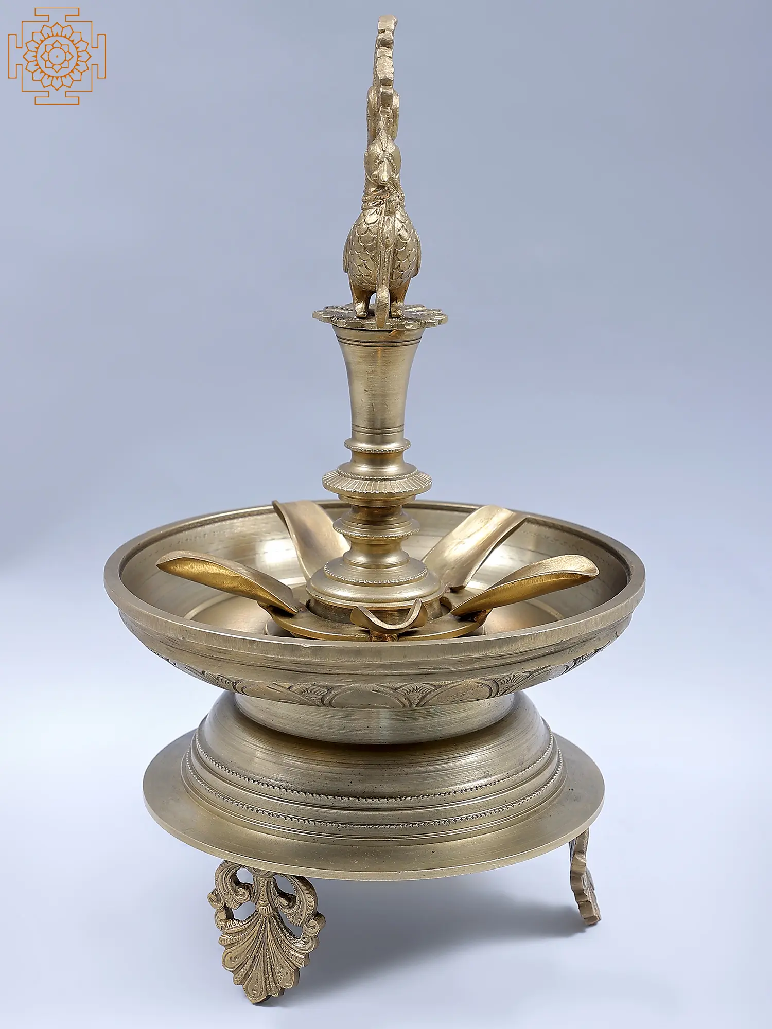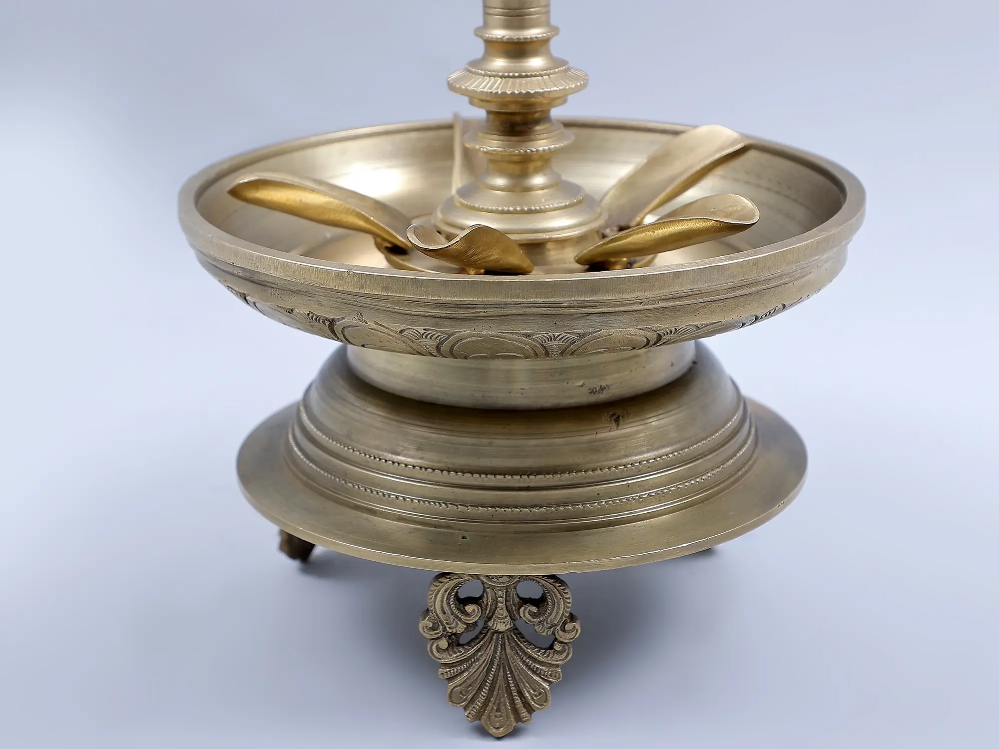 The wick of the lamp are elevated plates placed very carefully attached to the stem originating from the center of the oil basin. This structure has been implemented to regulate the flow of oil to the cotton wick. The elevated wick stand allows only the inner end of the wick to touch the central oil basin thus soaking a small amount of oil gives a gentle flame and also conserves oil. The lamp burns for a longer period. This lamp made by traditional craftsmen has fine quality bronze as the base metal and exudes a matt gold shine. It is a fine piece of art that can also work as a ritual object.