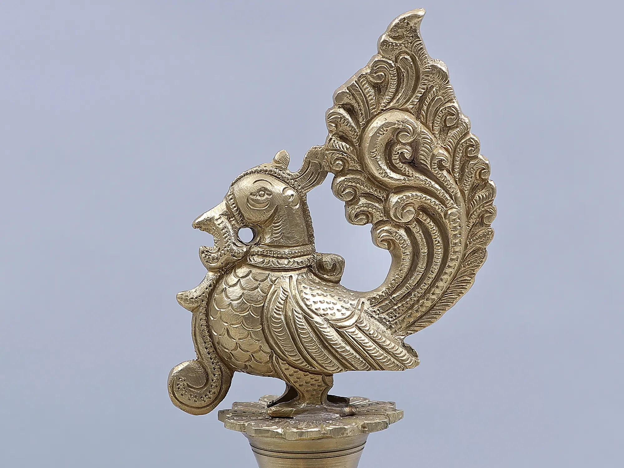 The ancient craftsmen of India experimented a lot and found new ways to create ritual items that could be useful, and beautiful and conserve resources. The Hoysala craftsmen were at one point in history the most skilled craftsmen and the proof can be seen in the sculptures and wall statues of the temples of Halebidu and Belur. The metal craftsmen of that era took inspiration from these temples and crafted some of the finest lamps and other ritual objects. This bronze lamp identified as a Mayil Vilakku or peacock lamp is the best example of smart design amalgamated with auspicious symbols. The peacock on the top of the lamp is a symbol of prosperity, often desired by royal families.