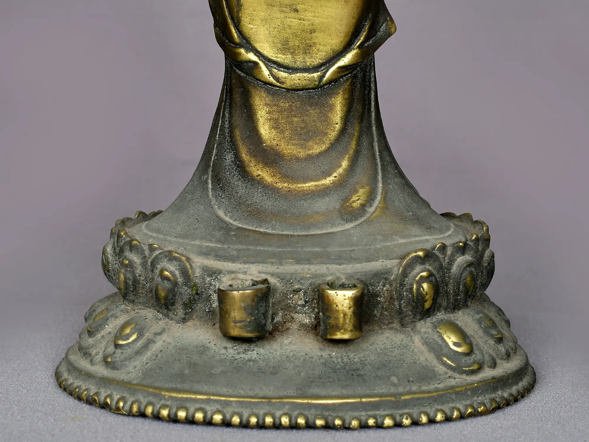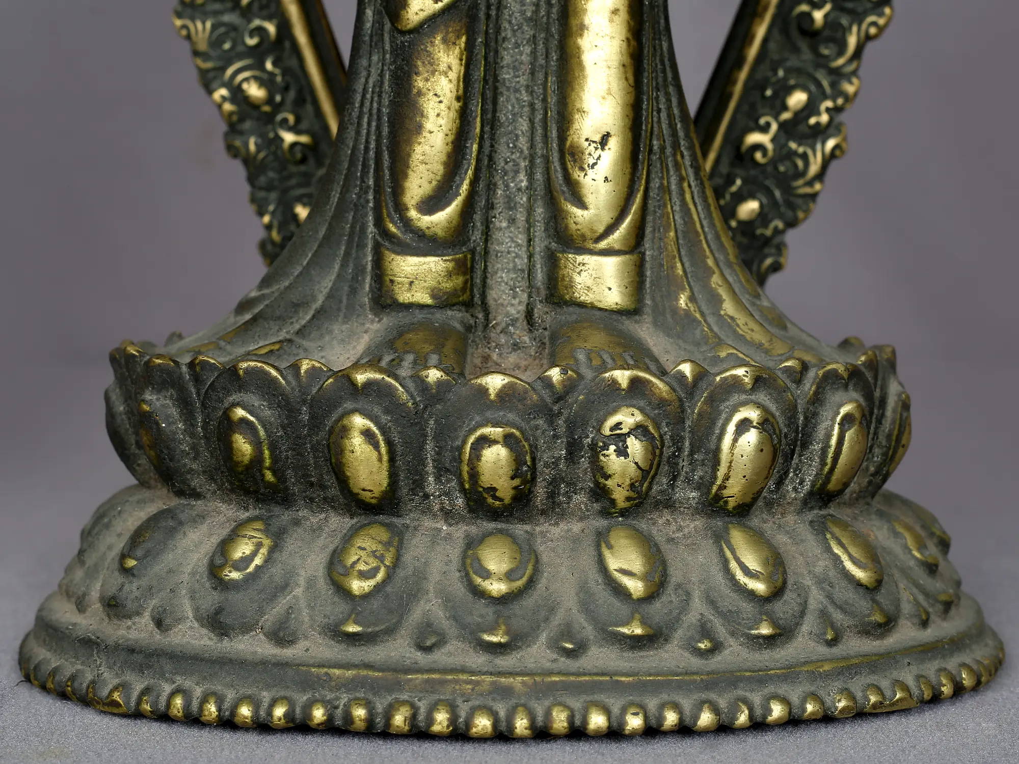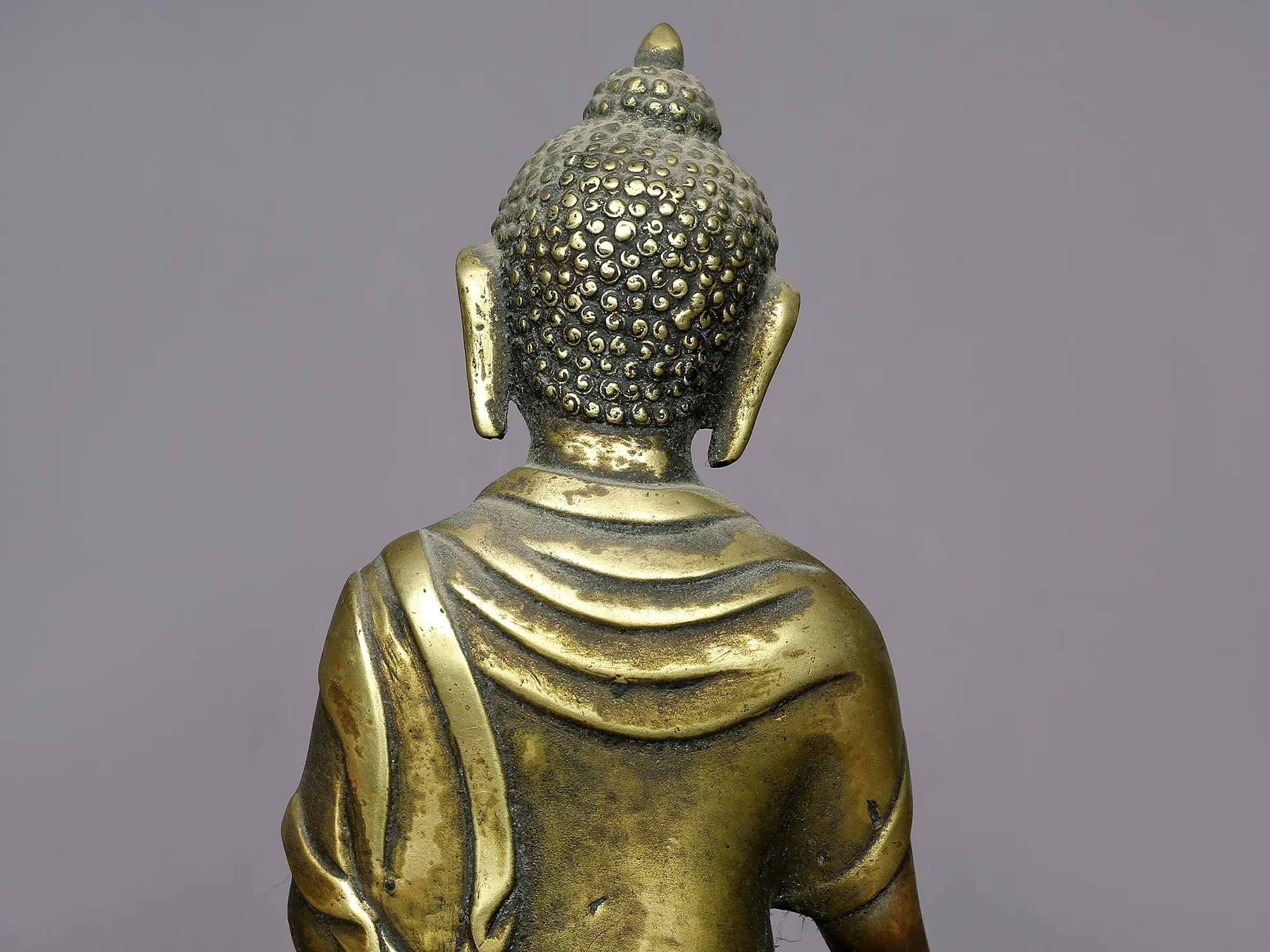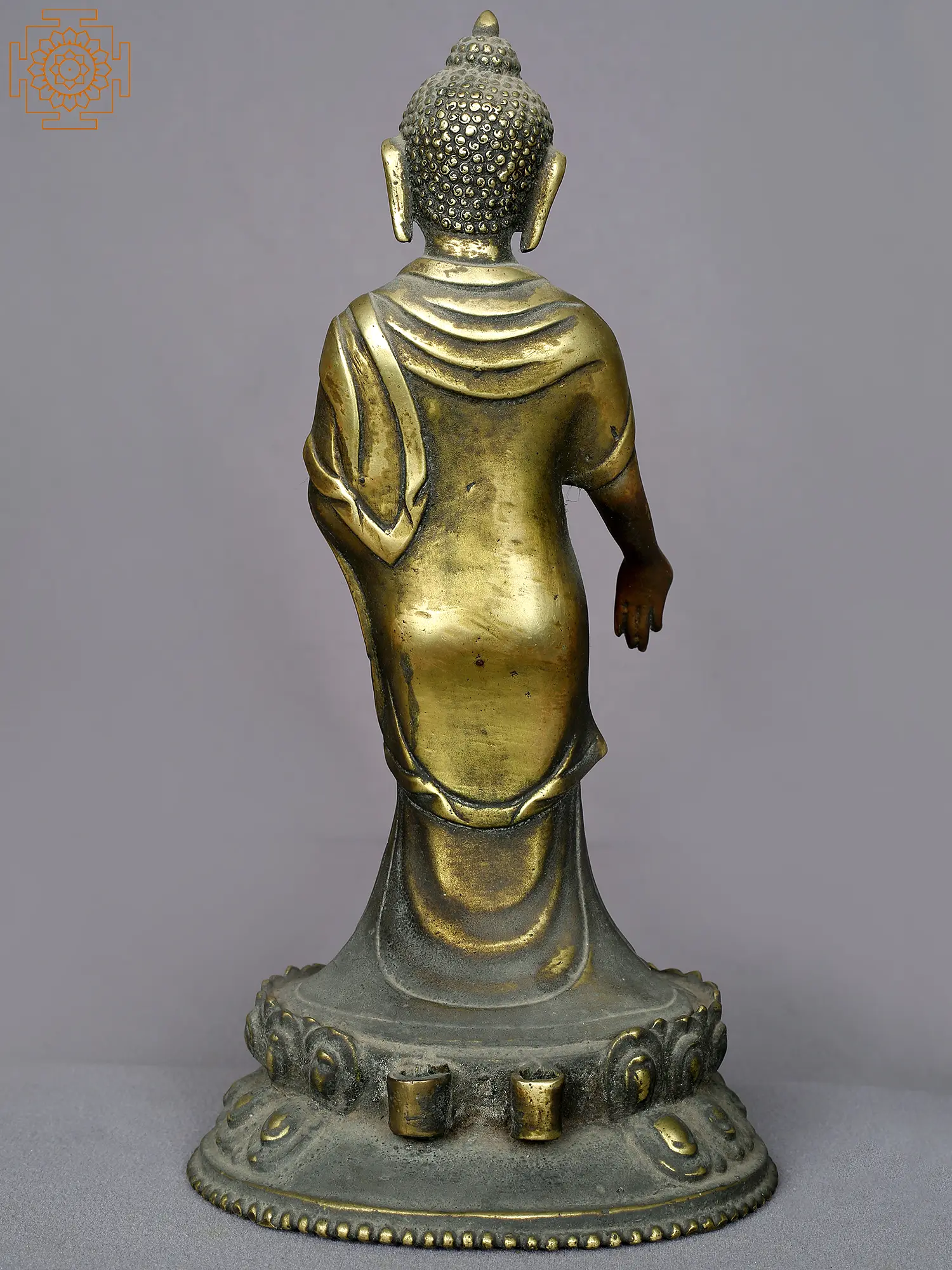 In the ethereal realm of artistic expression, Lord Buddha, the Awakened One, emerges as a sublime embodiment of serenity. Standing regally upon a “Lotus throne”, his countenance radiates tranquillity. His right hand, gracefully poised in “Varada Mudra”, bestows the gift of compassion, while the left, in “Vitarka Mudra”, imparts wisdom to the cosmos. Draped in Kasaya robes, the divine figure exhibits “snail shell curls”, “the Ushnisha”, symbolising heightened enlightenment. Elongated earlobes whisper tales of detachment from worldly desires. Crafted meticulously in bronze, this masterpiece, from Nepal, transcends mere form; it is an eloquent ode to benevolence, wisdom, and the timeless journey towards inner awakening. Each nuance weaves a tapestry of spiritual significance, inviting contemplation.