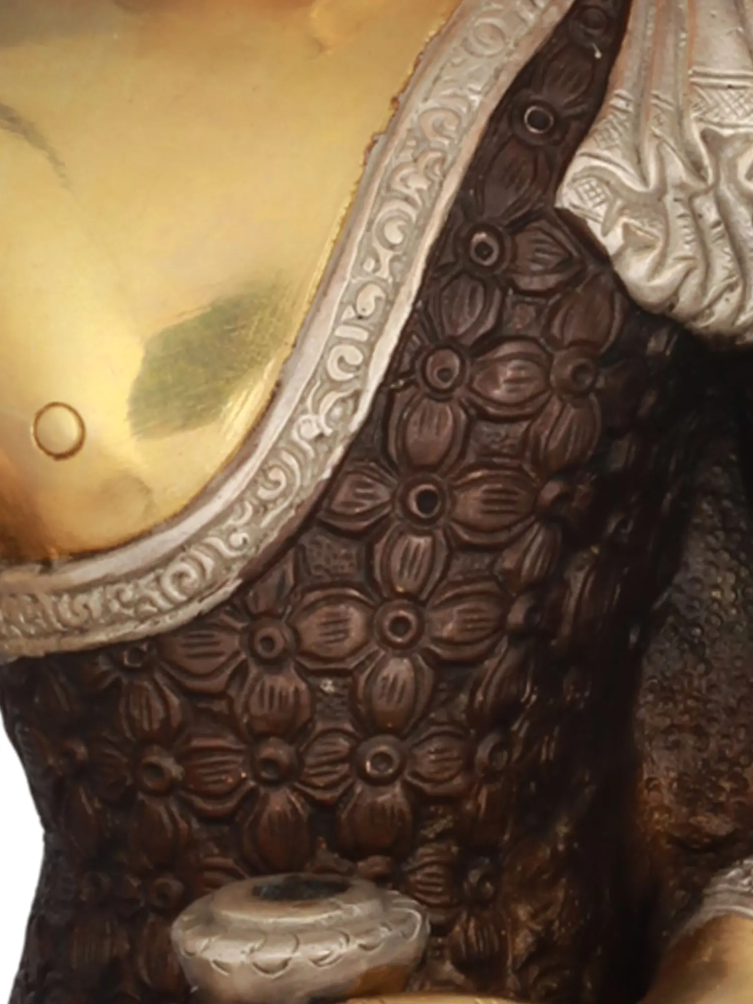 Handcrafted in India, this statue is a masterpiece of traditional metal artistry. The artisan has meticulously shaped the brass, imbuing it with a sense of serene power. The dark patina of the Buddha's body, contrasted with the delicate, ornate detailing on his robes and the lotus-adorned pedestal, speaks volumes of the skilled hands that brought this piece to life. The intricate patterns on the sanghati (robes) are a testament to the patience and precision of the craft. The lotus base, a universal symbol of purity and spiritual unfolding, further enhances the sacred aura of the sculpture. Each curve, each detail, from the tranquil expression on the Buddha's face to the subtle folds of his garment, is rendered with an artist's eye and a devotee's heart.