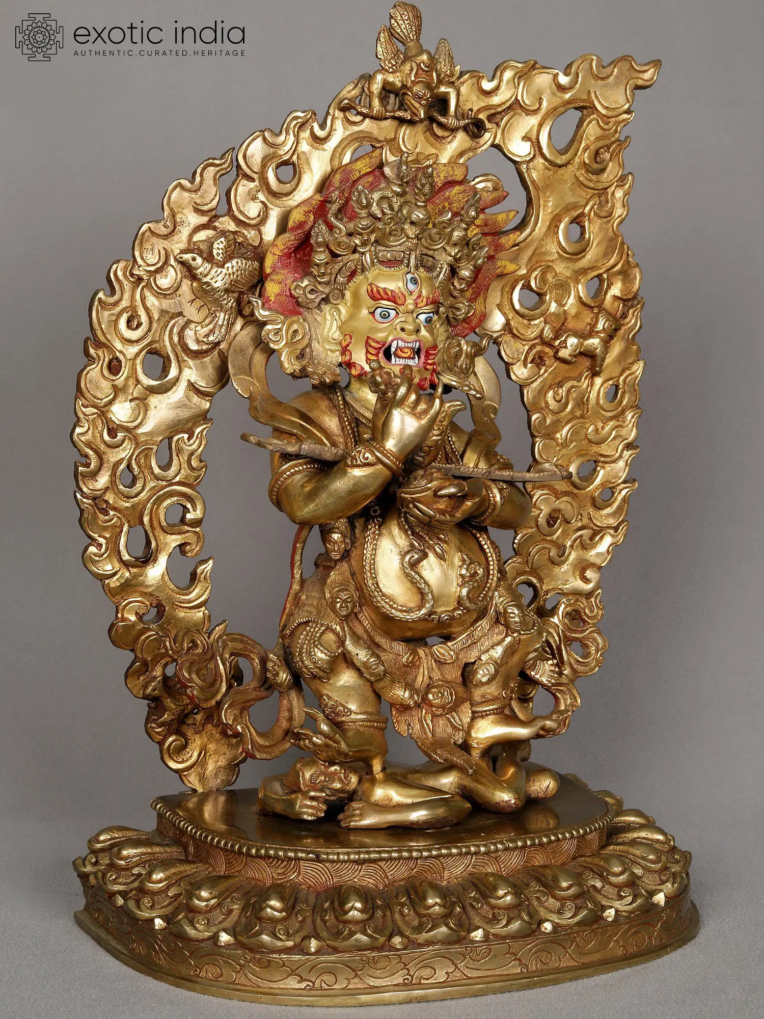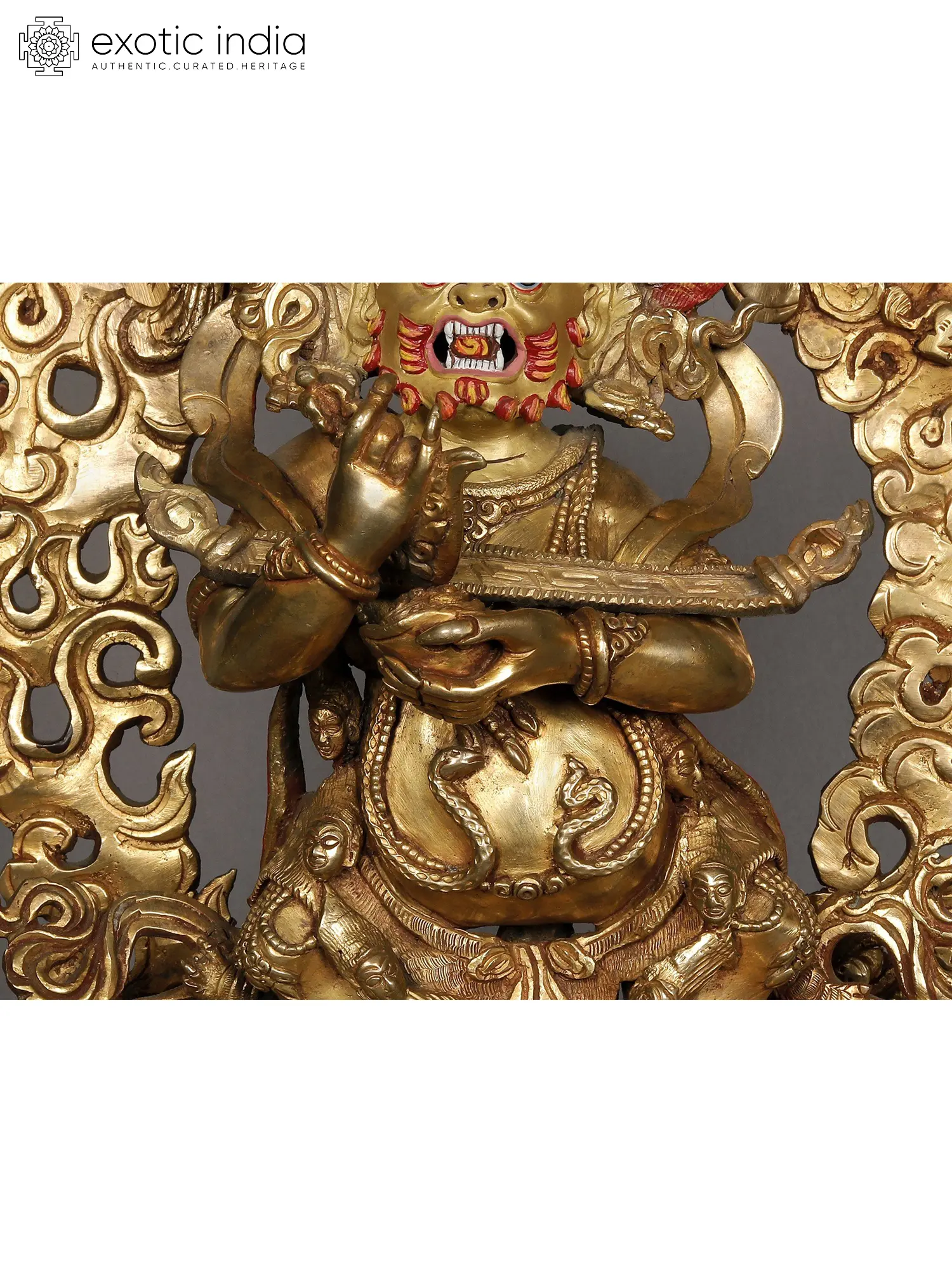 The name "Mahakala" originates from the Sanskrit words "Maha," signifying greatness, and "kala," representing both blackness and time. Hence, Mahakala translates as the "Great Black One." His primary hands grasp a spear horizontally, while the second pair holds spears with emaciated male corpses impaled upon them.
