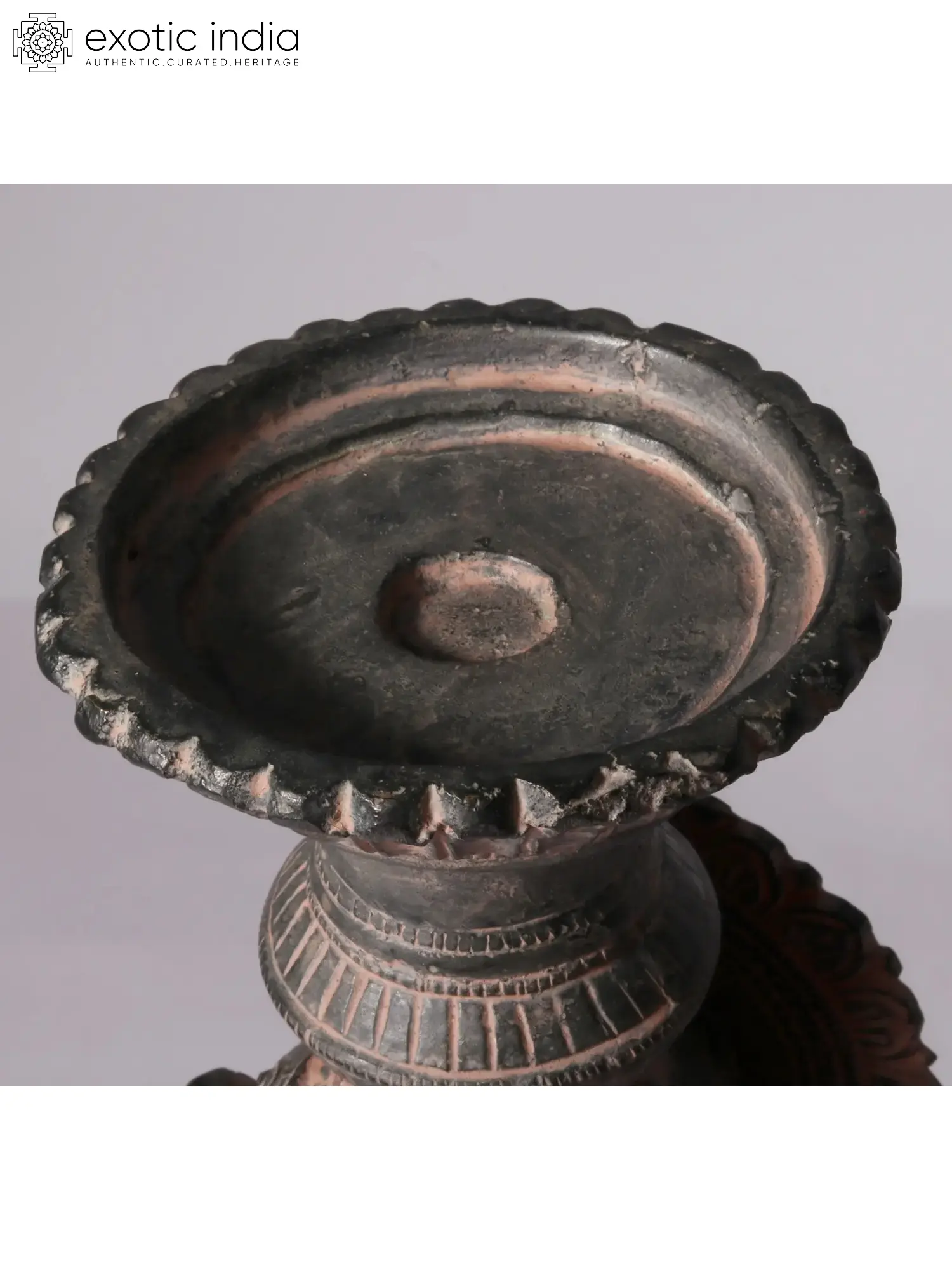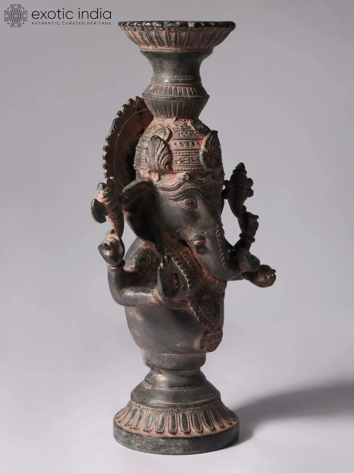 An elegantly designed Ganesha candlestick. Son of Shiva-Parvati, brother of Karttikeya; the upholder of light (just sattva) as well as prakrti (sattva-rajas-tamas), for both of which the candle stands as an unflickering symbol.