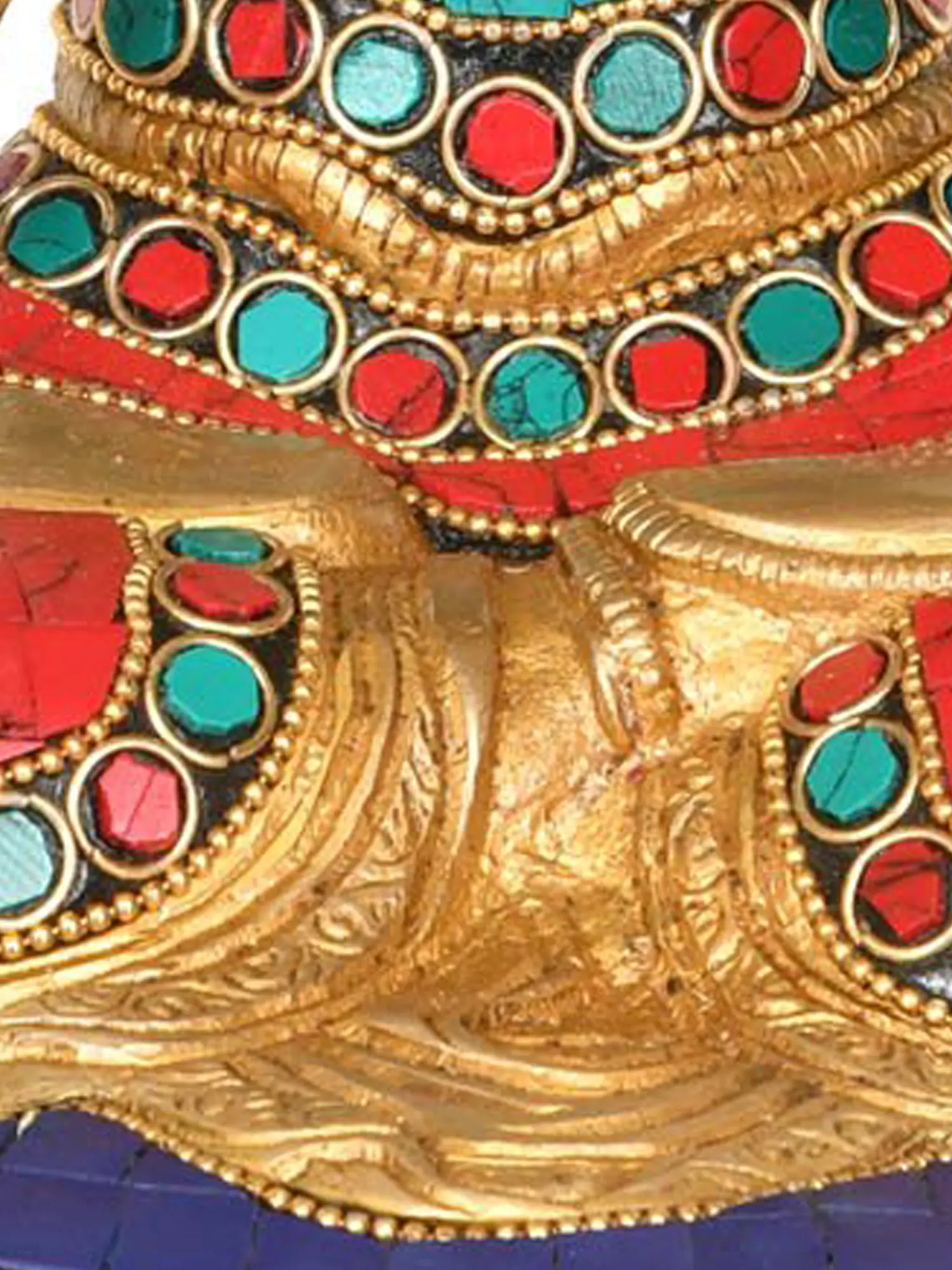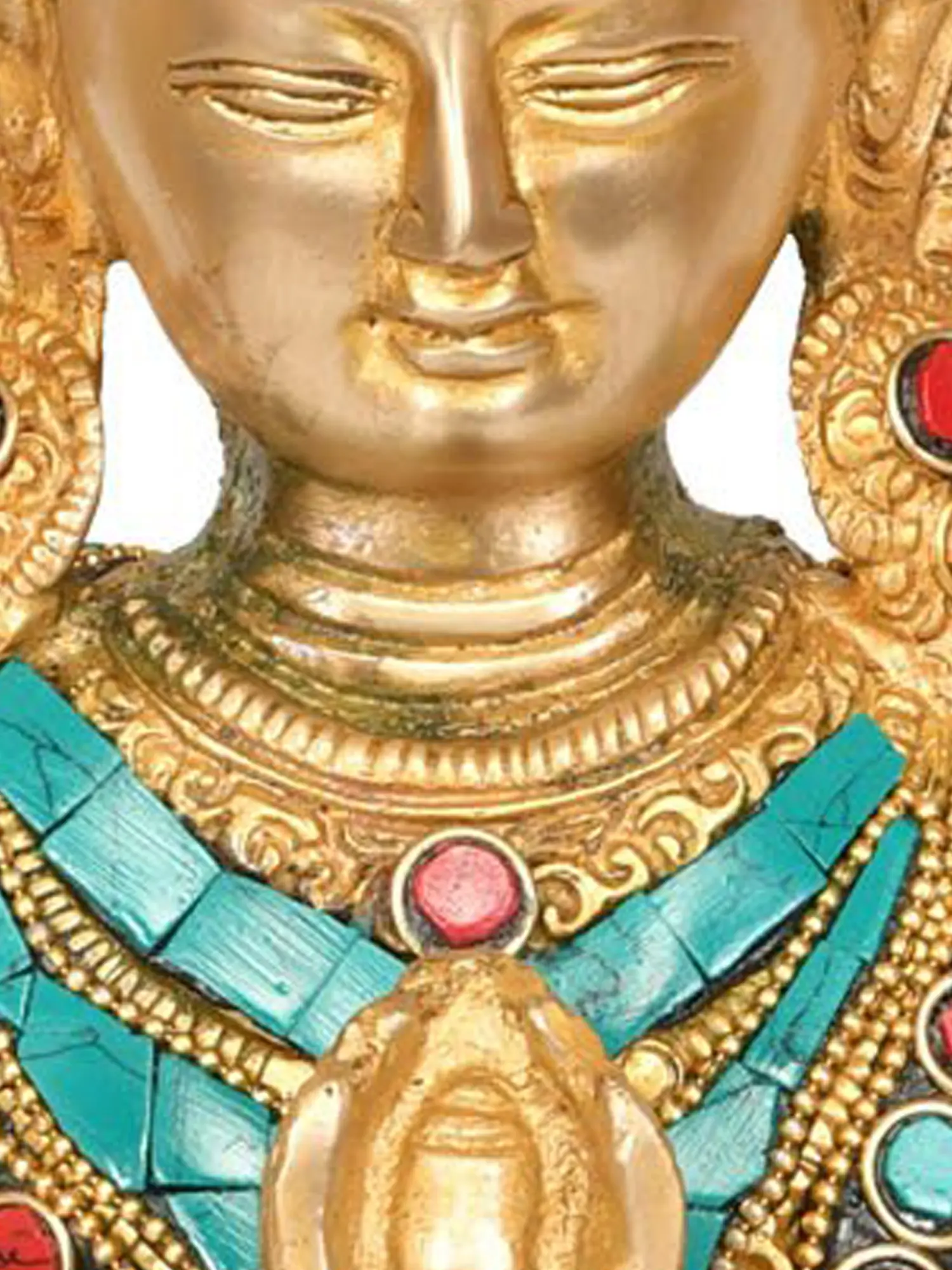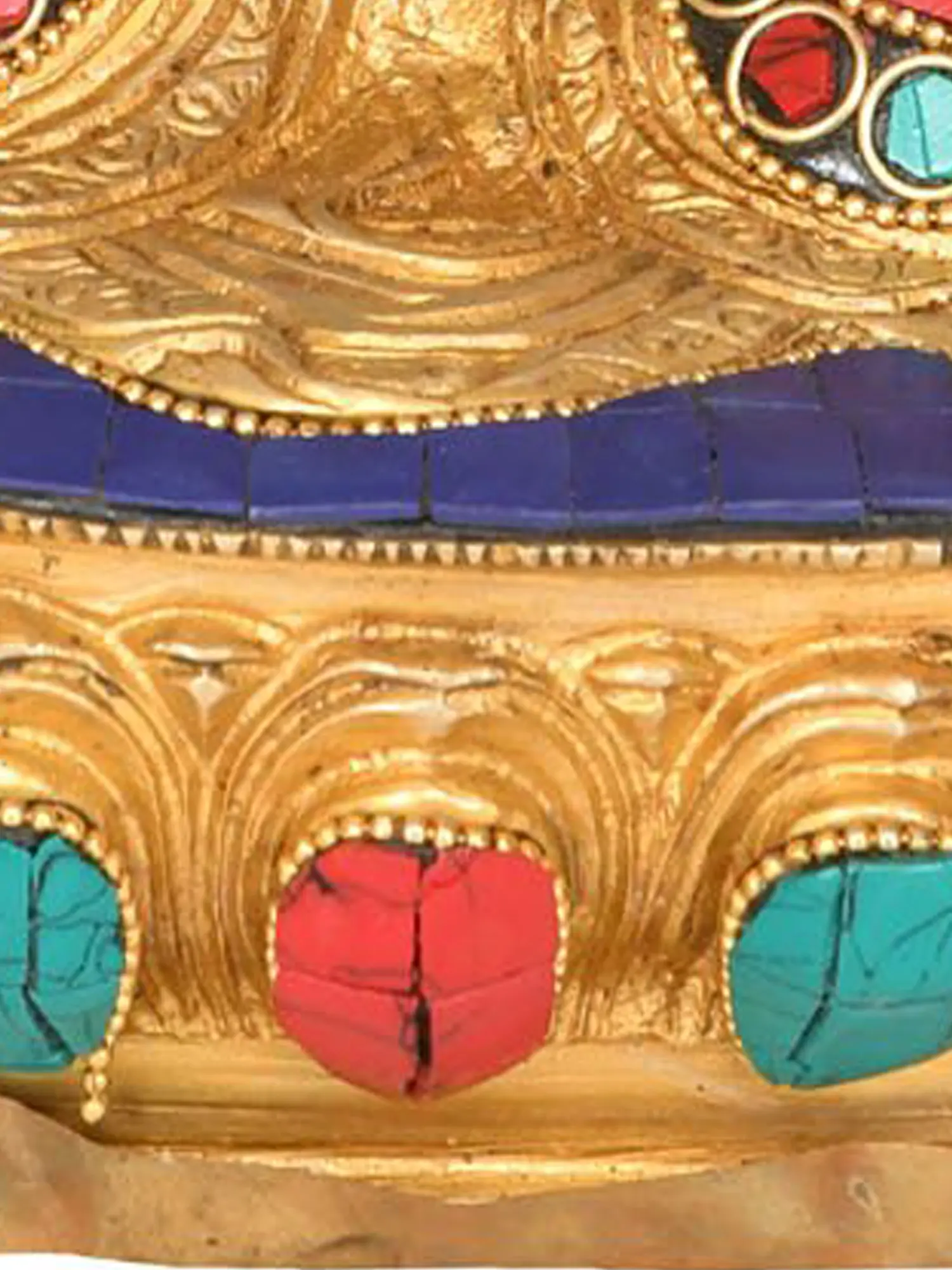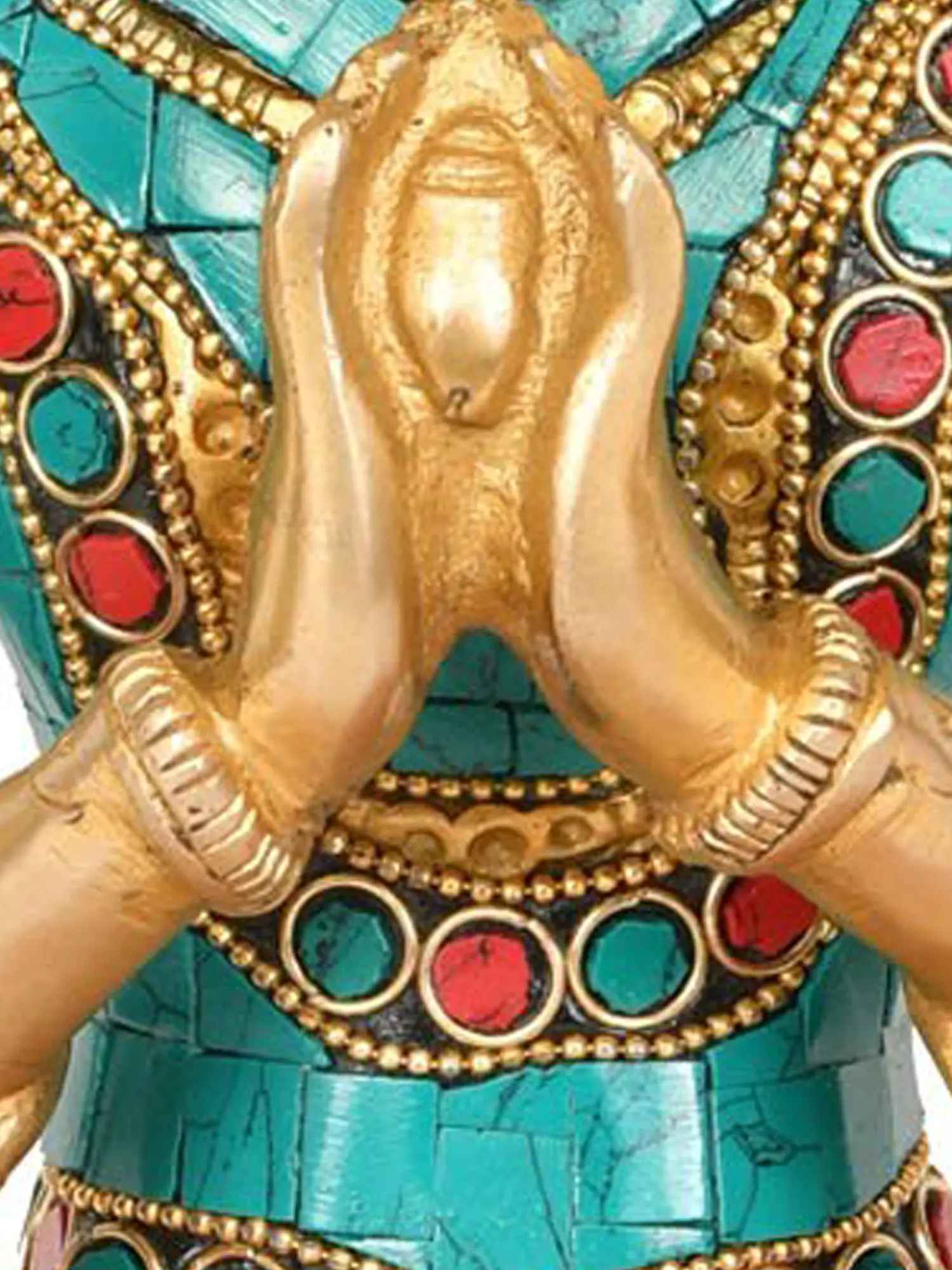 What truly sets this statue apart is its stunning inlay work. Rich turquoise and vibrant red coral gemstones are meticulously embedded into the brass, adorning the deity's robes and headdress. In Tibetan culture, turquoise is associated with sky, healing, and protection, while coral symbolizes life force, strength, and auspiciousness. The harmonious interplay of these precious stones against the gleaming brass creates a visual symphony, enhancing the divine aura of Chenrezig and symbolizing the preciousness of compassion itself. The turquoise, with its sky-like hue, invokes the boundless nature of compassion, while the fiery red of the coral represents its potent energy to overcome obstacles and suffering.