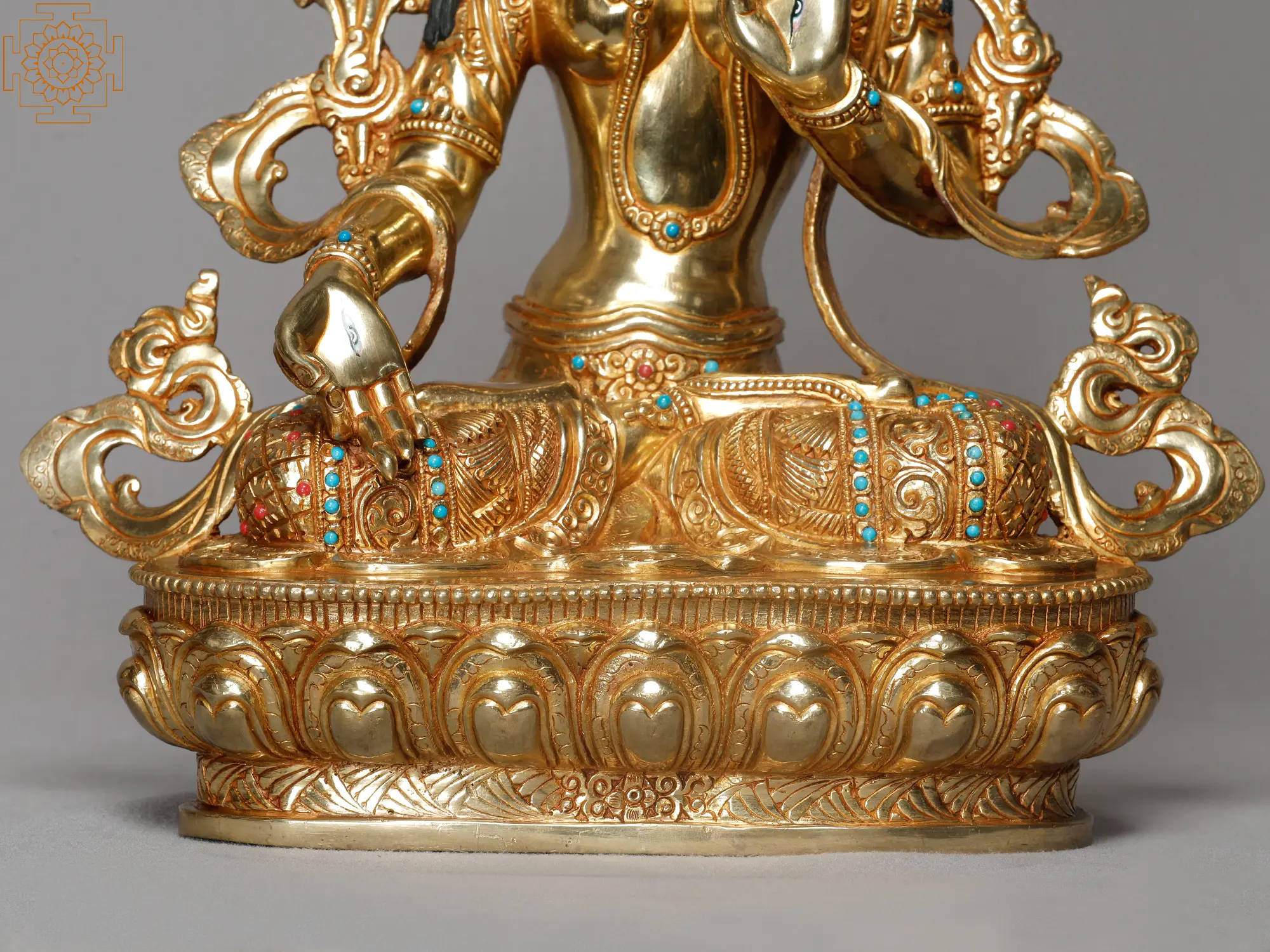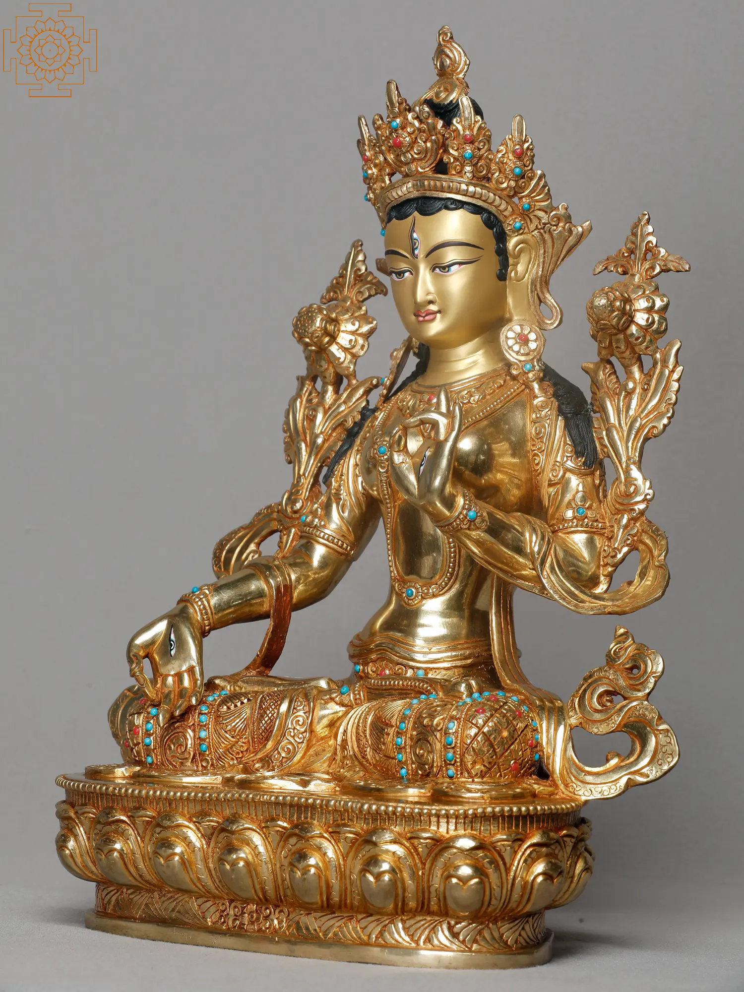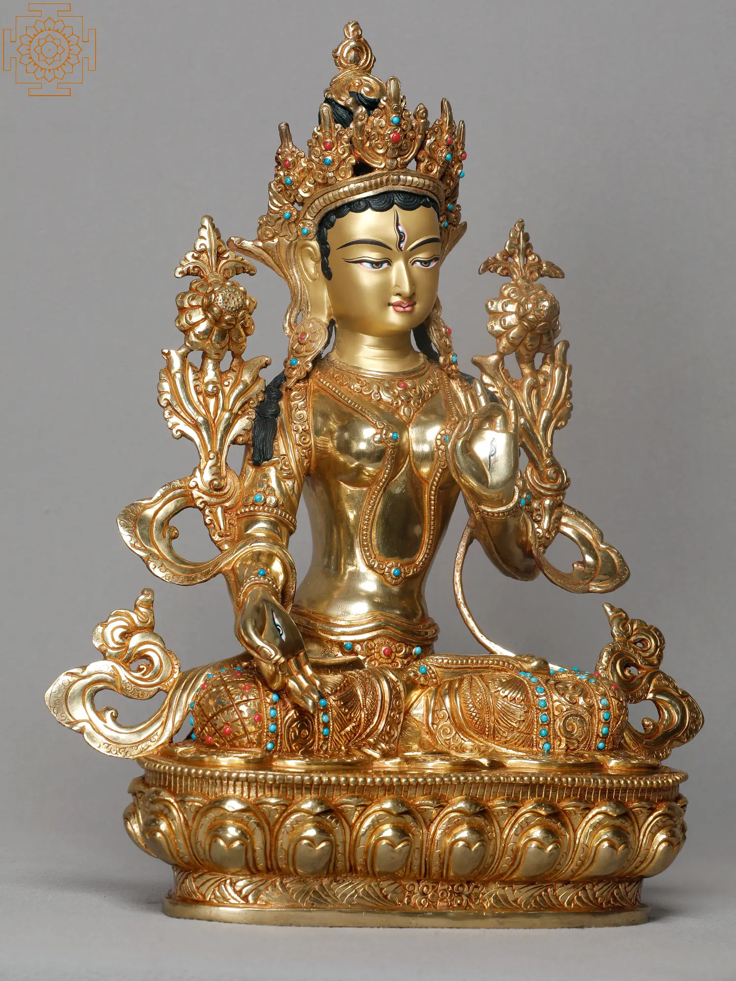 A resplendent copper statue of White Tara, radiant in her compassionate presence. The statue, meticulously made, captures the divine essence of White Tara, a bodhisattva revered for her boundless compassion and nurturing qualities. Call her White Tara or Sita Tara she lives in the heart of Tibetan Buddhism, well praised for her peaceful manner and healing abilities. She is seated gracefully, her posture excluding tranquility and benevolence. The copper gleams with a warm, inviting glow, enhancing the sacred atmosphere surrounding the statue atmosphere. White Tara’s delicate features are finely sculpted, portraying serenity and timeless beauty.