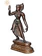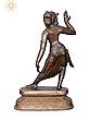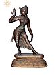 This sinuous and dynamic sculpture, created in the ‘madhuchista vidhana’ or lost wax technique of bronze casting, presents the majestic image of a dancing figure striking an iconic pose with her right hand raised up and her left hand hanging pendent. In her fluidic movement, we see her left leg outstretched, revealing her finely draped clothing. The ‘sthapati’ has meticulously detailed every single pleat, presenting in front of us an ornate vision of the ancient dancer that was highly respected in Indian households and temples. She is gracefully poised on top of a raised narrow pedestal.