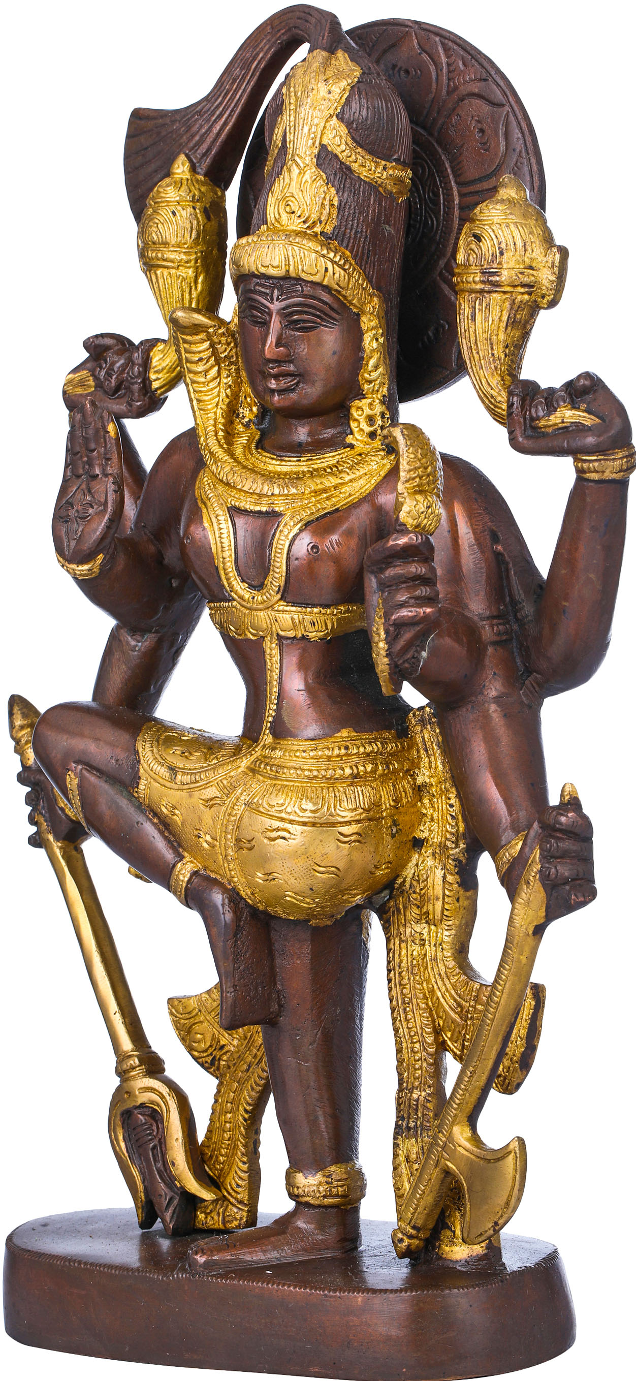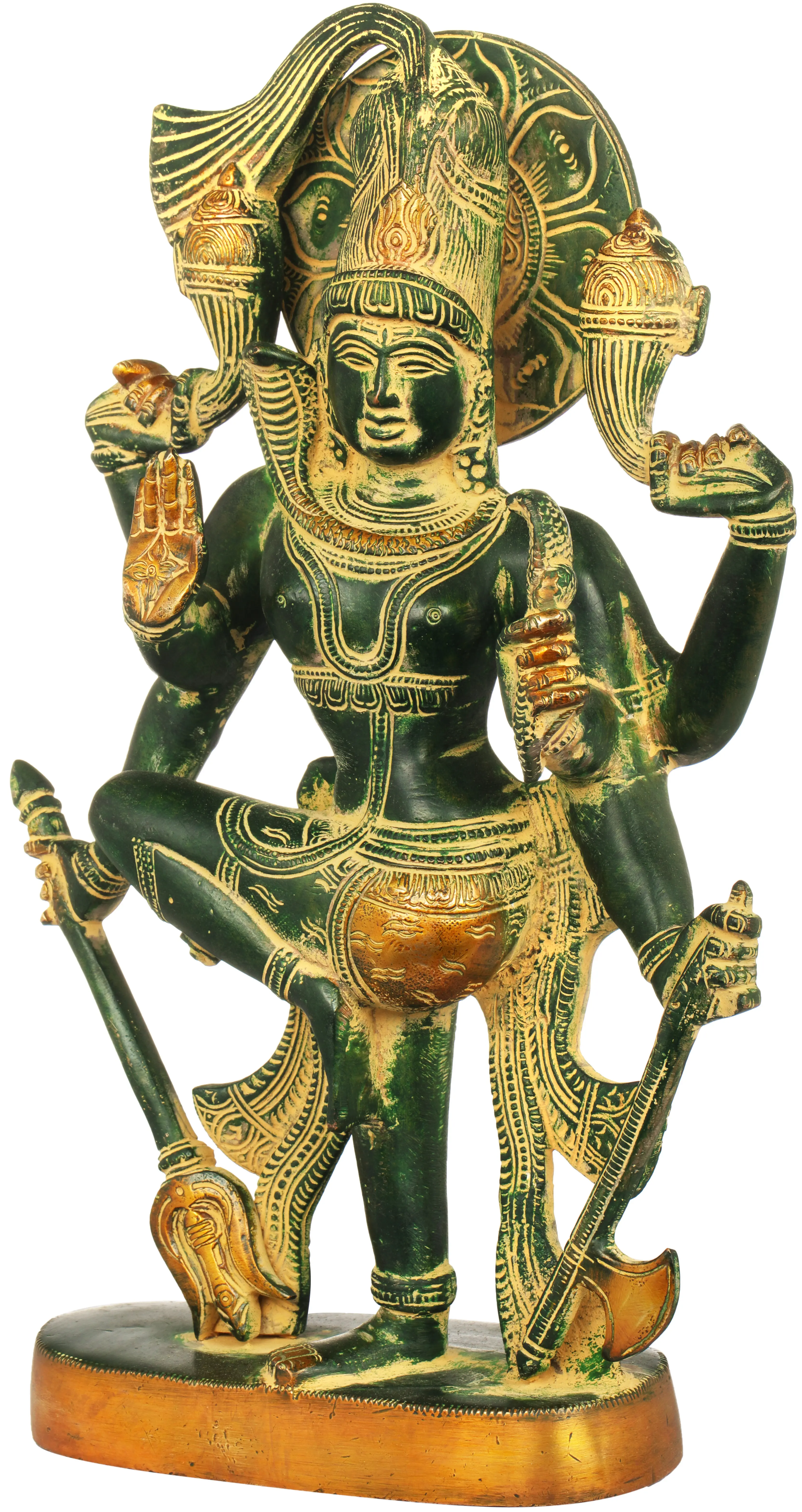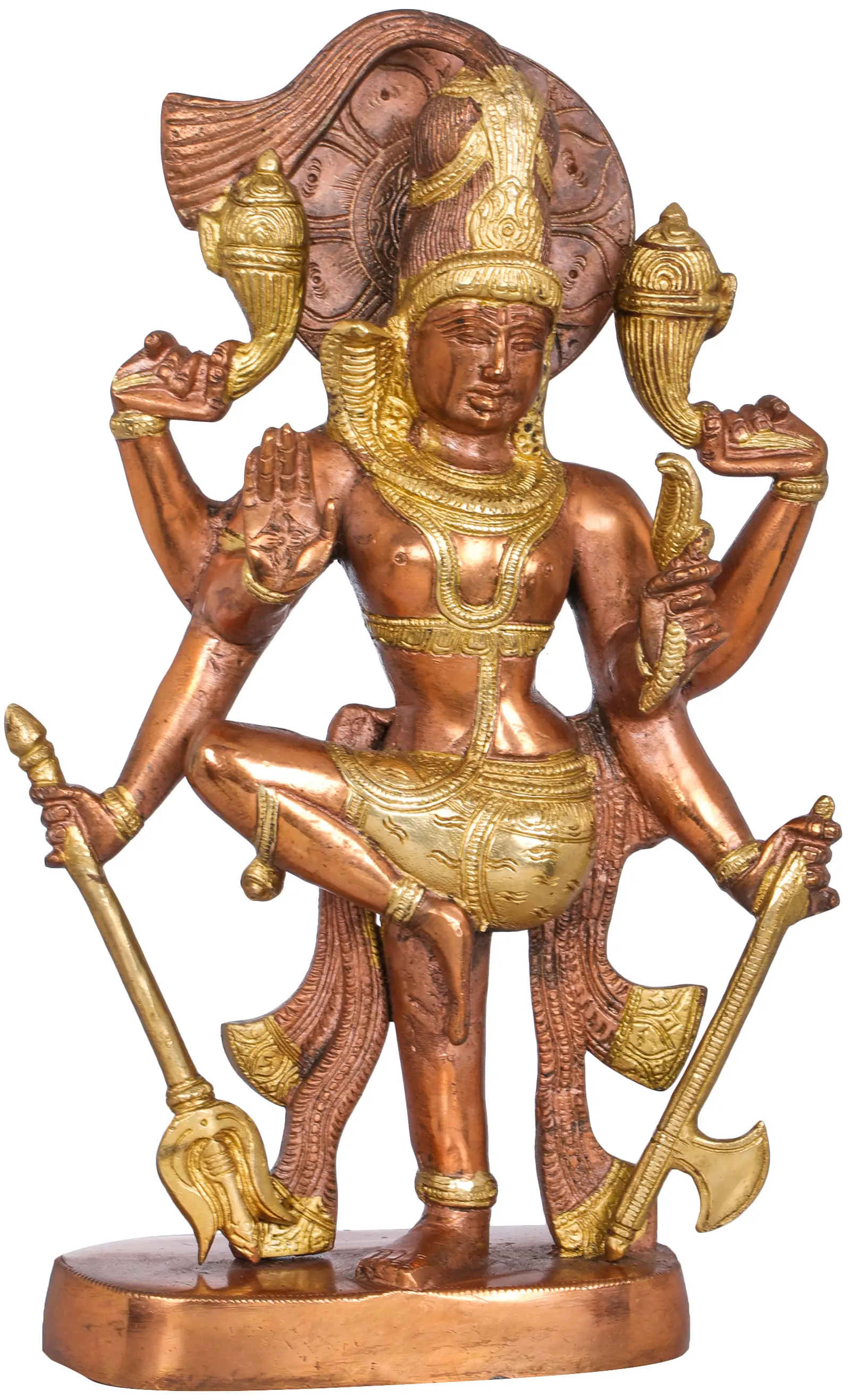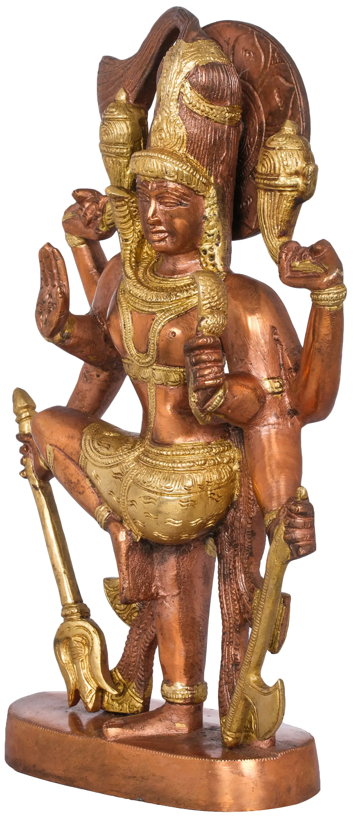 Behold the captivating form of Lord Shiva, the Destroyer and Transformer, captured in this exquisite brass sculpture. Crafted with meticulous detail by skilled artisans in India, this piece embodies the dynamic essence of Shiva's cosmic dance, the Tandava. The statue depicts Shiva in his manifestation as Nataraja, the Lord of Dance, a powerful symbol of the eternal cycle of creation, preservation, and dissolution that governs the universe. His posture is one of energetic motion, with limbs extended and flowing, conveying a sense of boundless energy and divine grace.