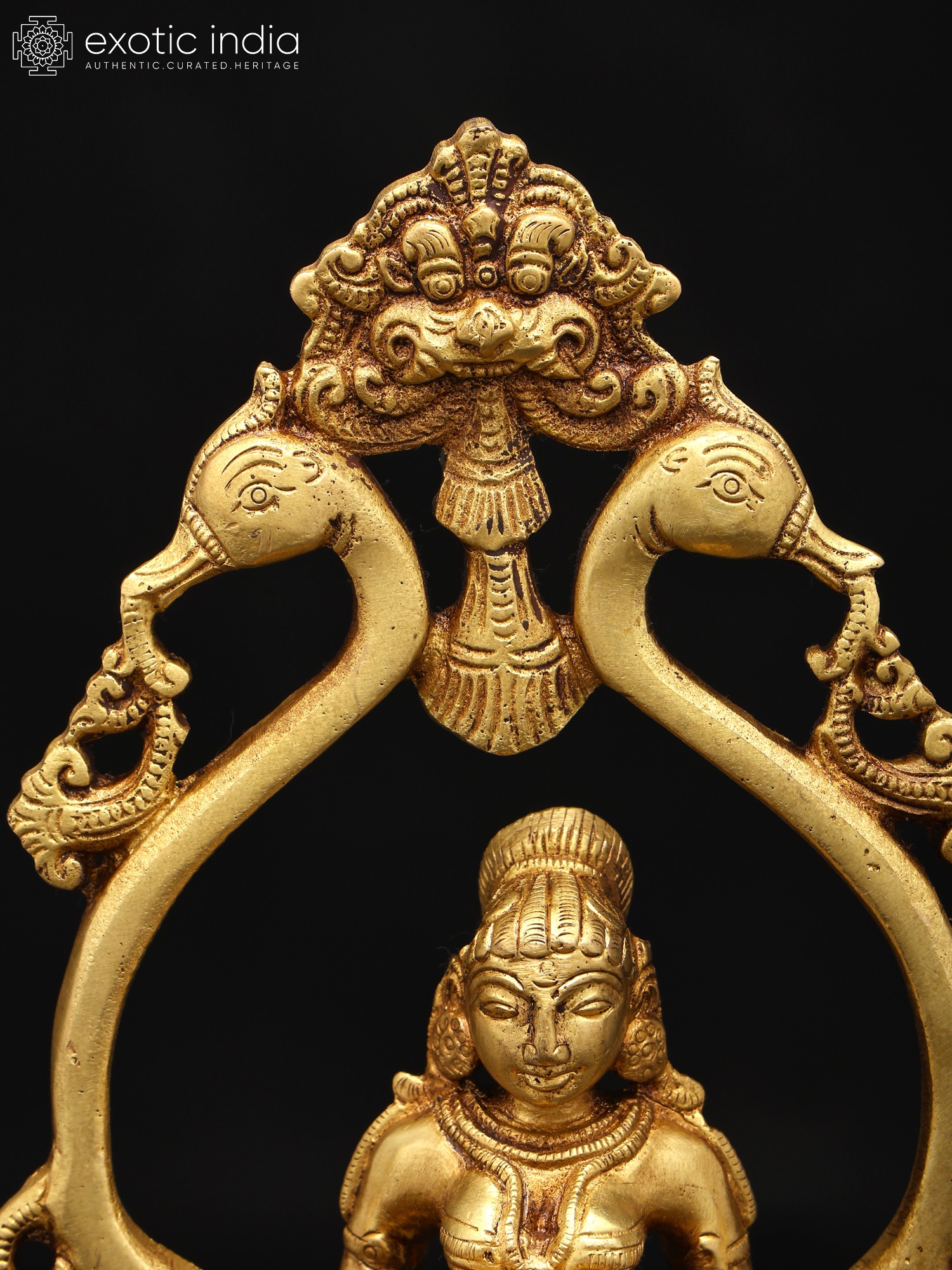 People look for richly adorned and beautifully conceived images of Deepalakshmi for while her richly adorned form assures greater prosperity a beautiful image assures greater auspices and blesses with progeny. Perhaps for such reasons, the artist of this statue has taken special care to beautify each part of the image as also her ornamentation and ensemble : her elegantly pleated and embellished ‘antariya’ – lower garment, and ‘stana-pata’. The auspicious character of the image has been enhanced by the peacock-pair, another auspicious icon, that comprise the ‘Prabha’ – aura, of the image.