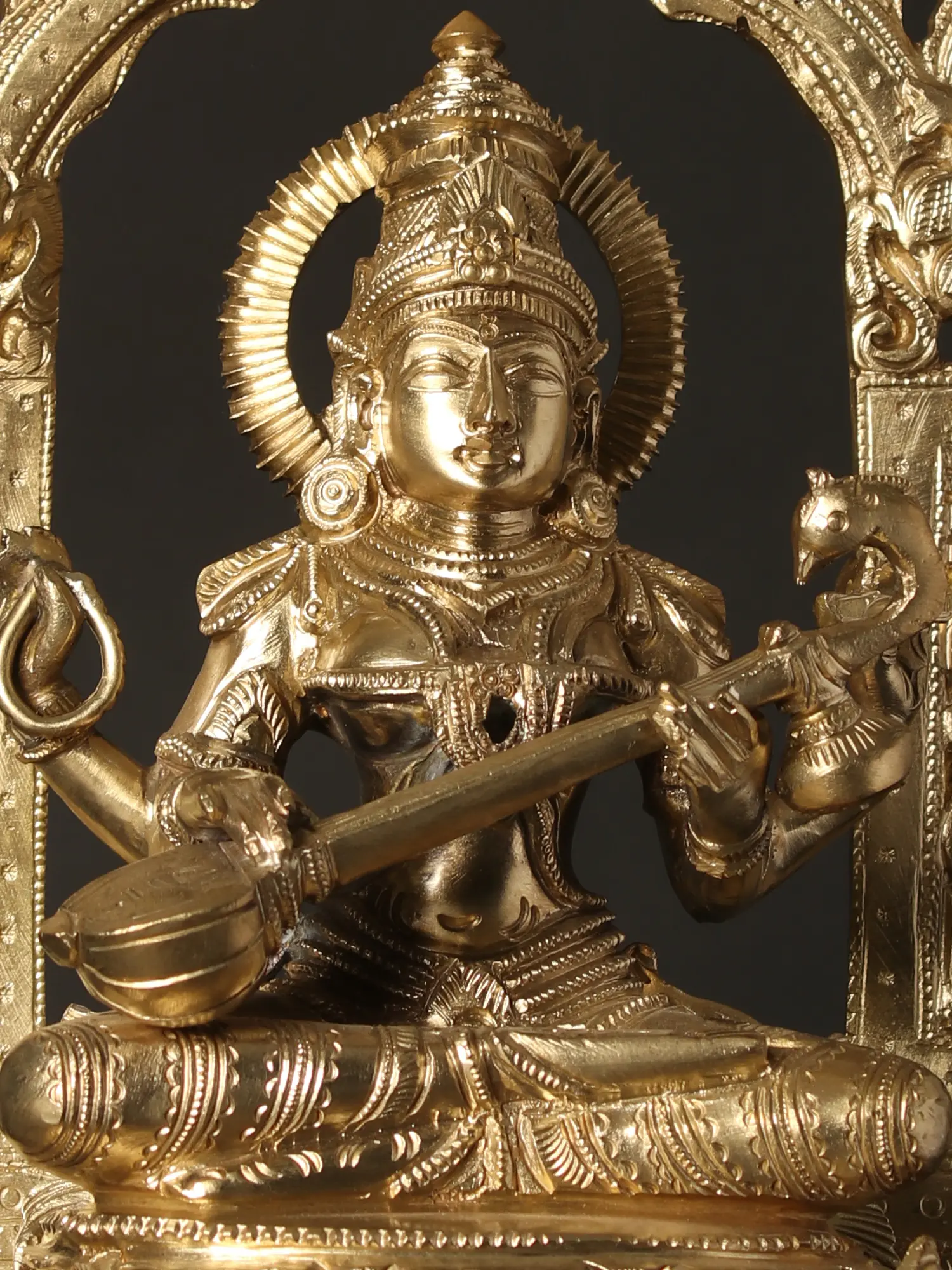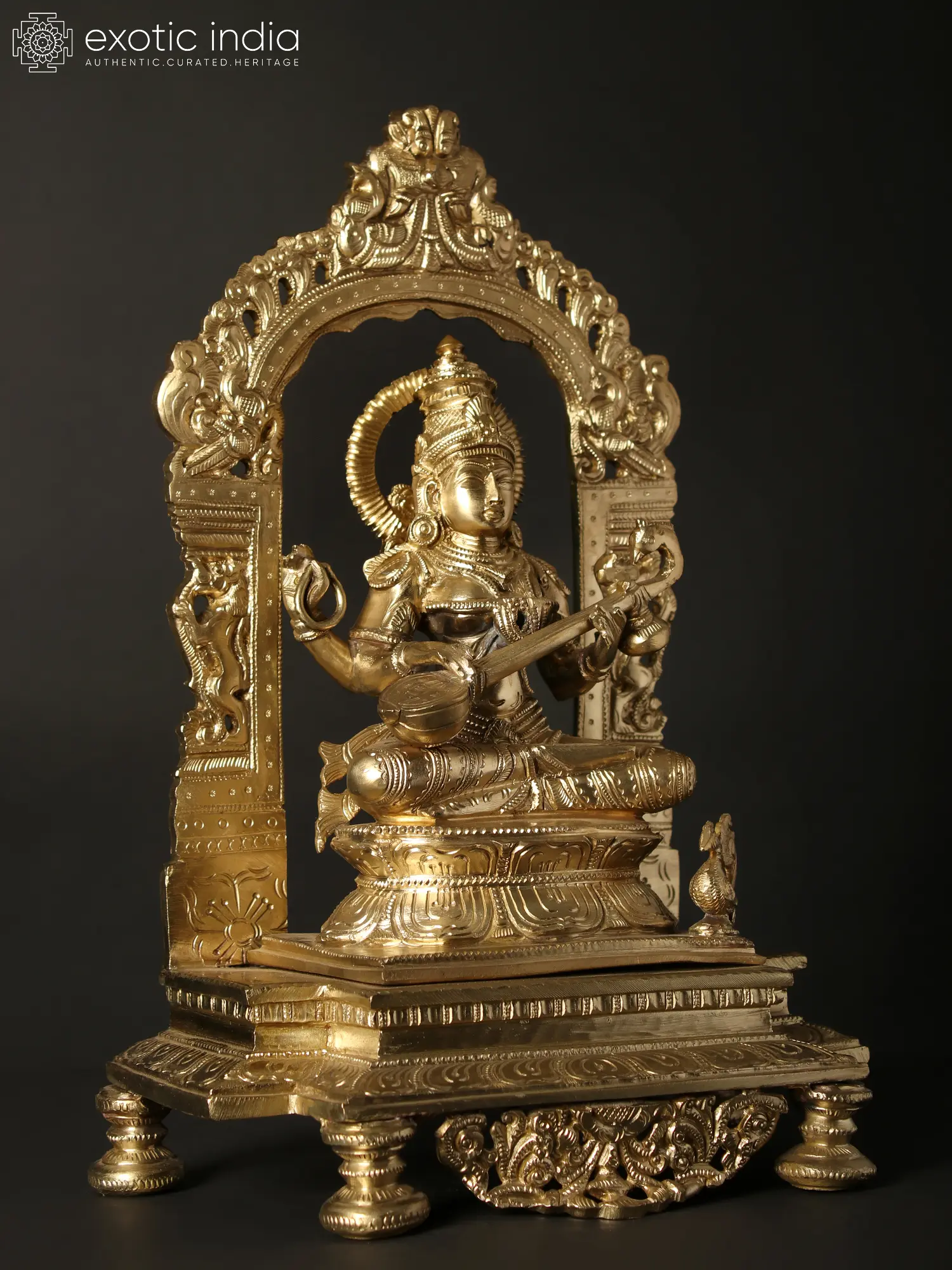 Devi Saraswati is elevated by an elaborate pedestal, seated on a two-tiered lotus throne, a symbol of divinity and wisdom.