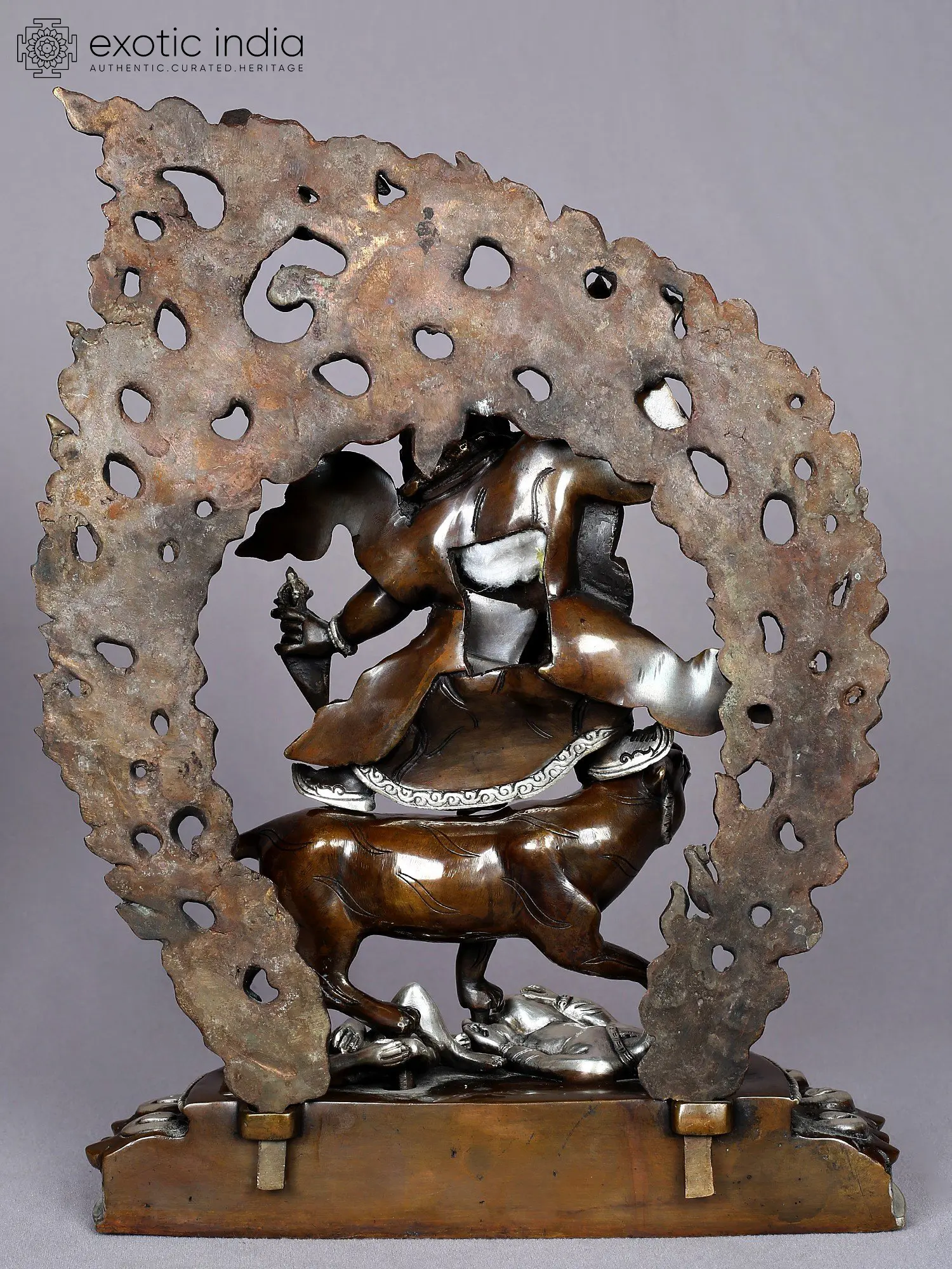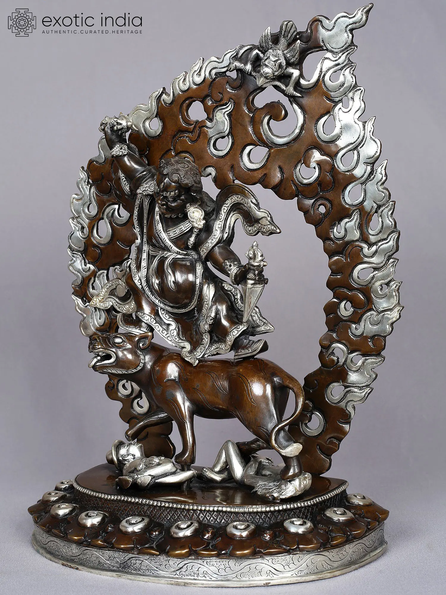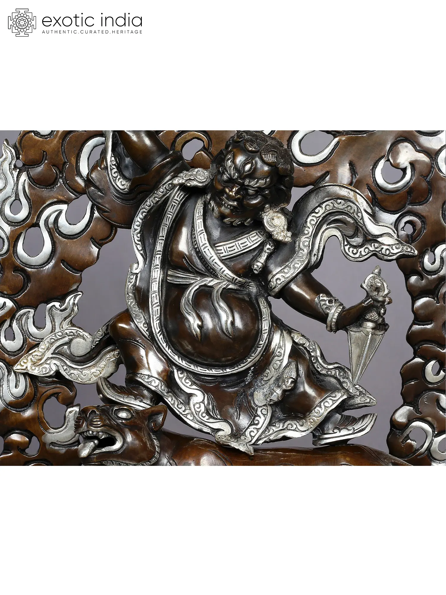 Adorned with bone earrings and a necklace made of freshly severed heads, Dorje Drolo wears robes in various colors, reflecting the styles of both a layperson and a monk. He also dons ornate felt boots. His posture is characterized by a bent right leg and an extended left leg. He stands on a fierce tigress, an emanation of his consort Mandarava, surrounded by the blazing orange and red flames of pristine awareness.