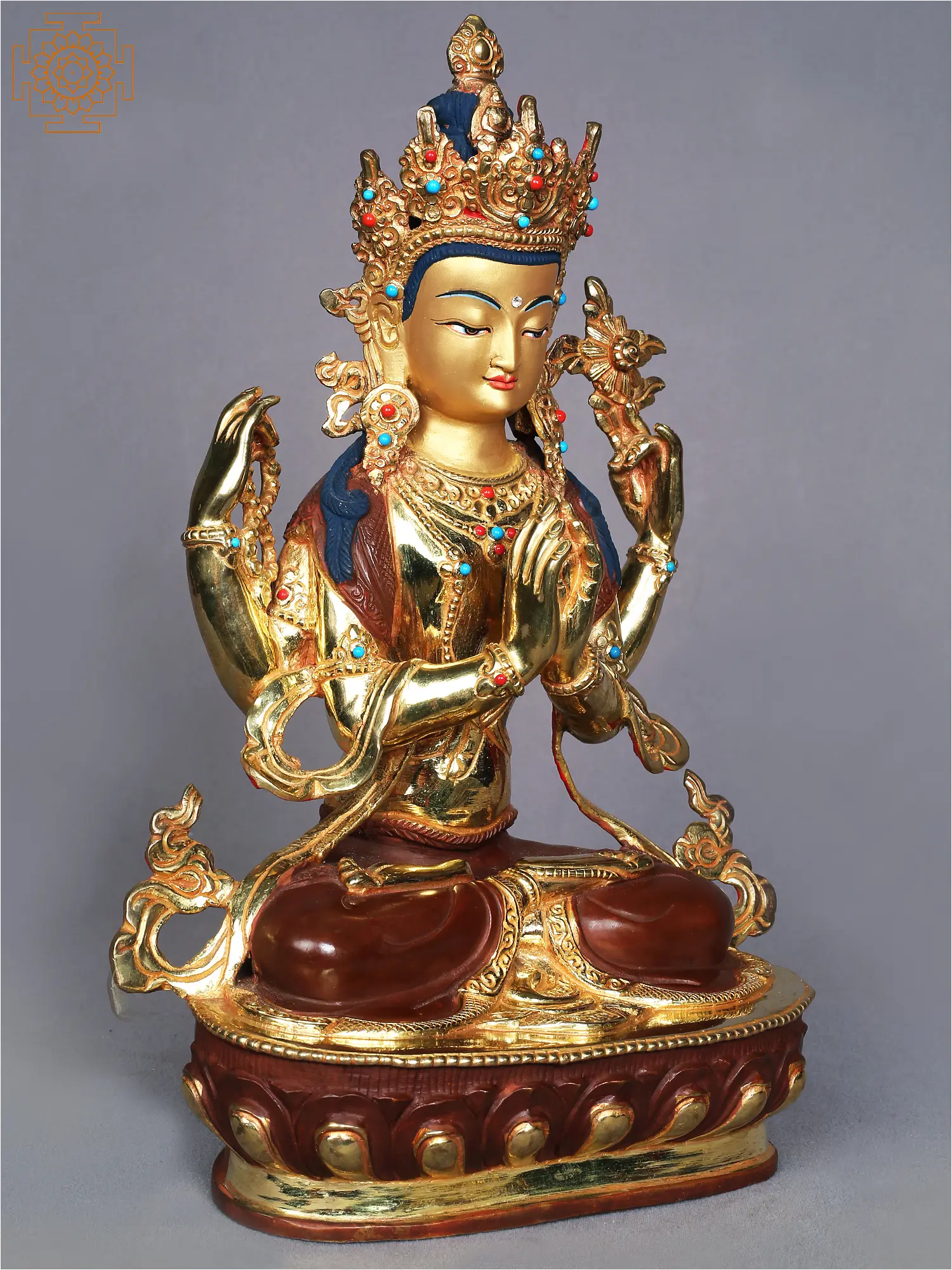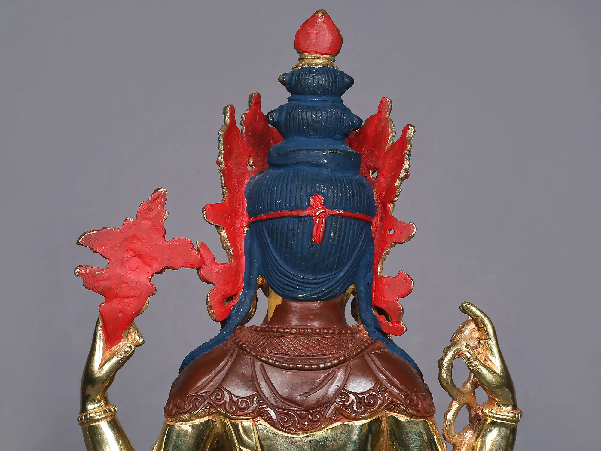 In a state of deep meditation, Avalokiteshvara radiates compassion to all living things. The resonant mantra "Om Mani Padme Hum" is a melodious invocation recited by practitioners to call forth the compassionate presence of the bodhisattva and cultivate an empathic heart.