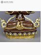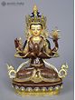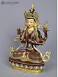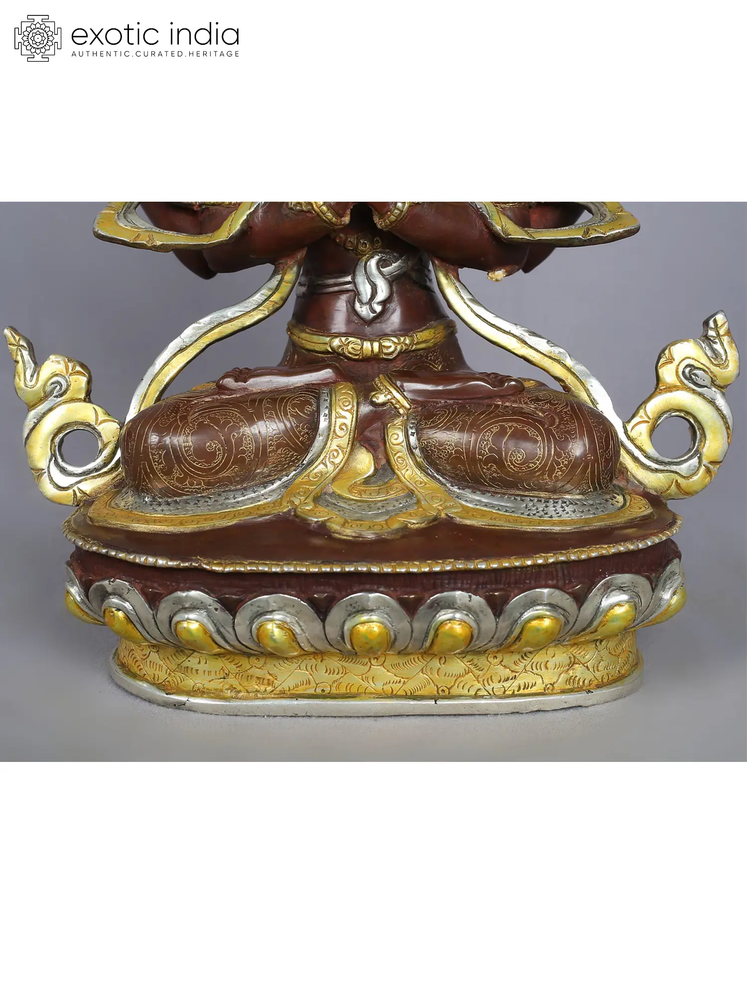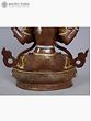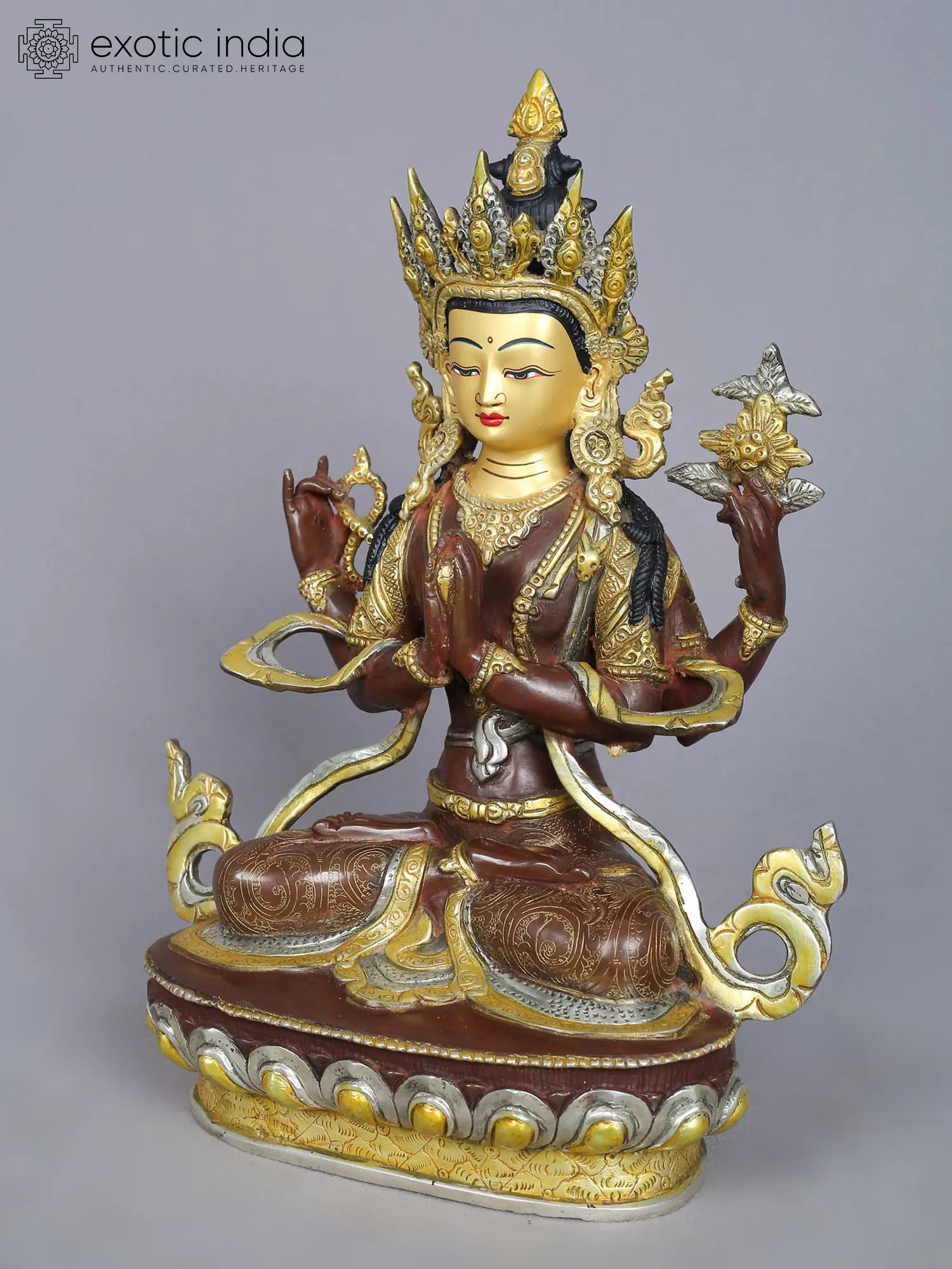 A resplendent five-jeweled crown graces his head, representing the five Buddha families. Seated against a serene backdrop of hills and lakes, Avalokiteshvara exudes tranquility with a luminous aura. In his multiple arms, he cradles essential Buddhist symbols. He wears an antelope skin over his shoulder, symbolizing his compassionate nature. His regalia includes earrings, bracelets, a vase, a rosary, and more. His eleventh head is believed to be the spiritual progenitor of Amitabha Buddha.