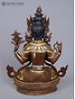 Avalokiteshvara is adorned in regal attire, a reflection of his princely lineage. Silken robes drape his figure, resembling Indian royal attire. He is bedecked with an array of exquisite jeweled ornaments, including bracelets, necklaces, and anklets, signifying his mastery of generosity and moral virtue. His long, black hair, typical of a prince, is partially tied atop his head, cascading down his shoulders.