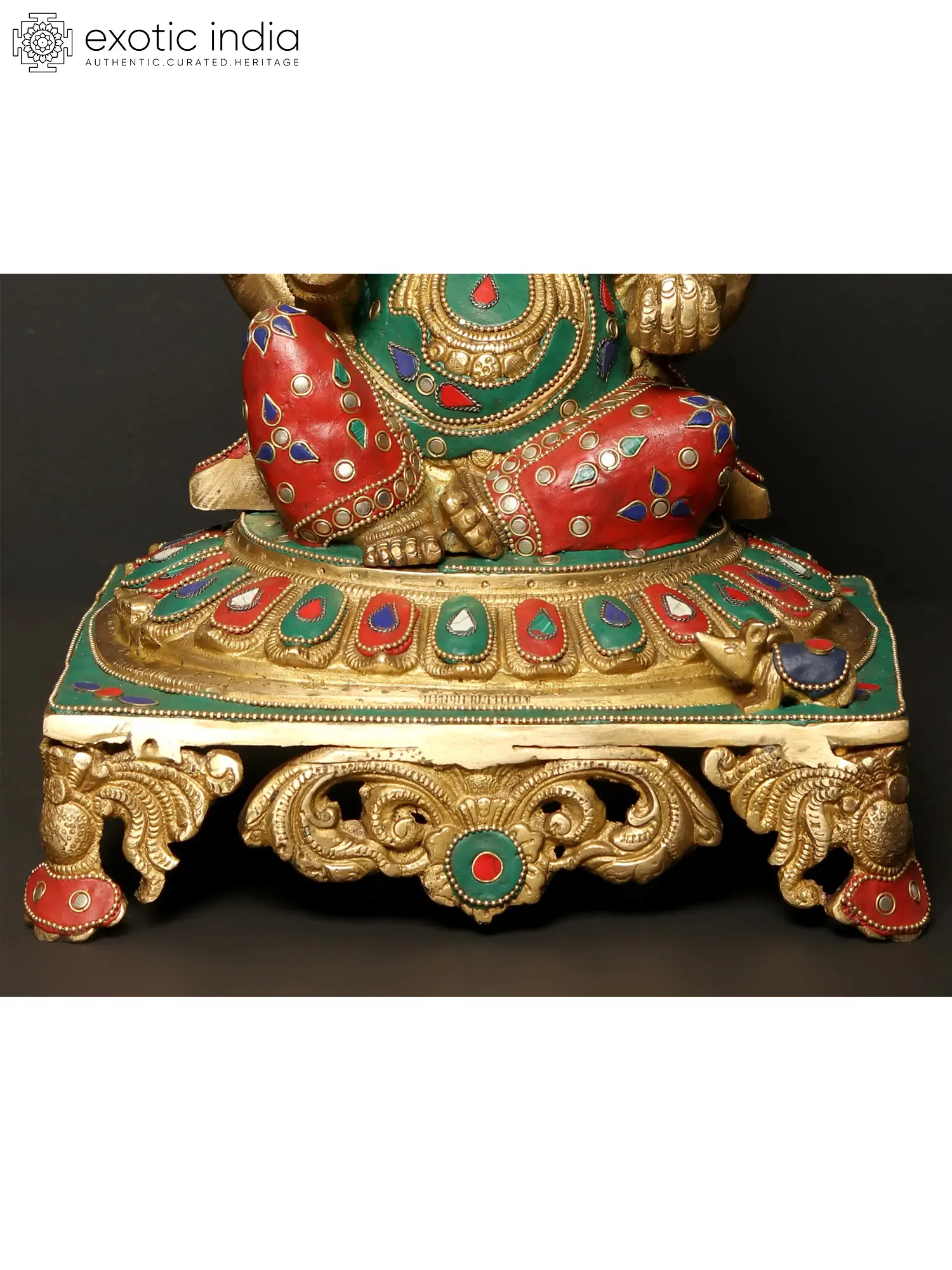 The Four-Armed Lord Ganesha Idol Seated on Pedestal is a lovely brass statue with rich inlay work. Lord Ganesha, the remover of obstacles, is depicted in his Chaturbhuja form with four arms in this magnificent statue. The statue is adorned with brilliant colours like red, green, blue, and gold, conveying wealth and holiness. A Mooshak, or mouse, is shown in a fine blue inlay cloak, looking reverently at Lord Ganesha. Lord Ganesha wears a green garment and is embellished with gold decorations. He is also dressed in a blue dhoti, which adds to his magnificent beauty. This statue embodies Lord Ganesha's beauty and majesty, attracting devotion, prosperity, and blessings into every room it graces.
