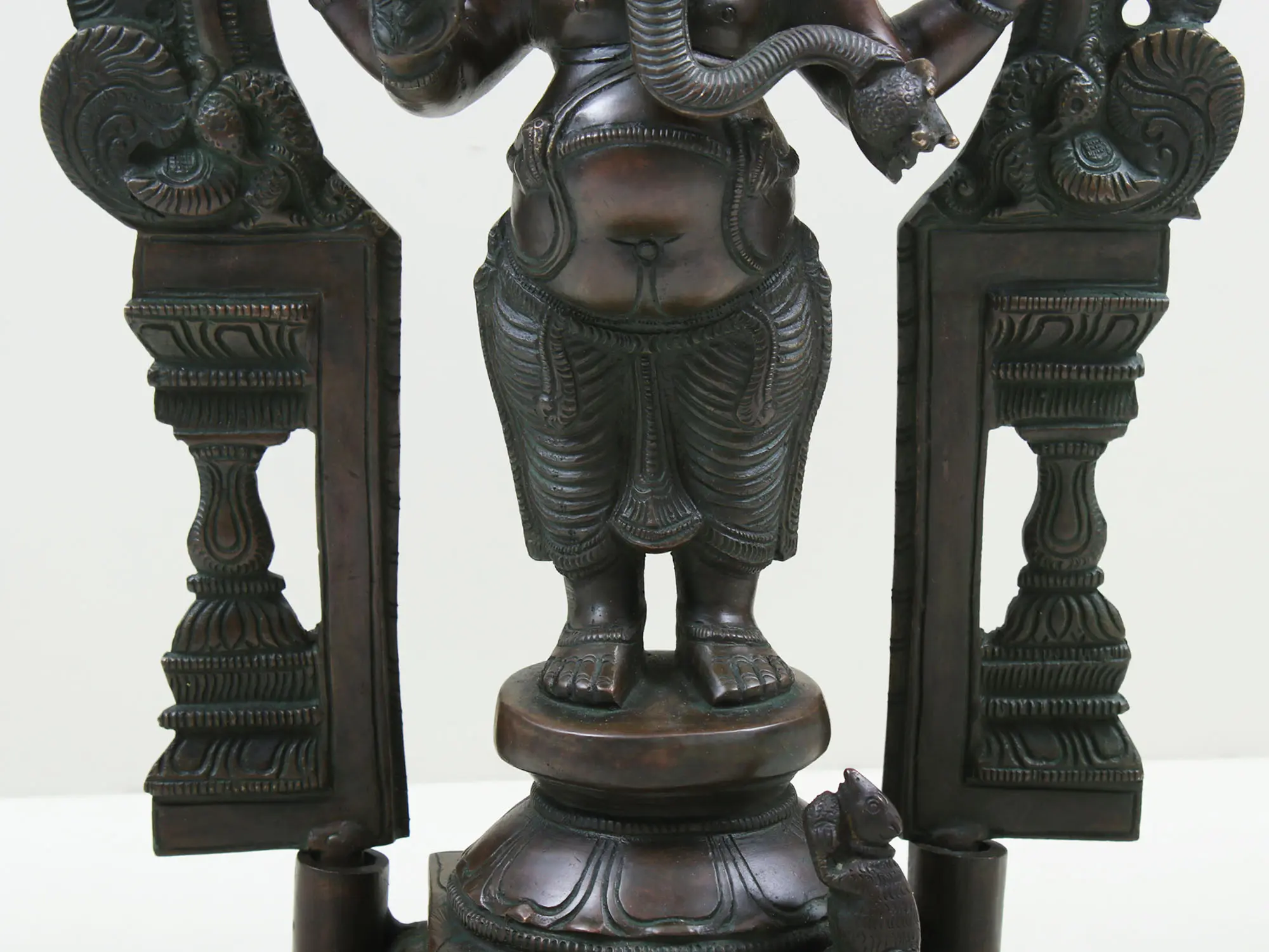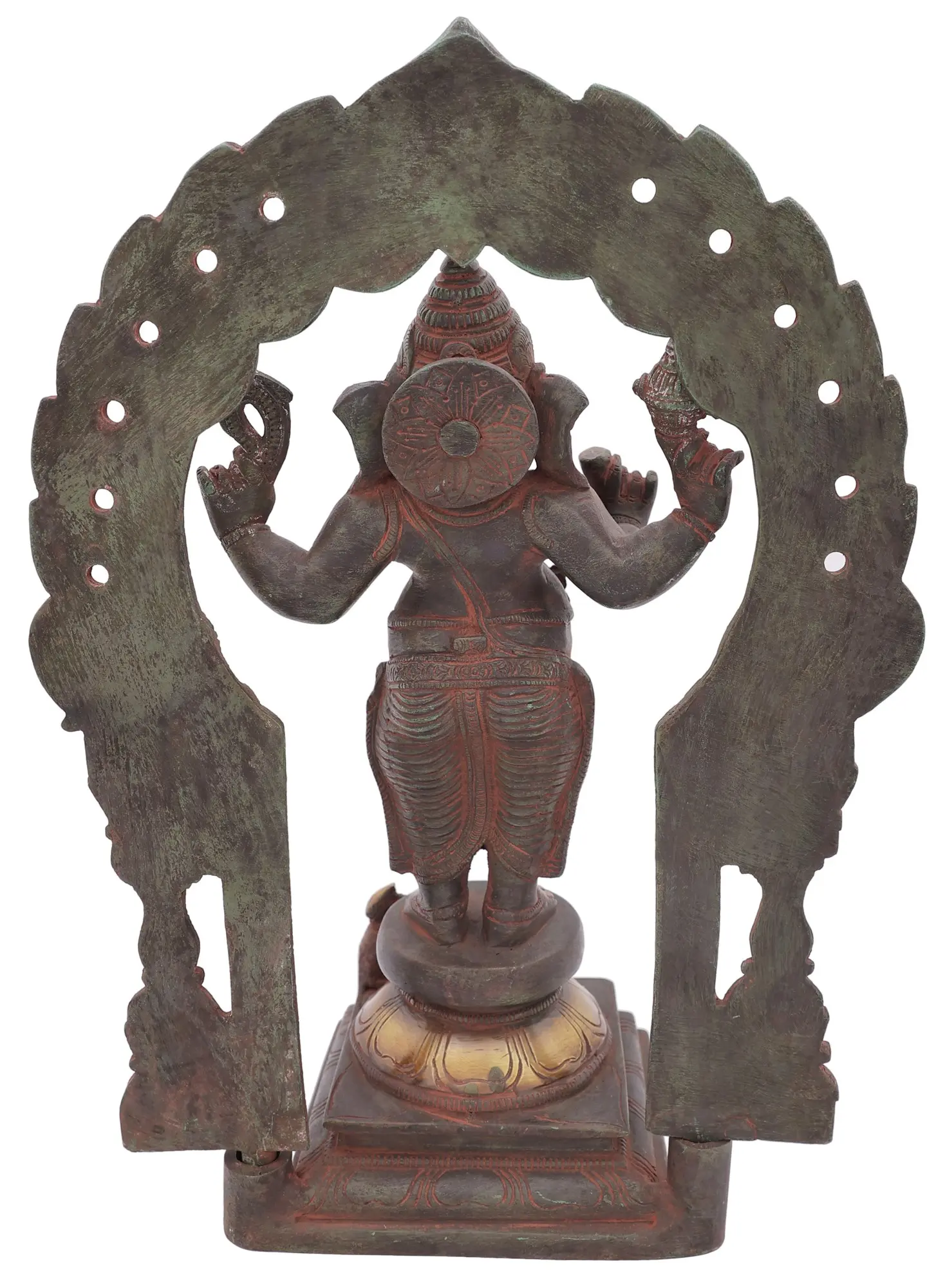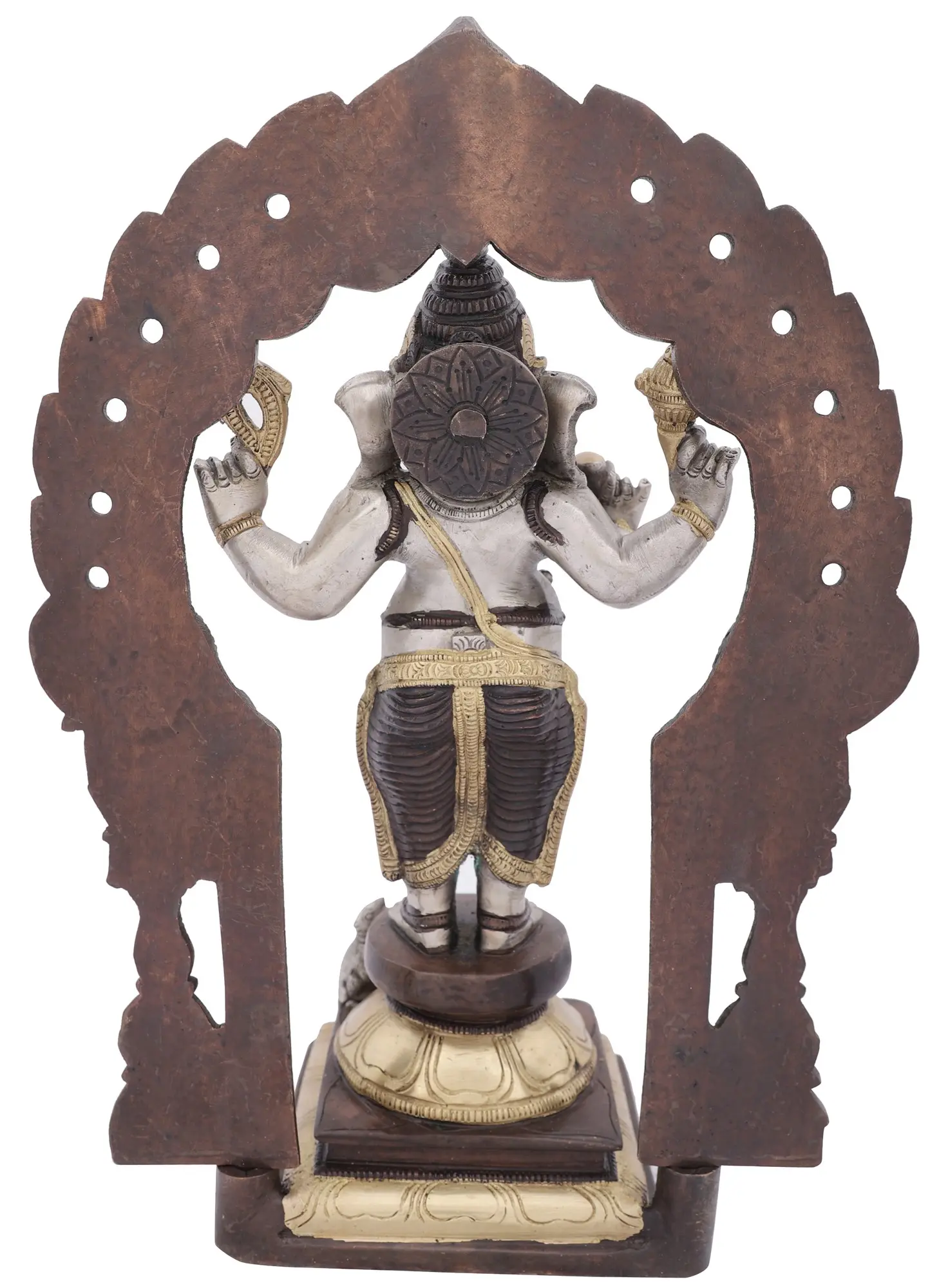The grandeur of this Ganesha statue is further enhanced by the ornate arch that frames him. This decorative element, reminiscent of temple gateways and sacred mandalas, adds an aura of sacredness and completeness to the artwork. The careful sculpting of the floral motifs and architectural details on the arch and pedestal showcase the skill and dedication of the artisans. The rich, dark patina of the brass lends an antique feel, suggesting a lineage of tradition and devotion passed down through generations. Placing this sculpture in your environment is believed to invite positive energy, prosperity, and spiritual well-being. It serves as a constant reminder to approach challenges with wisdom and perseverance, knowing that the Remover of Obstacles is always present. Whether you are seeking to usher in a new venture, overcome personal hurdles, or simply wish to infuse your surroundings with divine grace, this four-armed standing Ganesha in brass is a powerful and beautiful embodiment of these aspirations. It is a timeless treasure that will be cherished for years to come.