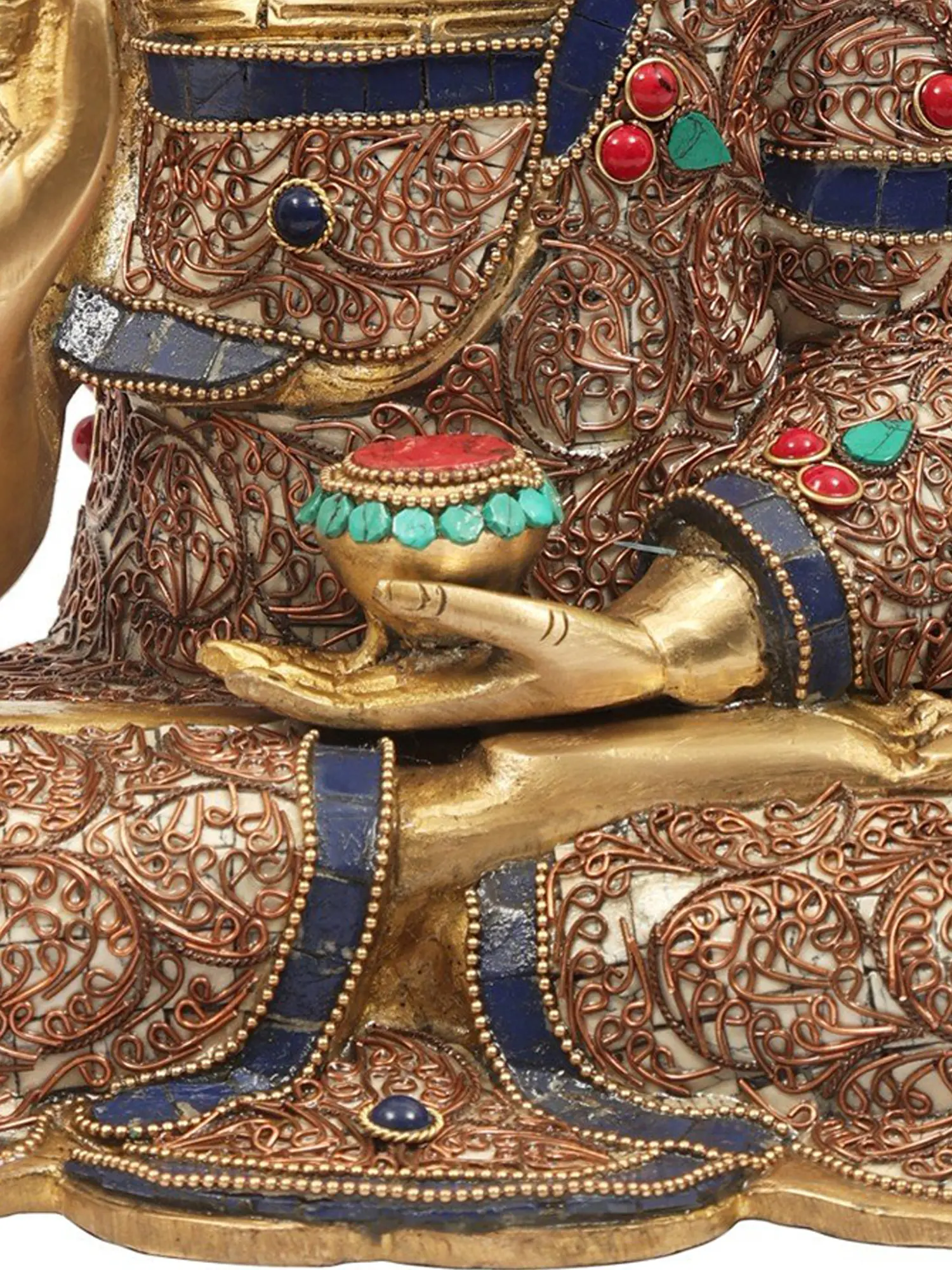 The artistry of this statue is further elevated by its stunning inlay work. Rich, vibrant gemstones are expertly set into the intricate patterns adorning the Buddha's robes. These carefully chosen stones, such as ruby red and turquoise green, not only add a visual splendor but also carry symbolic significance. Rubies have long been associated with vitality and protection, while turquoise is believed to promote healing and wisdom. The delicate scrollwork and geometric motifs intricately woven into the fabric of his garments speak to the complexity and beauty of the universe, a universe illuminated by the Buddha's teachings. The deep blue accents, reminiscent of lapis lazuli, evoke the vastness of the sky and the depth of spiritual understanding.
