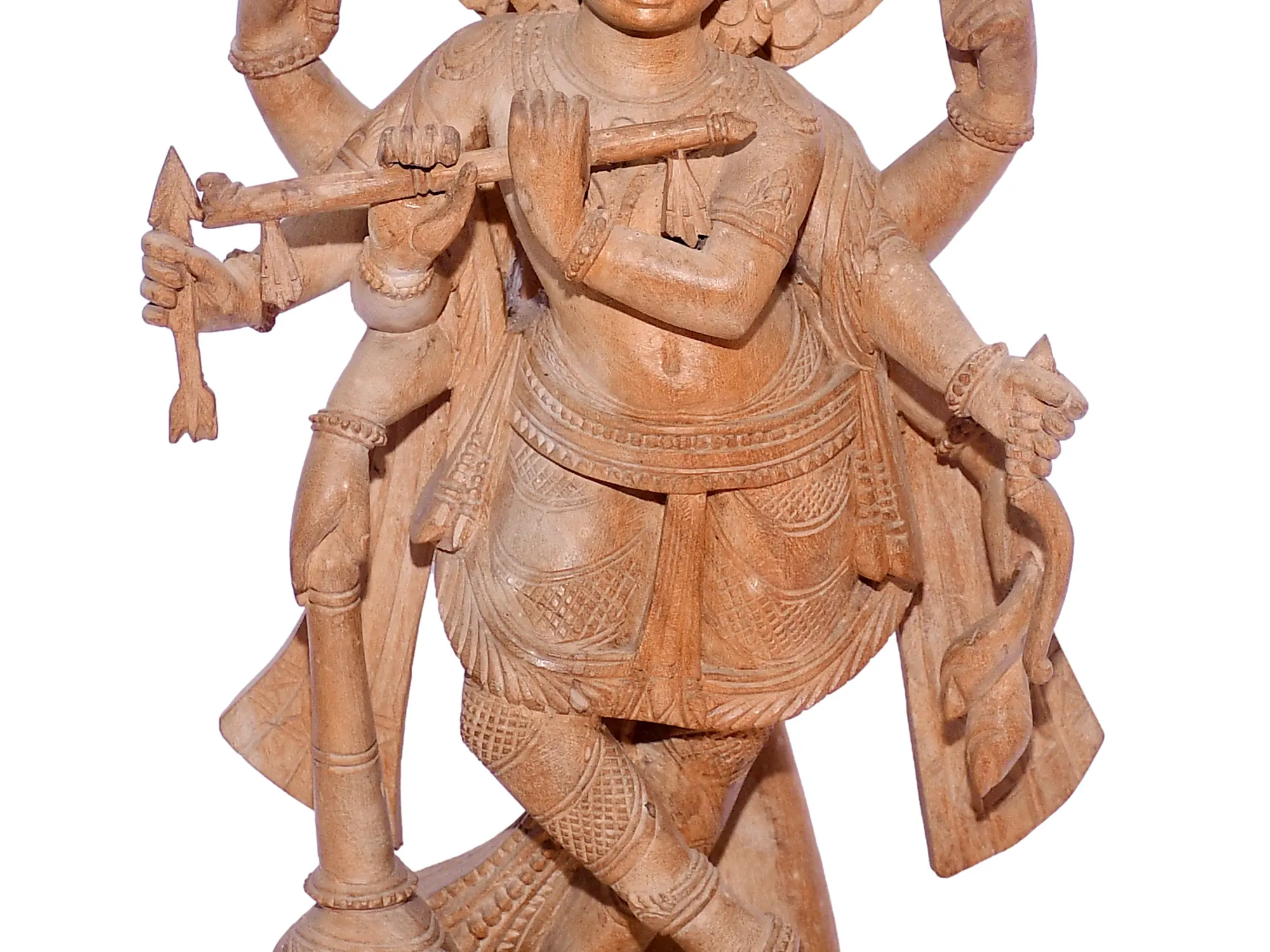 This wooden sculpture is more than just an art piece; it is a vessel of spiritual energy, a tangible representation of ancient tales and beliefs. The natural grain of the wood adds a unique warmth and character to the piece, making each sculpture a one-of-a-kind creation. The craftsmanship is evident in every curve and detail, showcasing a deep understanding of form and symbolism. Bringing this sculpture into your space is an invitation to connect with the divine, to infuse your surroundings with peace, protection, and an enduring sense of spiritual beauty. It stands as a profound reminder of the multifaceted nature of the divine, capable of both nurturing melodies and unwavering strength.