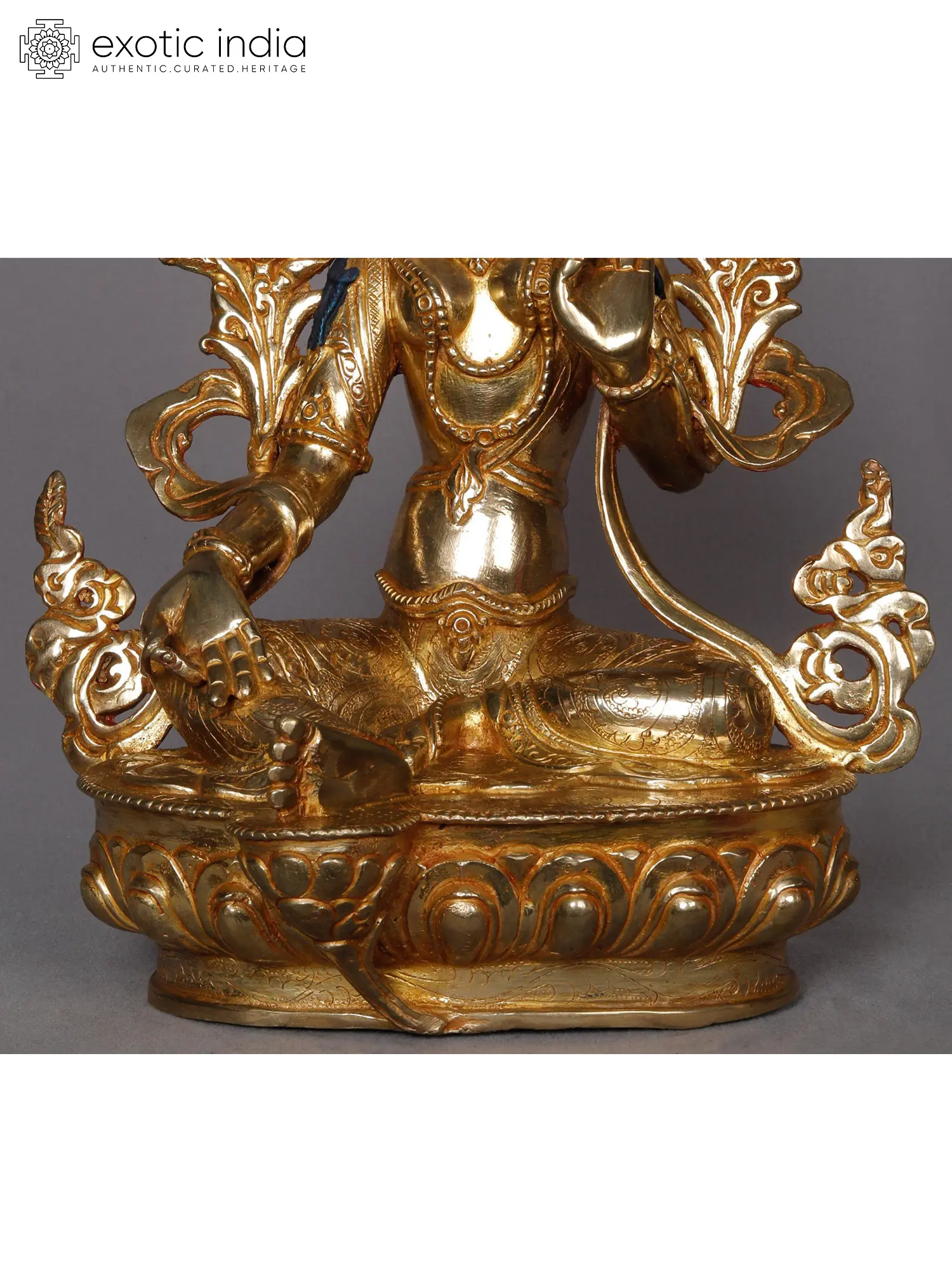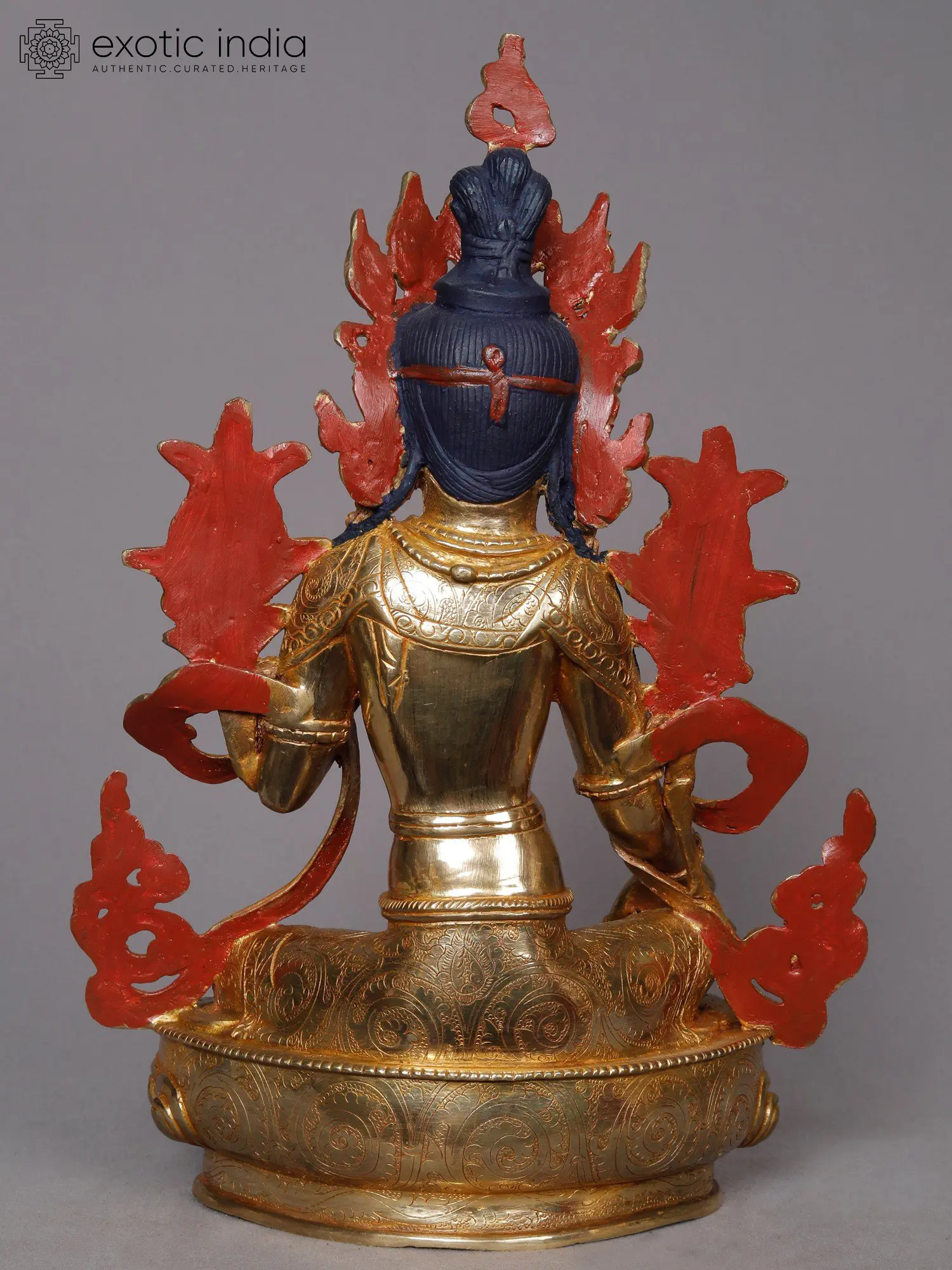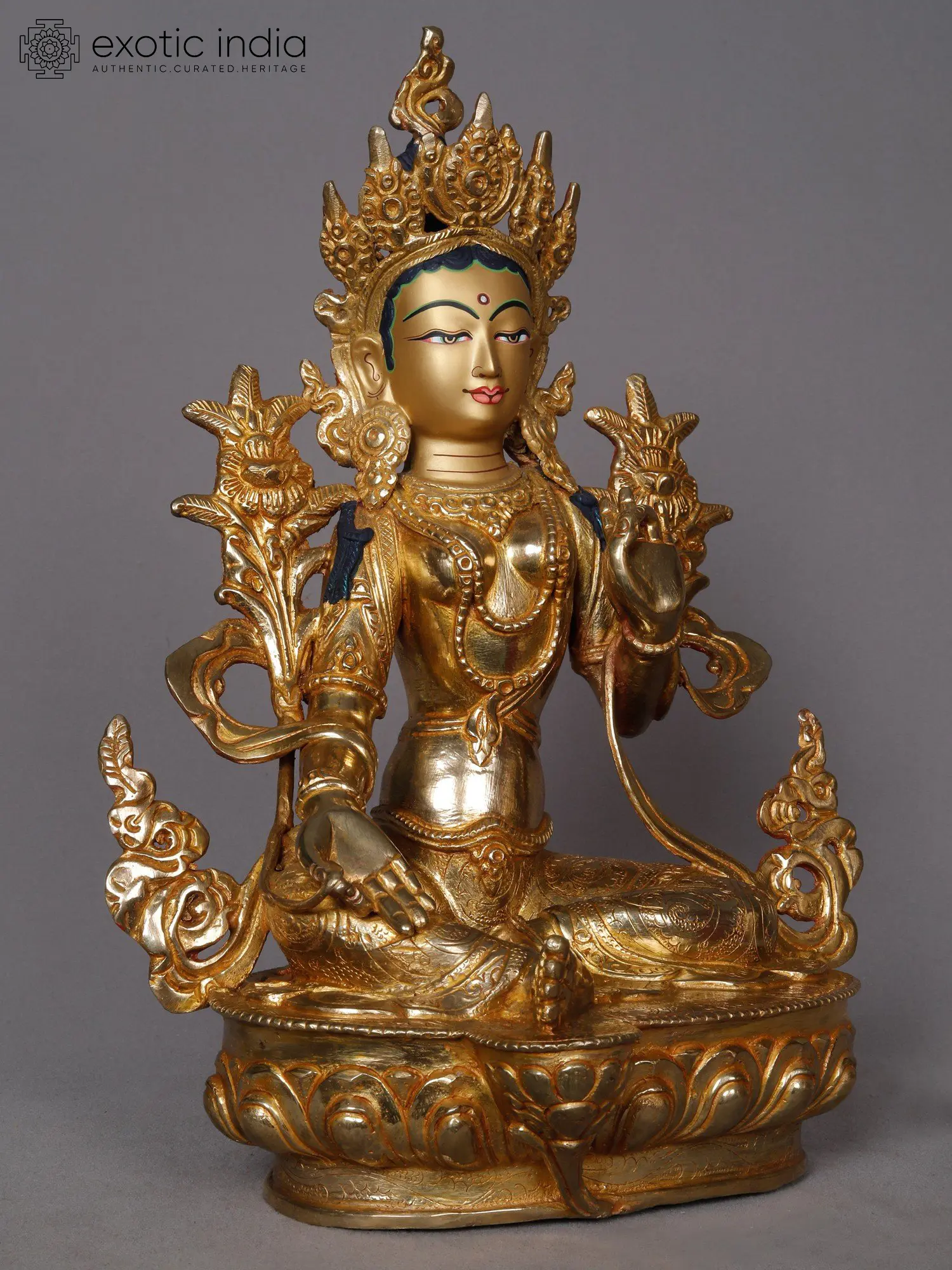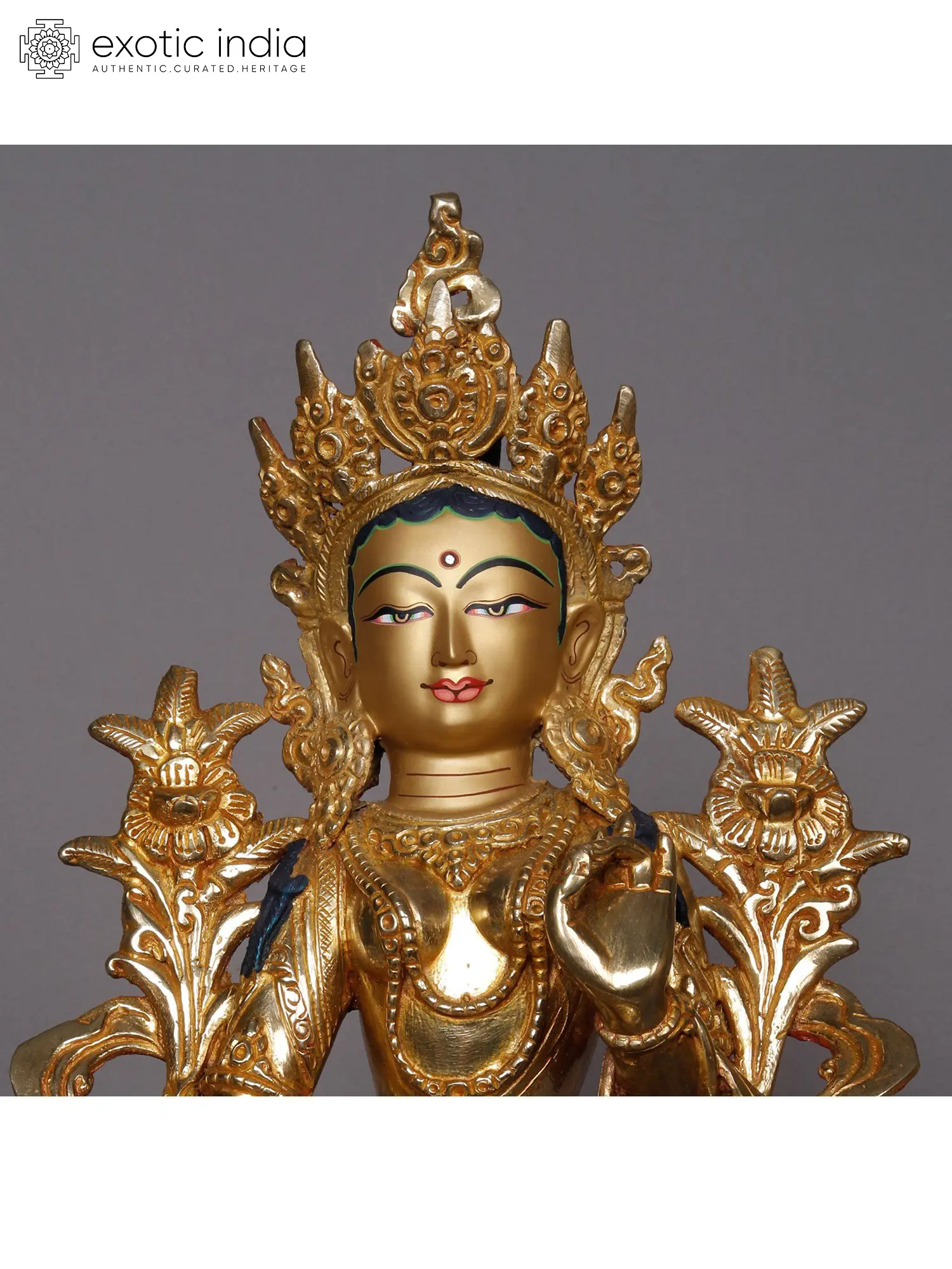 This magnificent statue captures the serene and compassionate form of Green Tara, a beloved deity in Tibetan Buddhism. Crafted with exquisite detail in Nepal, this copper masterpiece is adorned with a lustrous gold finish, imbuing it with a divine radiance that speaks of spiritual profundity. The statue stands at a commanding 13 inches, its presence filling a space with an aura of peace and enlightenment.