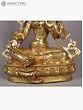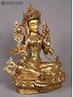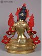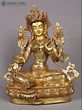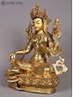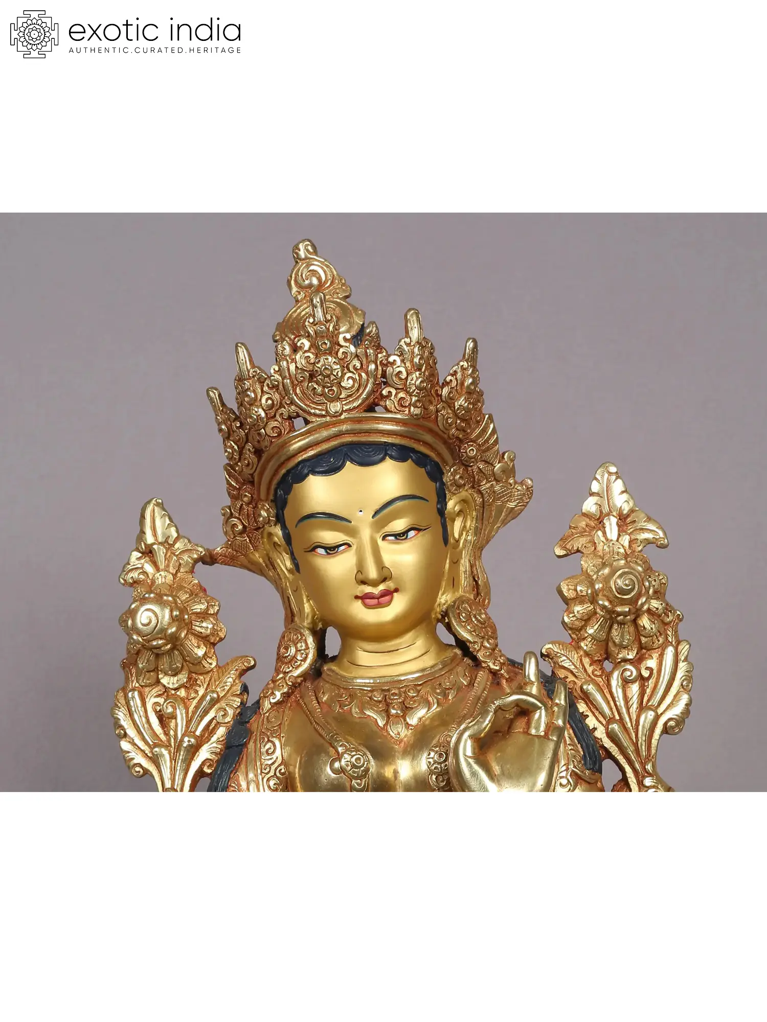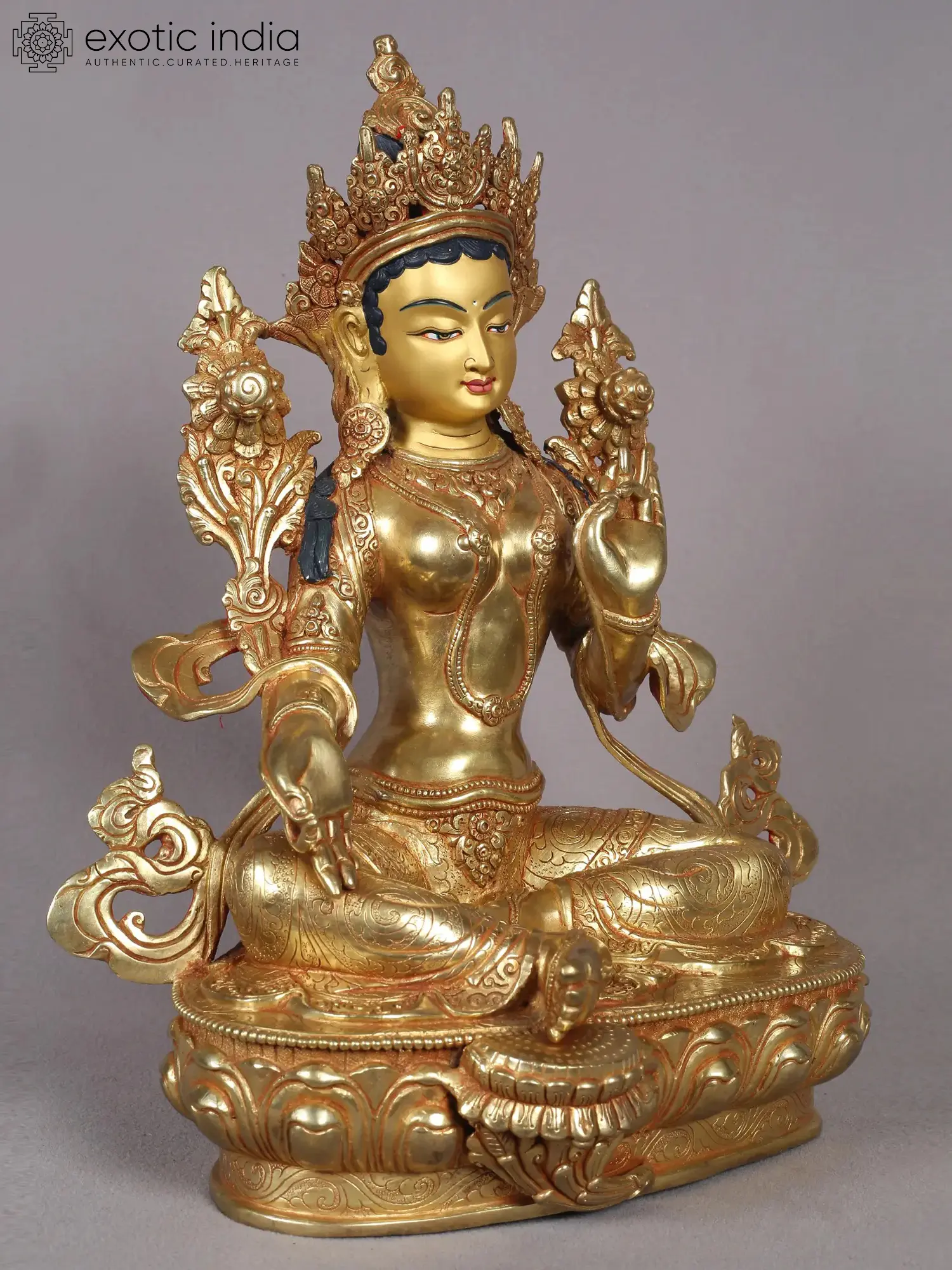 Tara's right hand is extended in the Varada Mudra, a gesture of giving and granting sublime realizations. Her left hand is positioned with all fingers extended upward, except for her ring finger, which touches the tip of her thumb, known as the Vitarka Mudra. This mudra can represent the Three Jewels (Sangha, Dharma, Buddha) or the act of giving refuge.