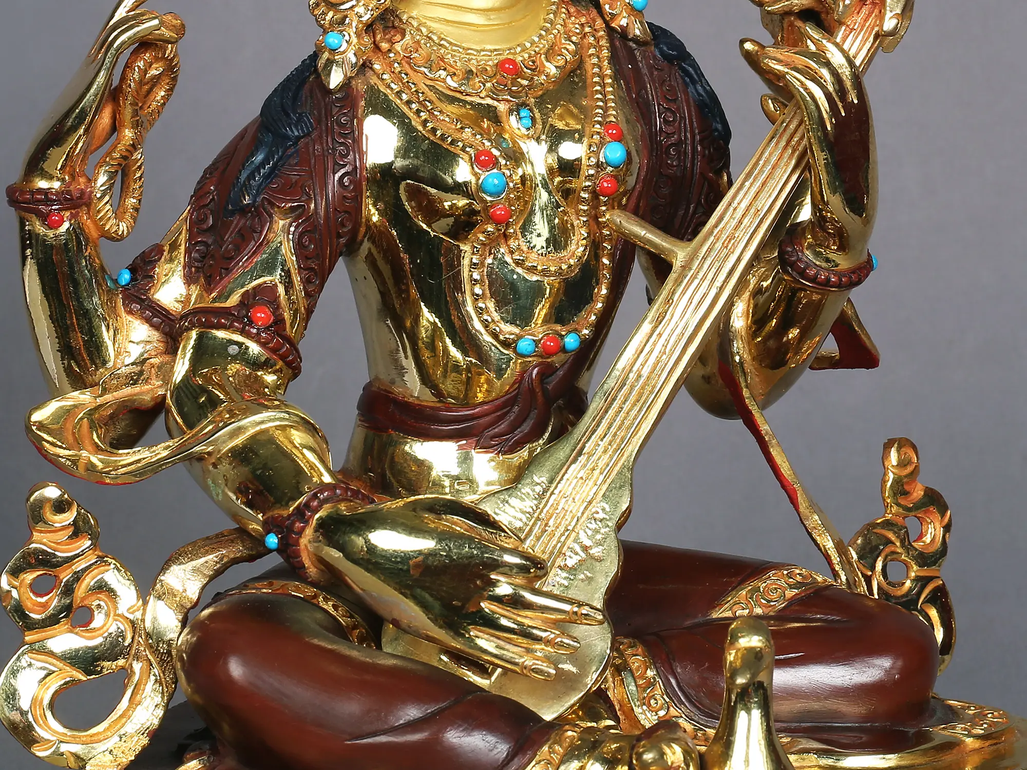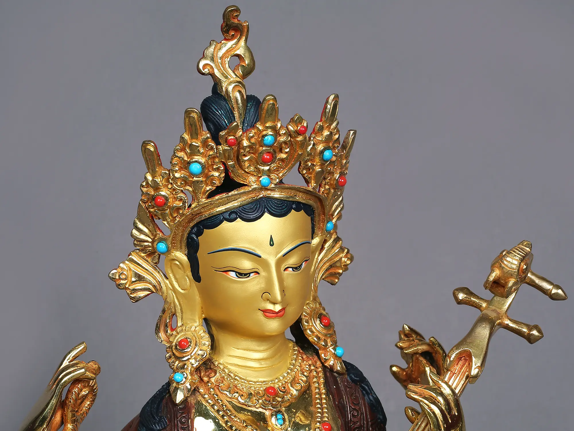 This exquisite statue depicts Goddess Saraswati, the Hindu deity of knowledge, music, arts, wisdom, and nature. Crafted with meticulous detail in Nepal, this piece is a testament to the rich artistic traditions of the region. The use of copper as the base material provides a sturdy and enduring form, while the luxurious gilding with pure gold imbues the statue with a divine radiance. The intricate carvings and the liberal application of precious blue and red stones, resembling turquoise and coral, add vibrant accents and enhance the overall opulence of this sacred representation.
