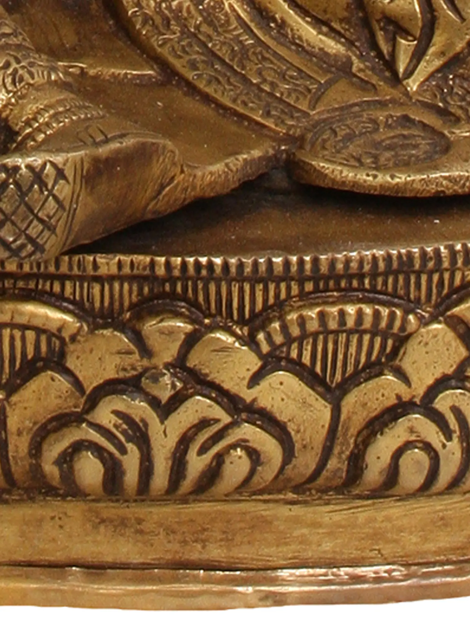 This striking statue is a testament to the rich artistic traditions of India, where it has been meticulously handcrafted by skilled artisans. The use of brass, a material known for its durability and ability to capture fine details, lends a timeless quality to the artwork. The vibrant golden hue of the brass evokes the radiant nature of the deity and adds to the statue's majestic appeal. Seated upon a richly decorated lotus base, a symbol of purity and spiritual unfolding, this representation of Guru Padmasambhava is designed to inspire devotion and contemplation. The dynamic posture and the symbolic accoutrements further enhance its spiritual resonance, making it a powerful addition to any altar or sacred space. This piece serves as a reminder of the enduring legacy of Guru Rinpoche and his transformative influence on the spiritual landscape.