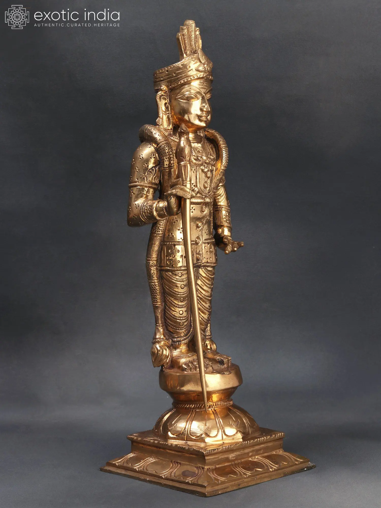 Here, Lord Karttikeya has been depicted as a youthful god, dressed as a warrior, carrying the weapon called Vel. The Vel was given to Kartikeya by Goddess Parvati as a powerful weapon to defeat the demons. Crafted in Panchaloha bronze from “Swamimalai” using the ancient “Madhuchista Vidhana (Lost-Wax) technique”, this artwork Kartikeya’s divine purpose—to uphold righteousness, dispel darkness, and protect the cosmic order