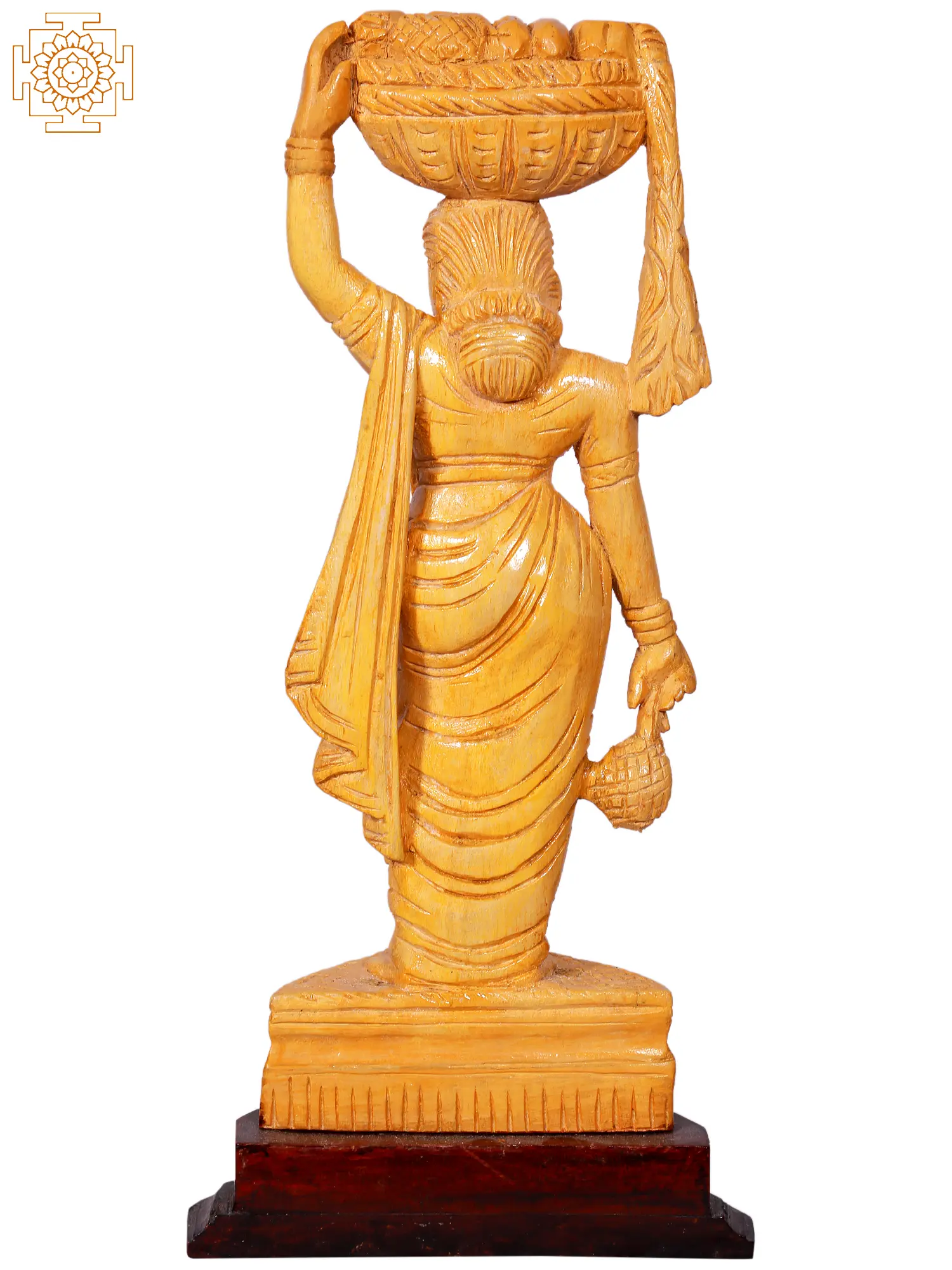 This exquisite wooden statue captures the essence of a woman engaged in a timeless act of service and sustenance. Carved with remarkable detail from light-colored wood, it portrays a graceful lady standing tall, a bountiful basket balanced expertly on her head. The intricate depiction of her traditional attire, with flowing fabrics and delicate jewelry, speaks to a rich cultural heritage and an appreciation for fine craftsmanship. The lady's posture is one of quiet strength and poise. Her serene facial expression, coupled with the gentle curve of her shoulders, suggests a sense of purpose and fulfillment in her daily task. In her left hand, she delicately holds a smaller item, perhaps a fruit or a bundle of herbs, adding another layer of narrative to the piece. The basket itself is a testament to the artisan's skill, rendered with a textured finish that evokes the natural weave of its material and is brimming with a generous harvest.