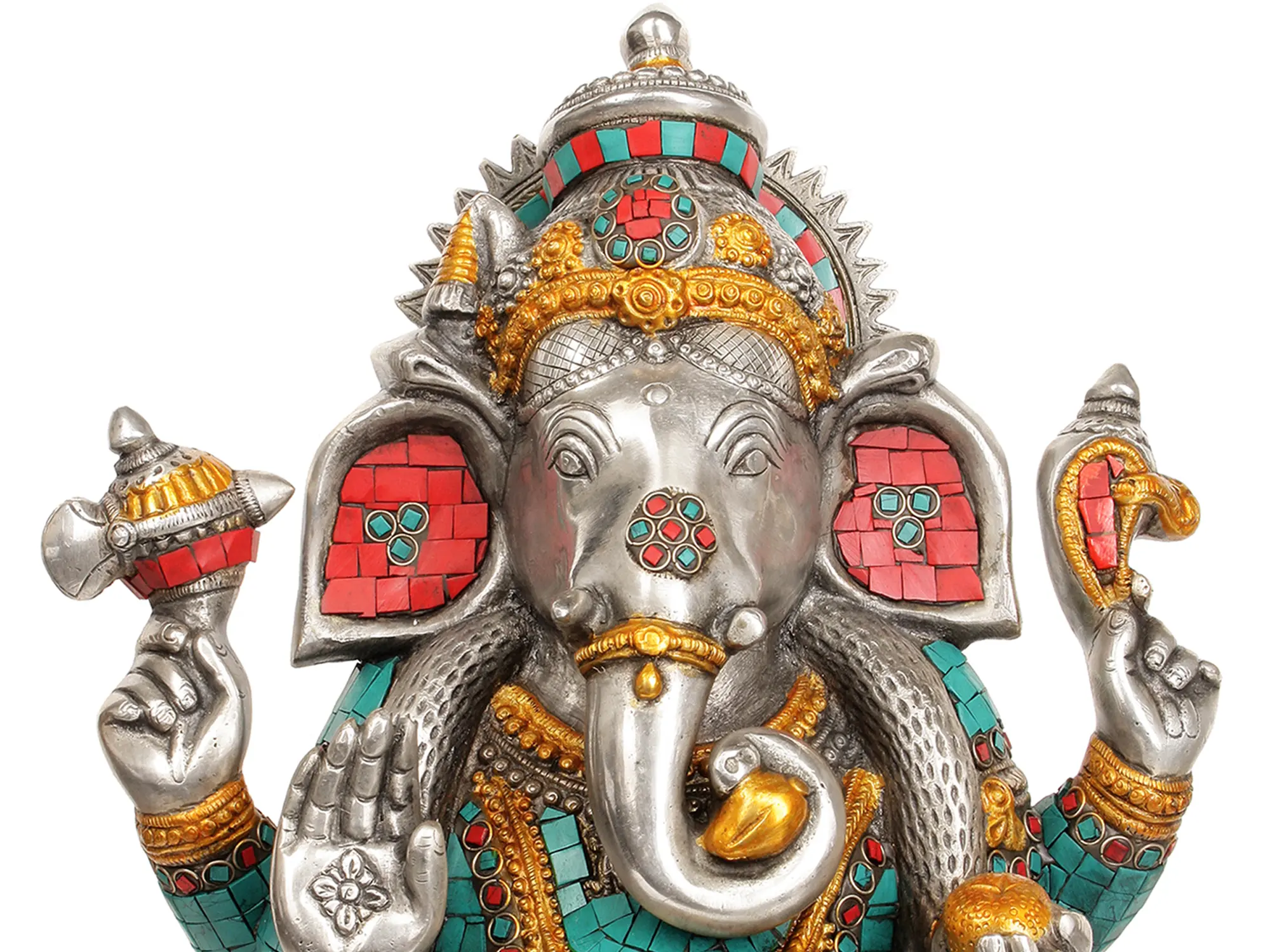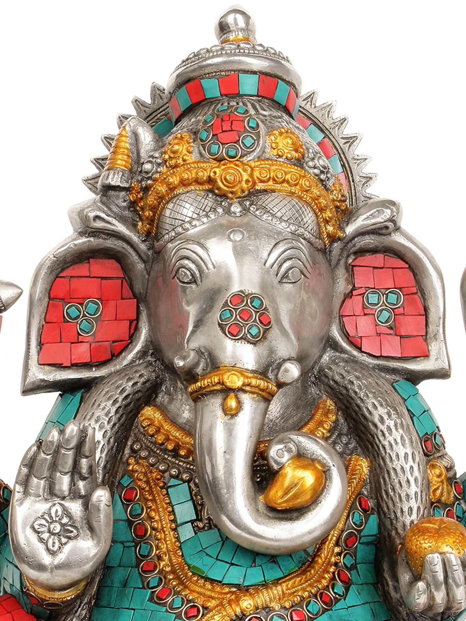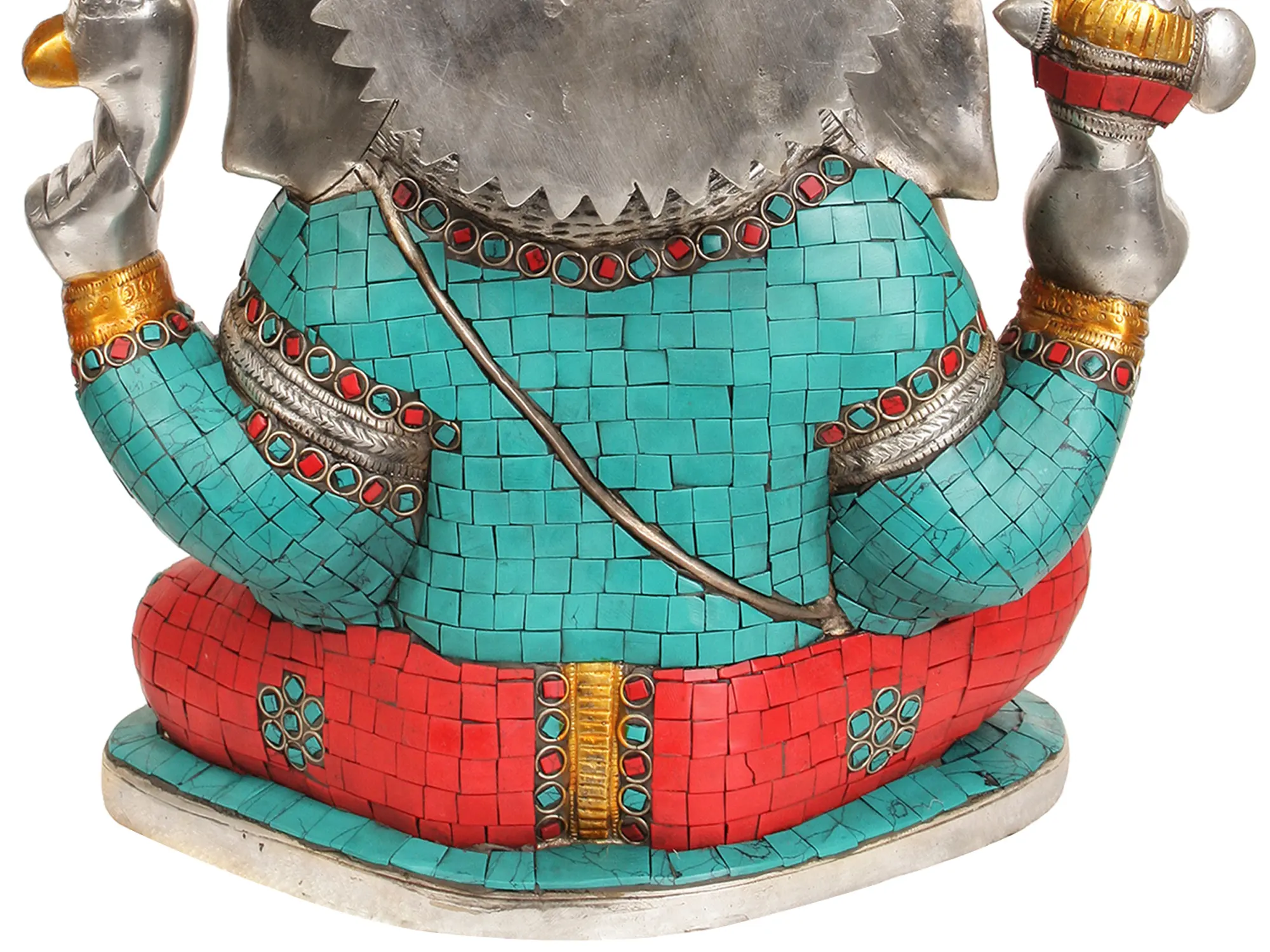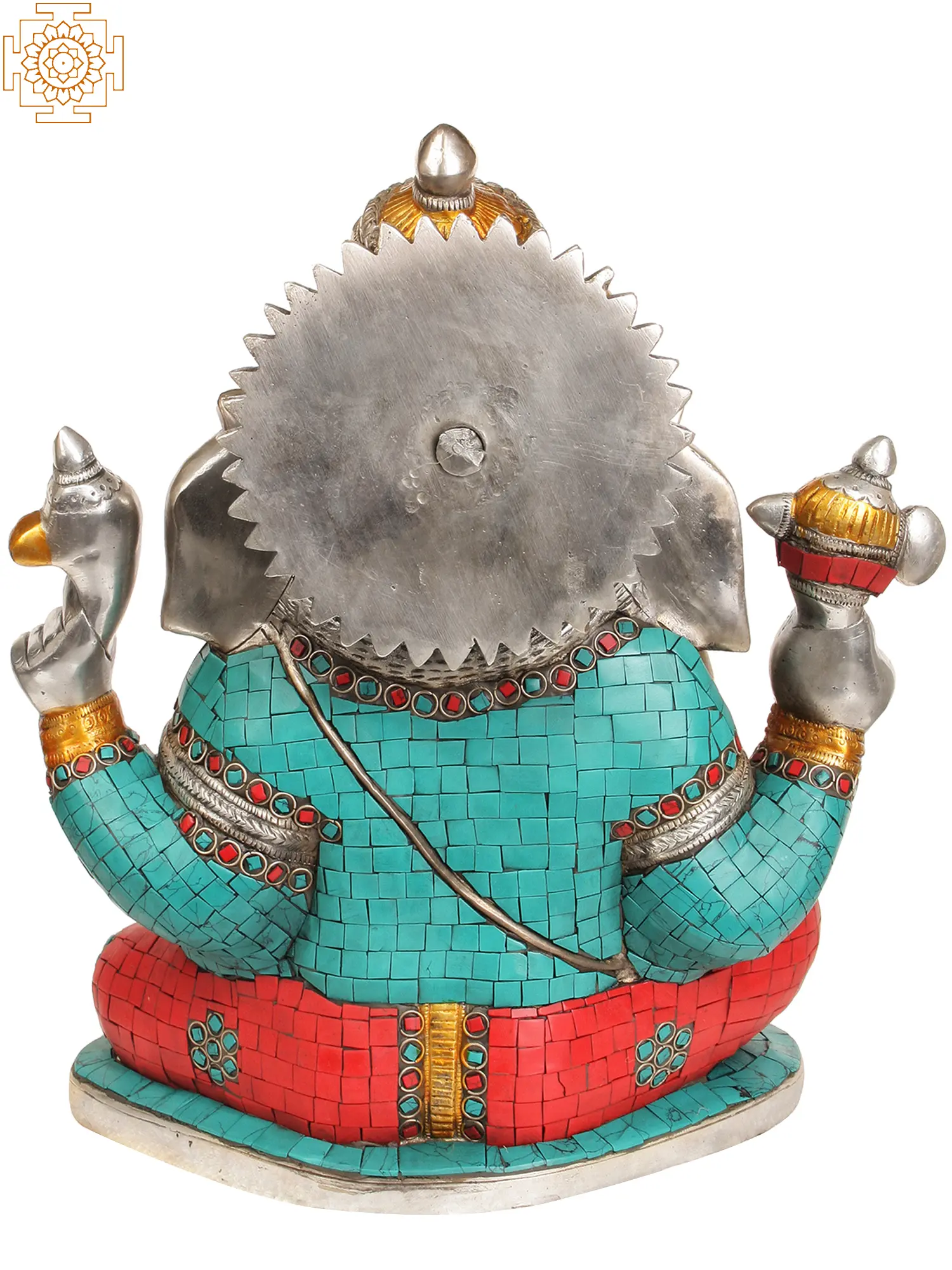 13" Lambodara Ganesha in Silver Hue with Coral and Turquoise Color Inlay In Brass
