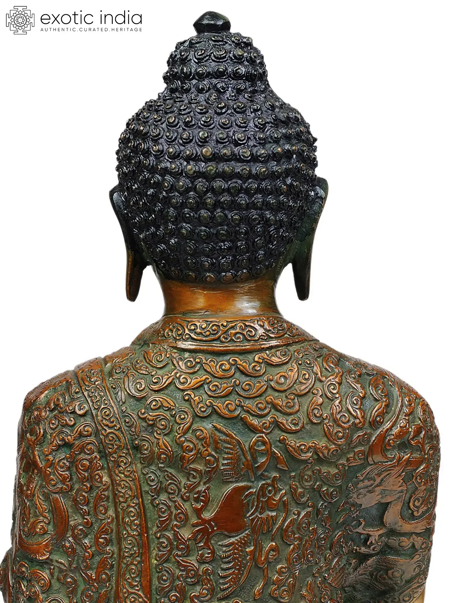This brass statue portrays the Bhumisparsha Mudra, meaning "touching the earth." Buddha called the earth goddess Sthavara to bear witness to his enlightenment at this moment. In this example, the sculpture is made of brass and has a regal aspect owing to a great gold shine. The statue glows as if enlightenment is emanating from Buddha's thoughts. The finely carved robe with clouds and Tibetan snow lions is the most remarkable feature of this statue. This cryptic monument asks us to accept the transitory essence of life, to find peace in the midst of chaos, and to seek enlightenment in the midst of life's shadows.