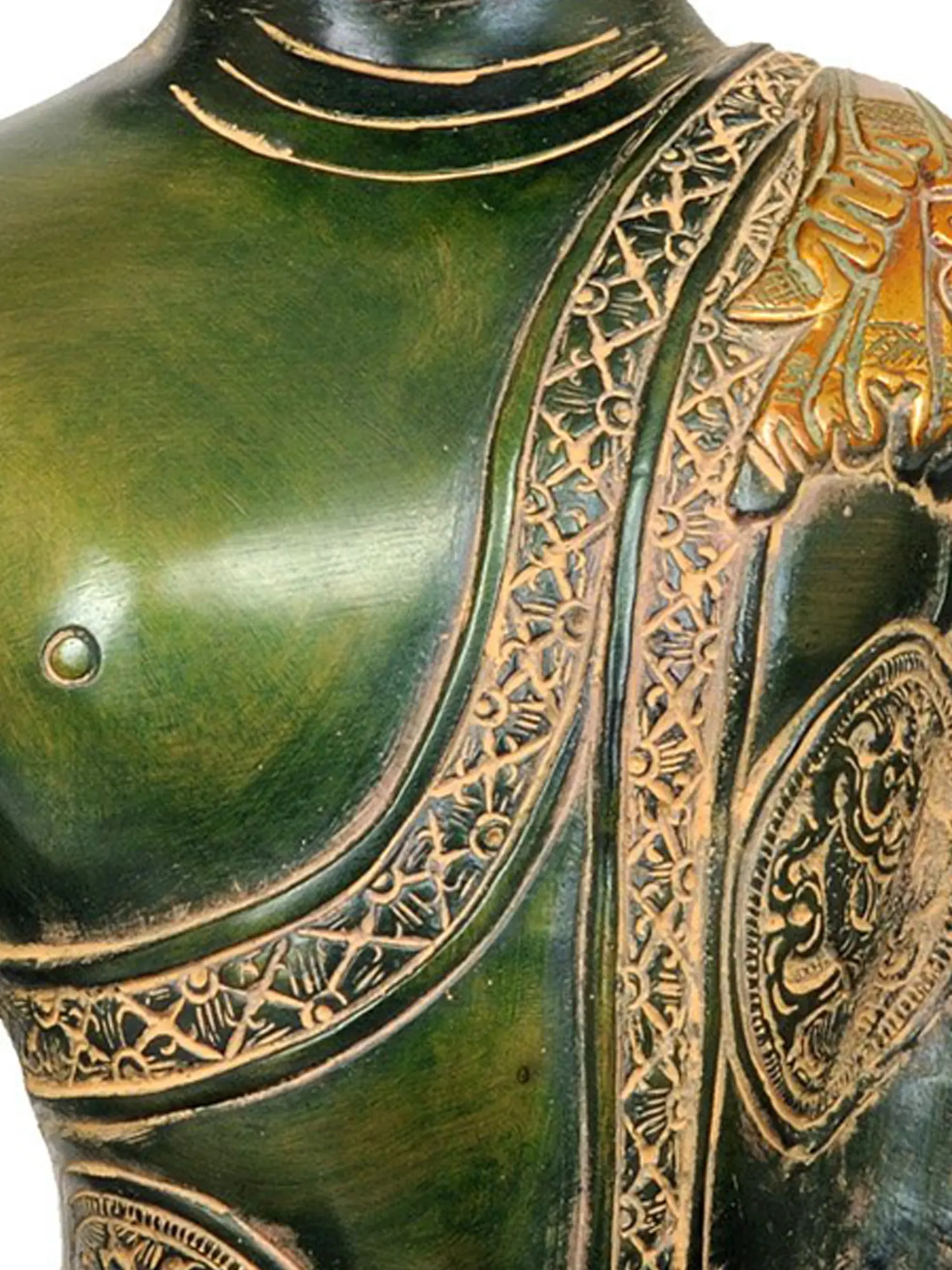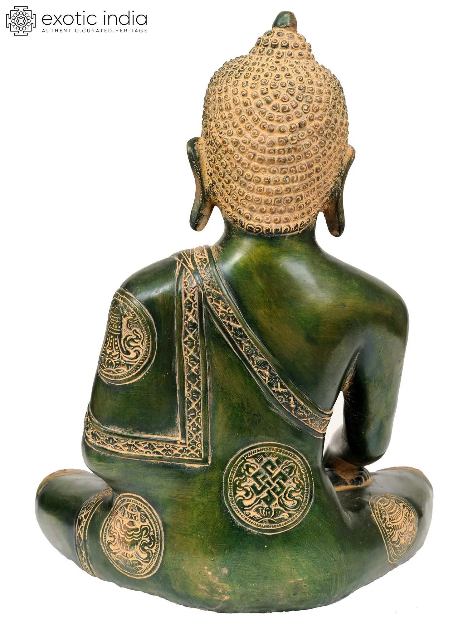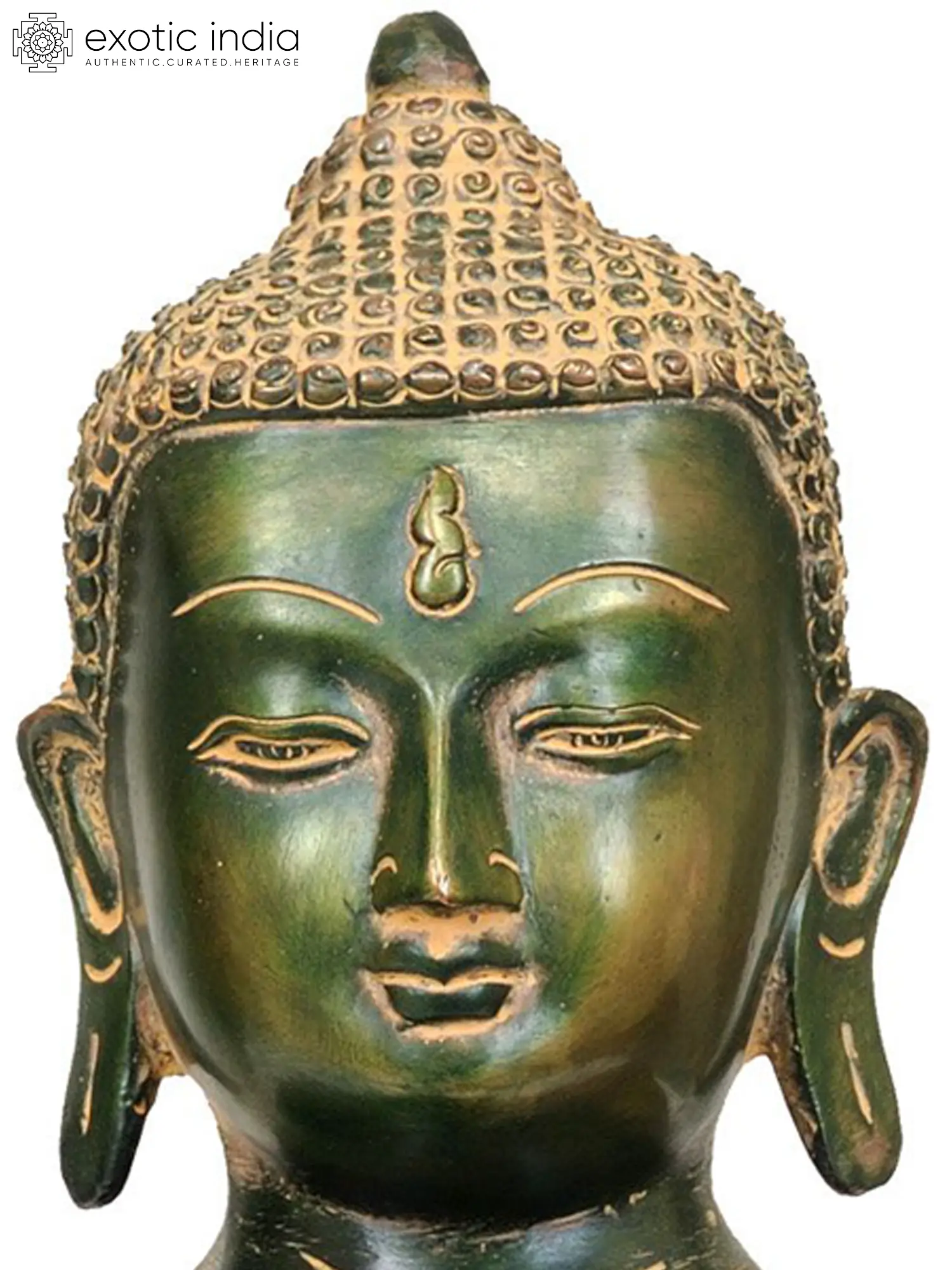 This exquisite brass statue captures the serene presence of Lord Buddha, a figure revered across the globe for his teachings on compassion, wisdom, and inner peace. Handcrafted in India, a land deeply imbued with Buddhist philosophy, this artwork is a testament to the enduring artistic traditions and spiritual devotion of its creators. The rich green patina, enhanced with intricate golden details, lends an aura of ancient wisdom and timeless beauty to the sculpture. ––––––––––––––––––––