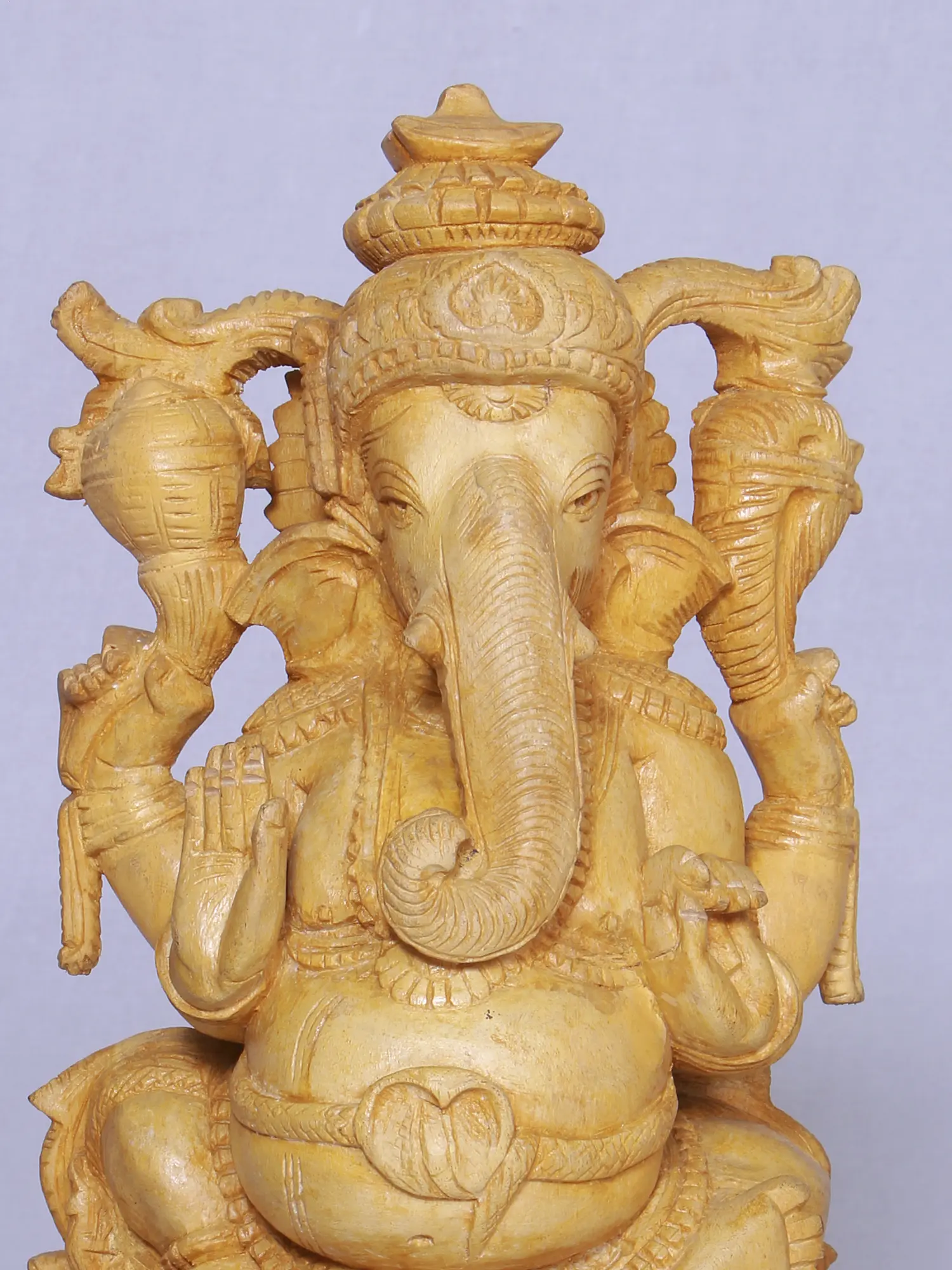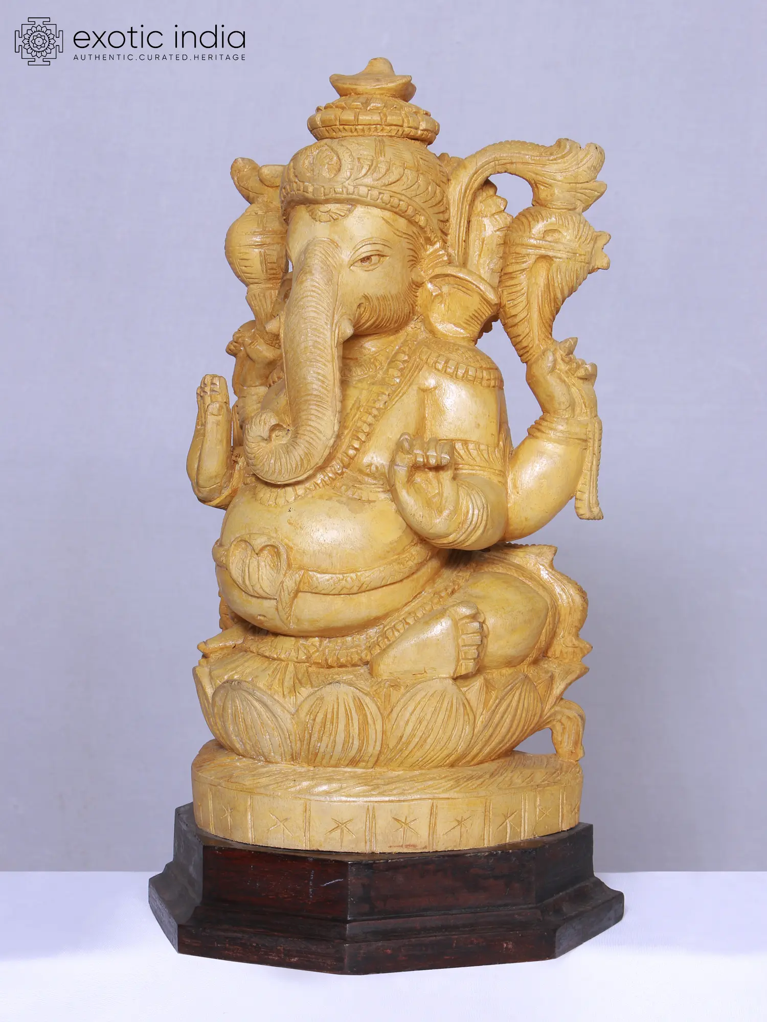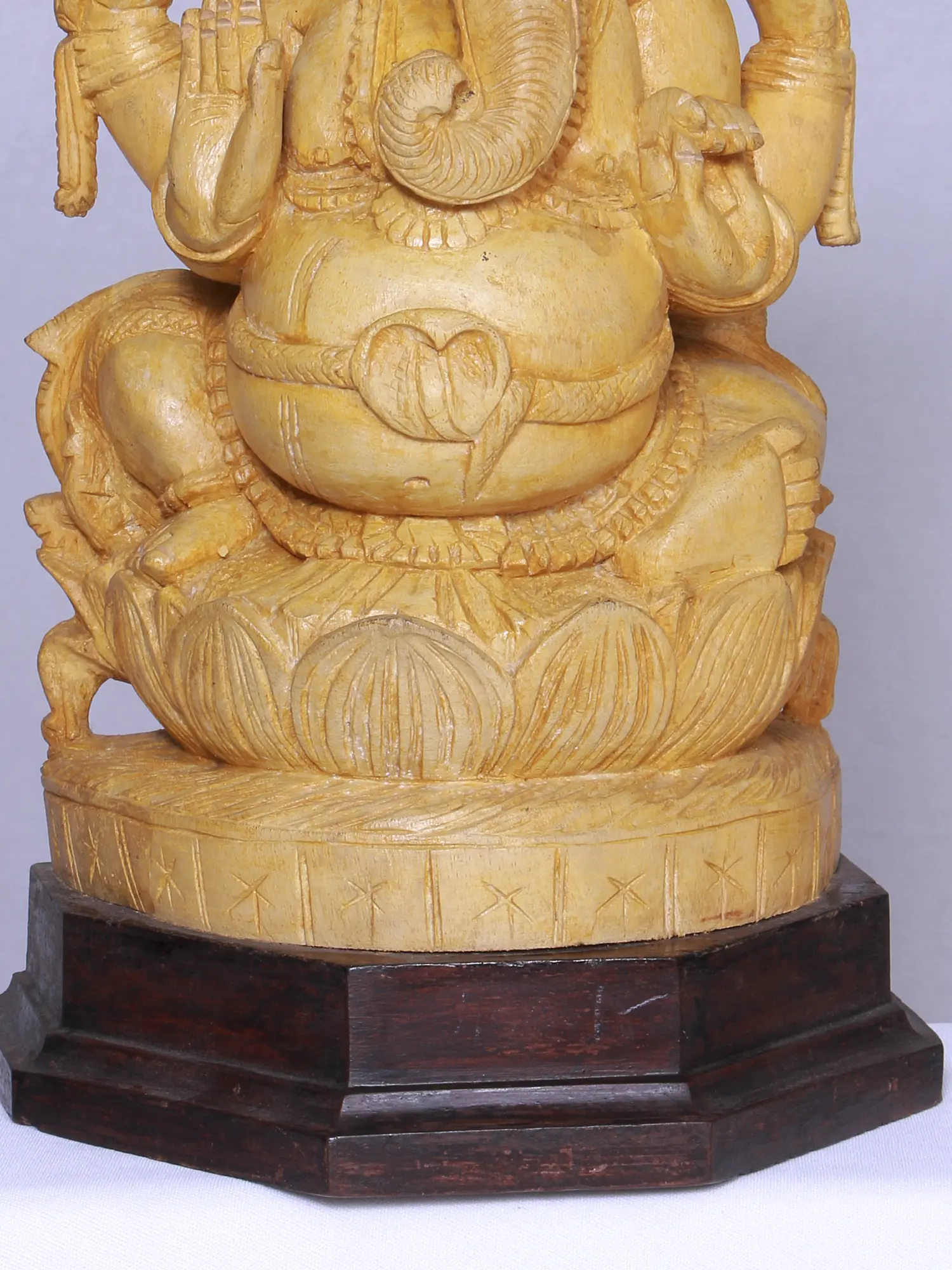 24" Chaturbhuja Lord Ganesha Seated on Lotus | Wood Carving