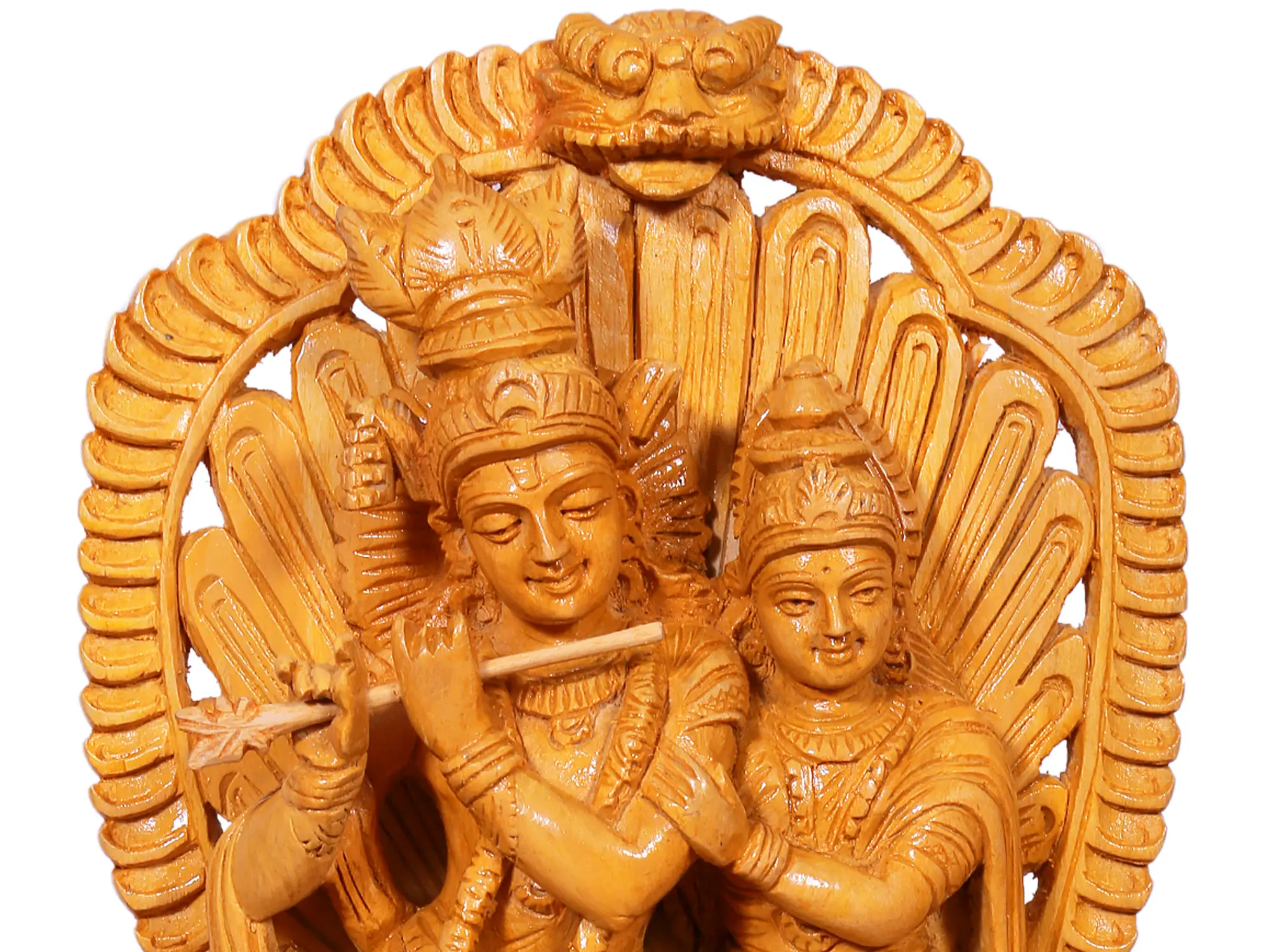 This exquisite wooden carving captures the essence of divine love and spiritual union, portraying Lord Krishna and his beloved Radha seated together on a magnificent throne. The intricate craftsmanship, rendered in warm, natural wood, speaks of dedication and artistic mastery, creating a piece that is both sacred and aesthetically captivating. The figures of Krishna, the divine flautist, and Radha, his devoted companion, are sculpted with delicate precision, their expressions serene and full of devotion.