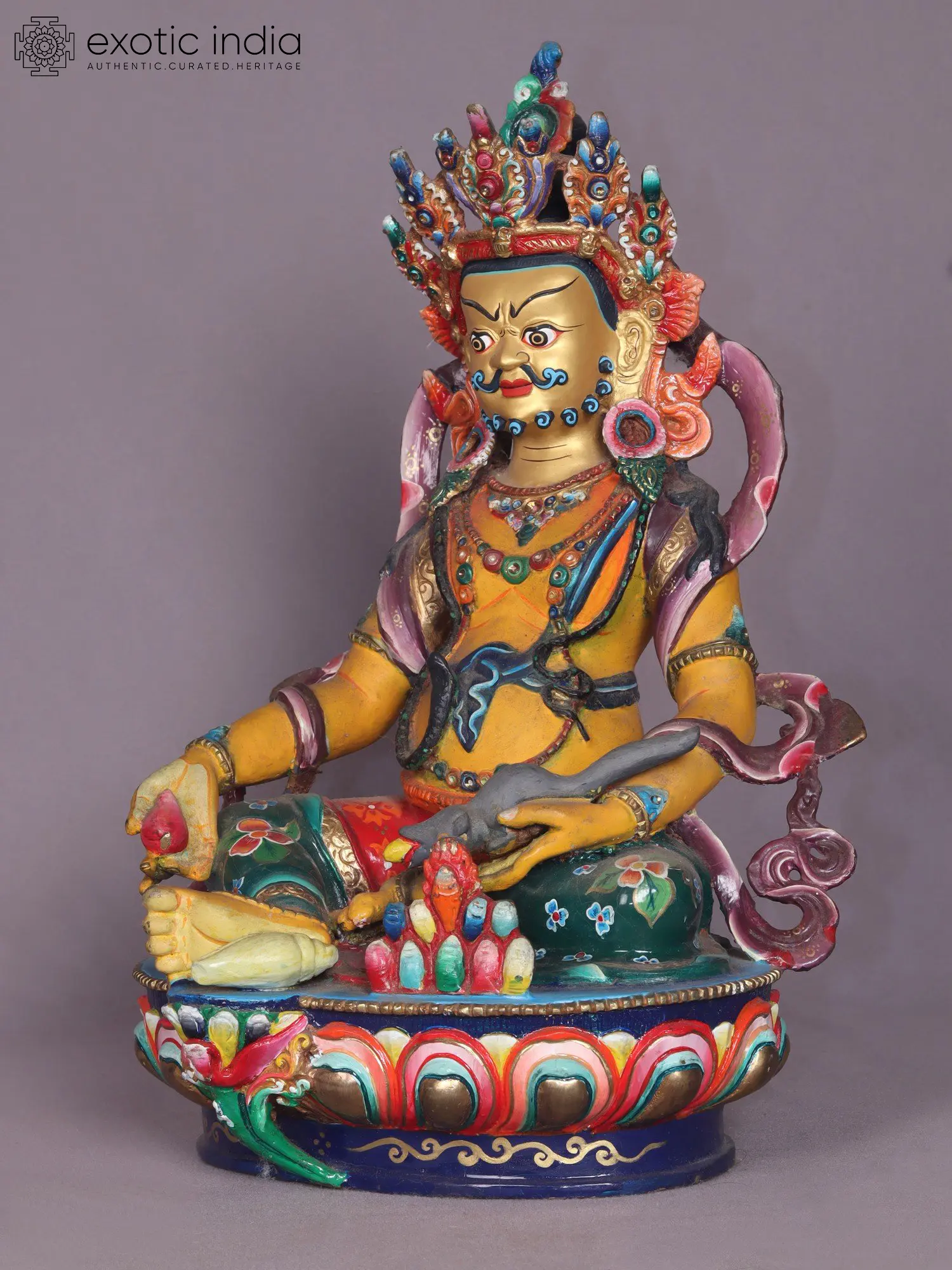 With a resplendent golden-yellow complexion, Kubera dons a semi-wrathful visage as he assumes the lalitasana, a relaxed seated posture, atop a moon disc perched upon a lotus pedestal. His right foot elegantly dangles, finding support in the lotus foundation. Kubera's right hand grasps a jambhara, while his left-hand cradles a substantial mongoose, traditionally believed to harbor an abundance of precious gems and jewels that can be released with a gentle squeeze. Draped around his neck, lengthy cascading necklaces with colorful gemstones, gracefully adorn his form, descending to his abdomen.
